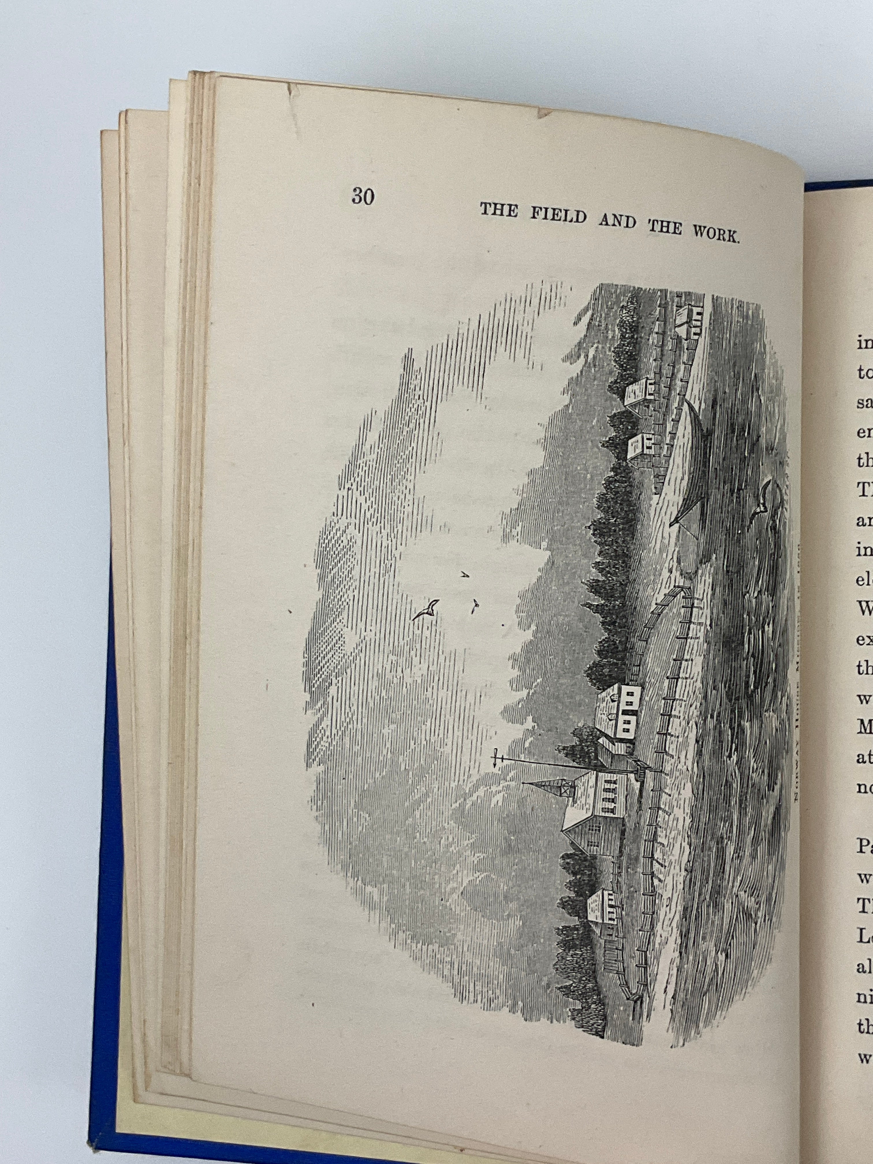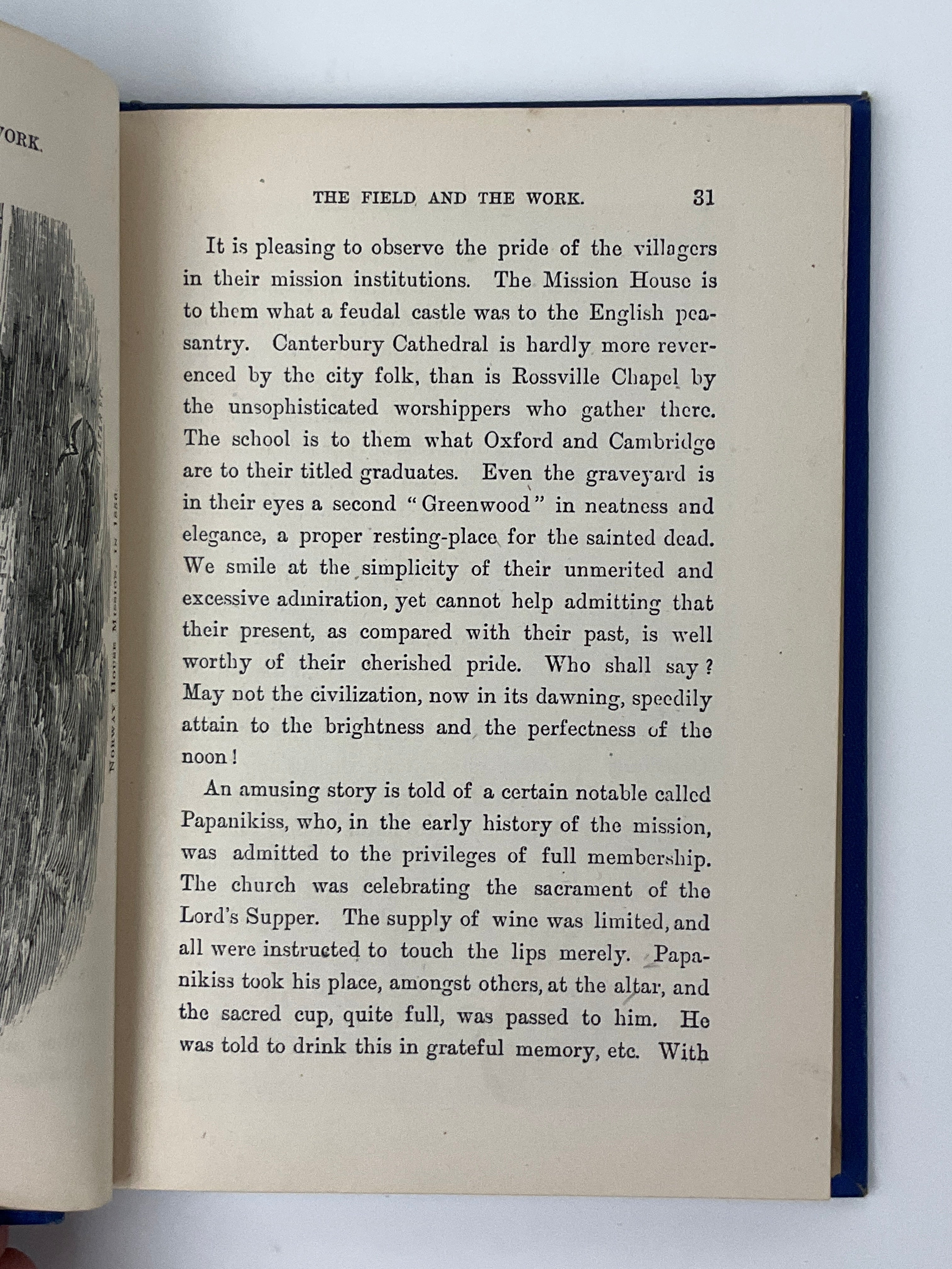 Presentation label of the Missionary Society of the Methodist Church of Canada affixed to front pastedown. Rear endpaper and pastedown stained; light staining to bottom fore-edge and corresponding margins. Top margin of pages 29–30 chipped with a small tear. Covers rubbed with light edgewear.