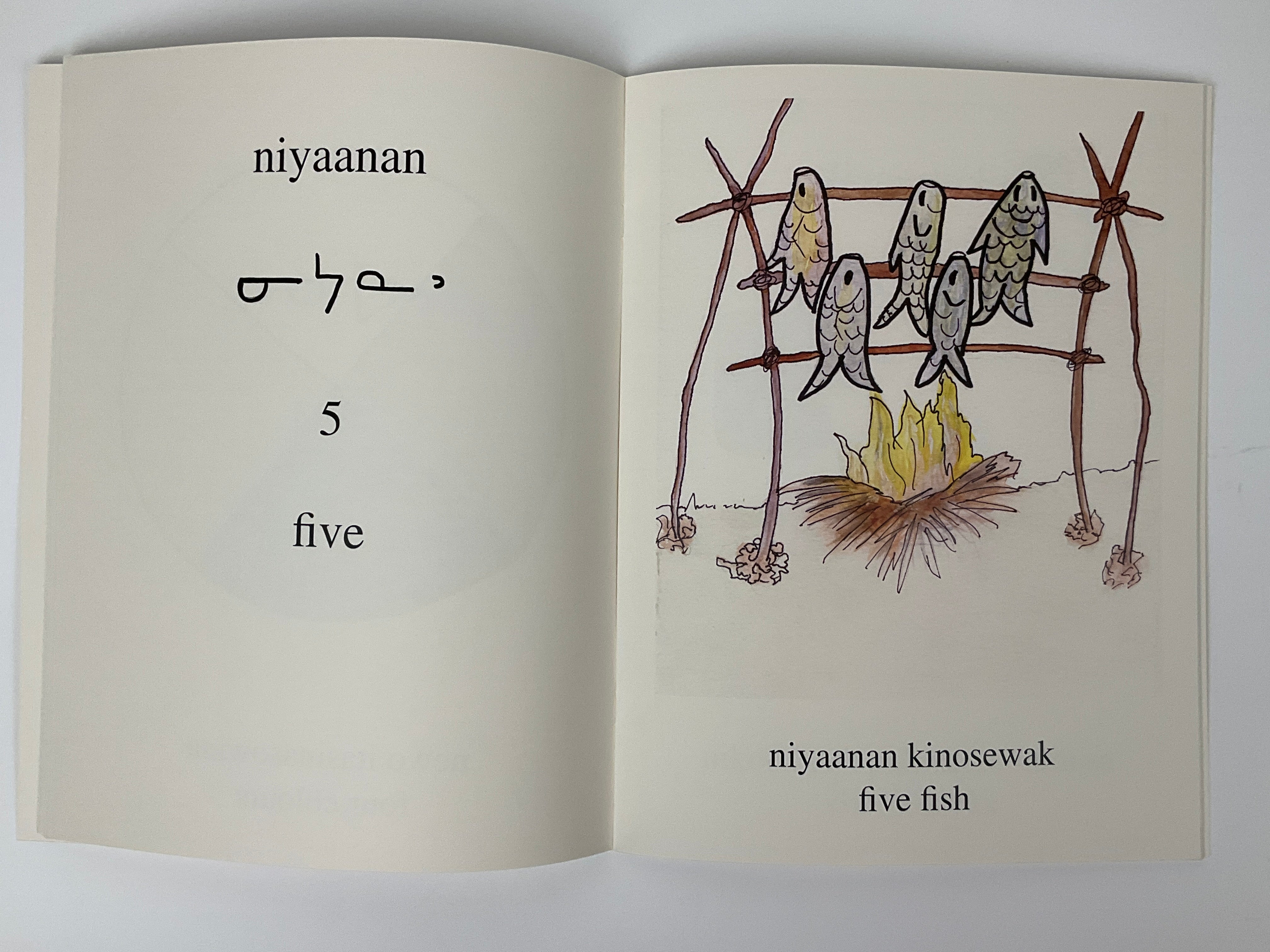 A slim, illustrated children’s book designed to teach the numbers one through thirteen in both Swampy Cree and English. An early-learning resource that blends language instruction with cultural connection.