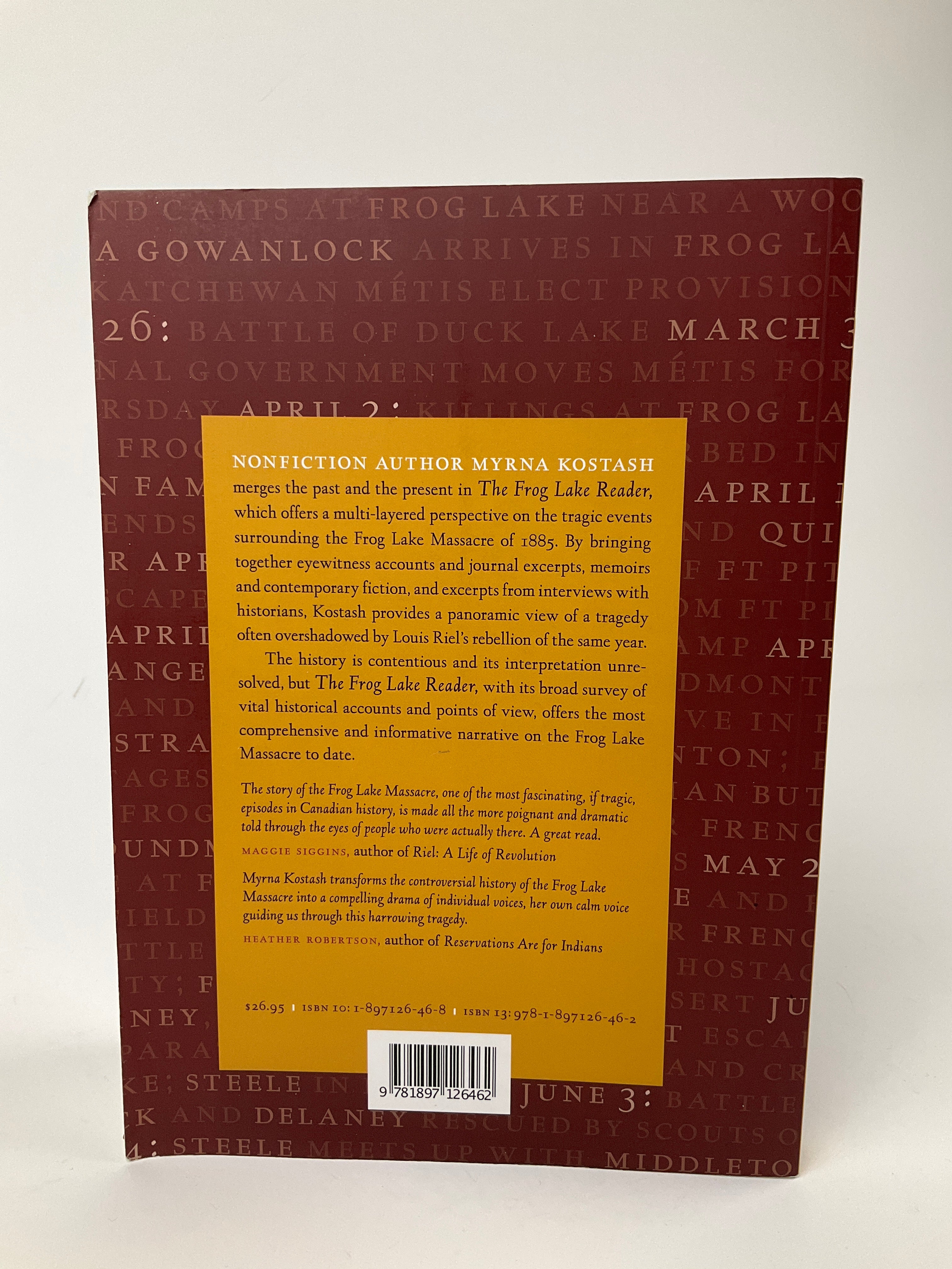 "... The Frog Lake Reader which offers a multi layered perspective on the tragic events surrounding the Frog Lake Massacre of 1885. By bringing together eyewitness accounts and journal excerpts, memoirs and contemporary fiction and excerpts from interviews with historians, Kostash provides a panoramic view of a tragedy often overshadowed by Louis Riel's rebellion of the same year.