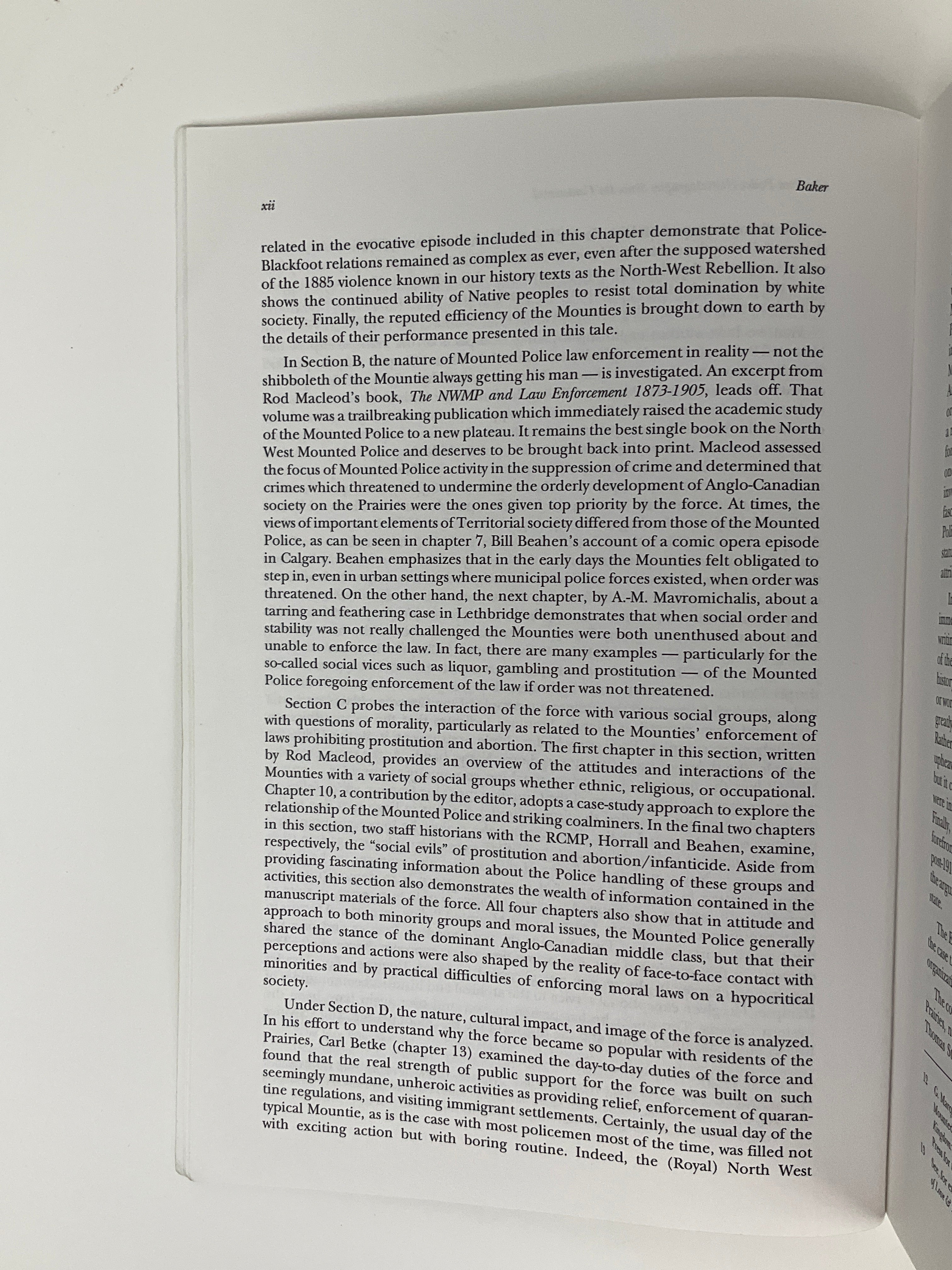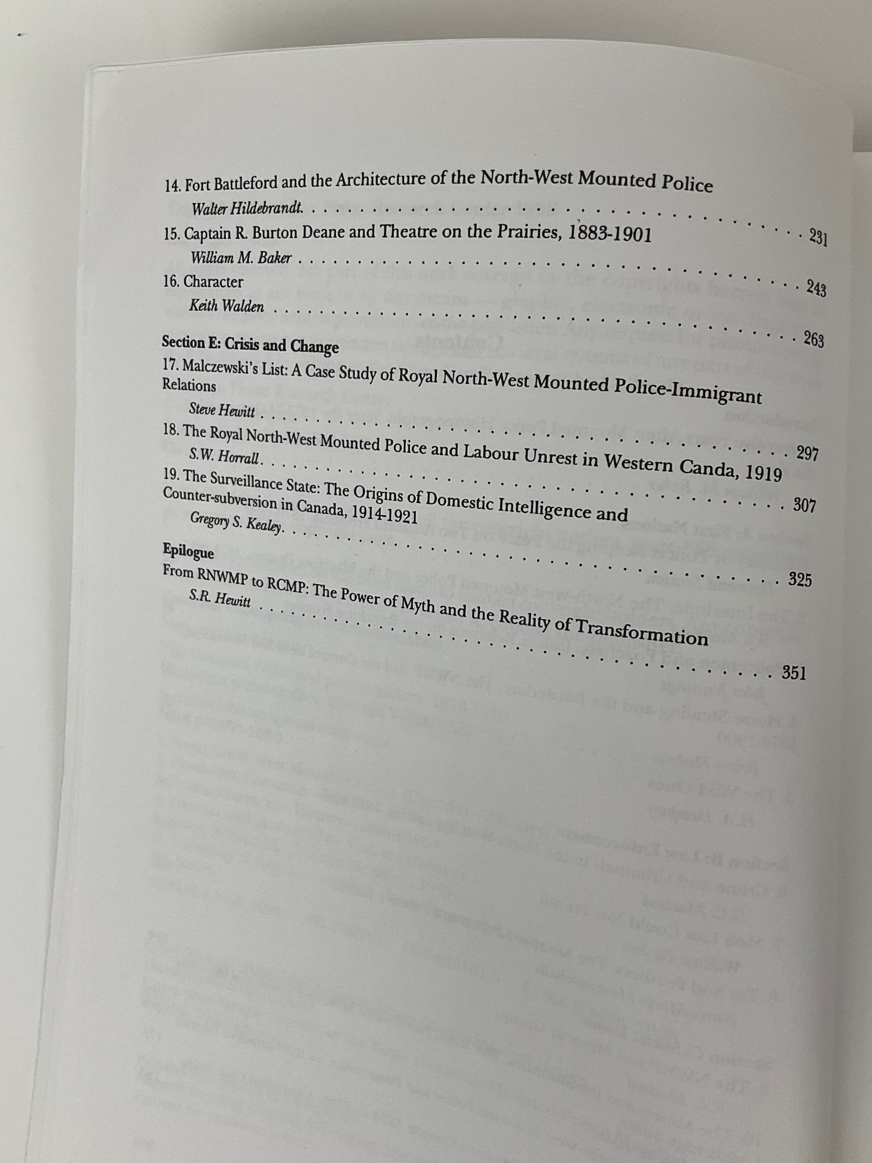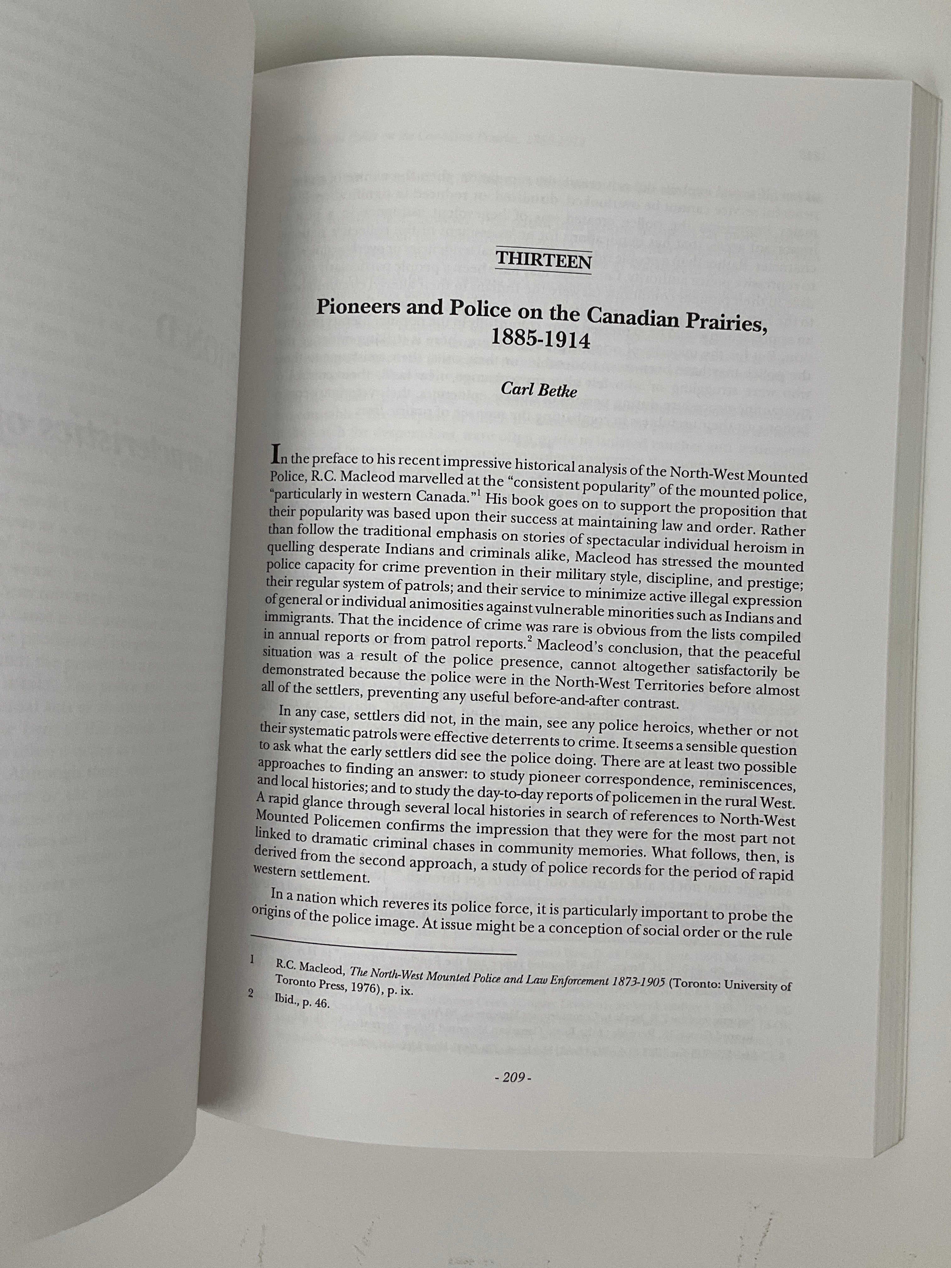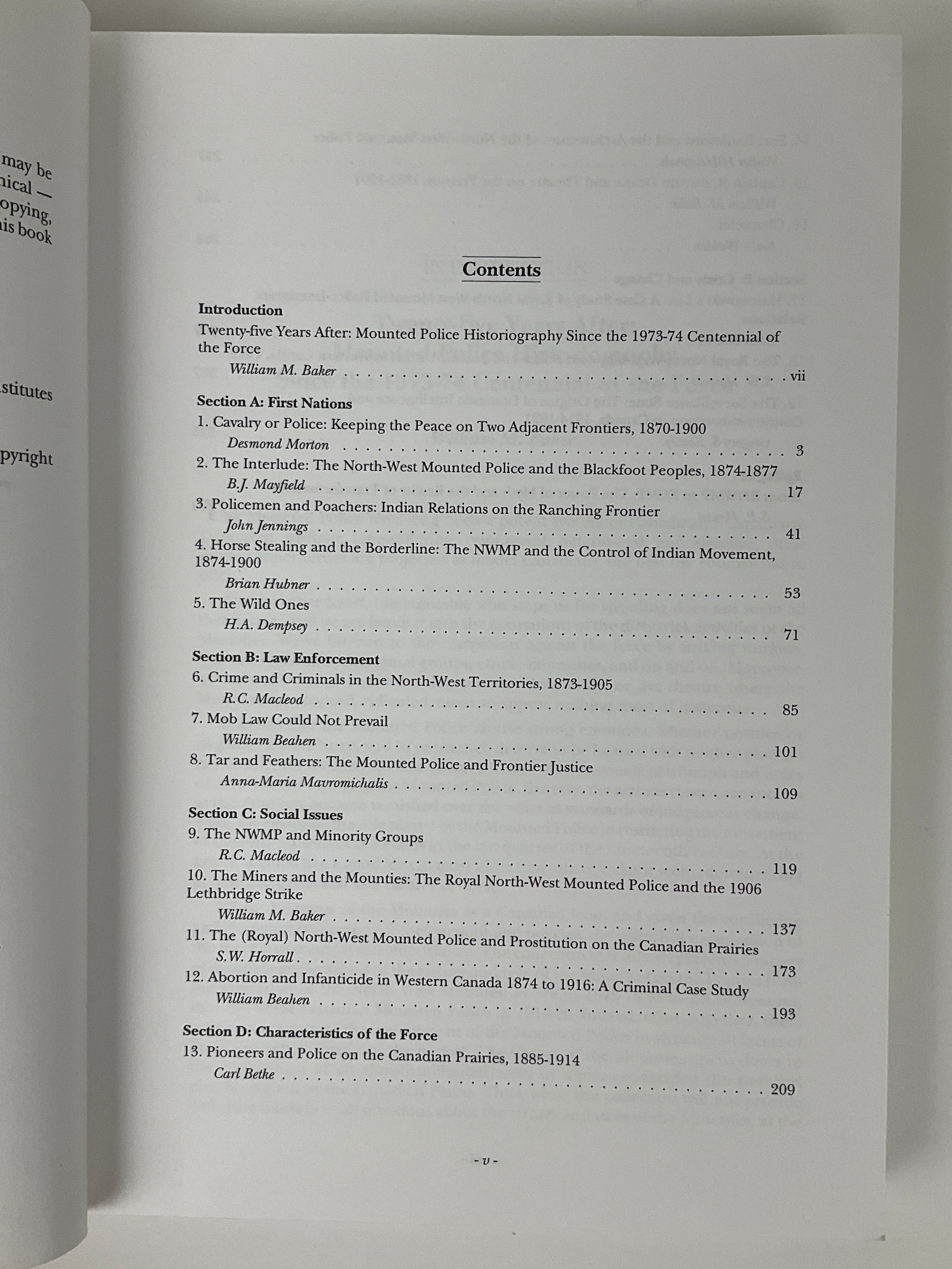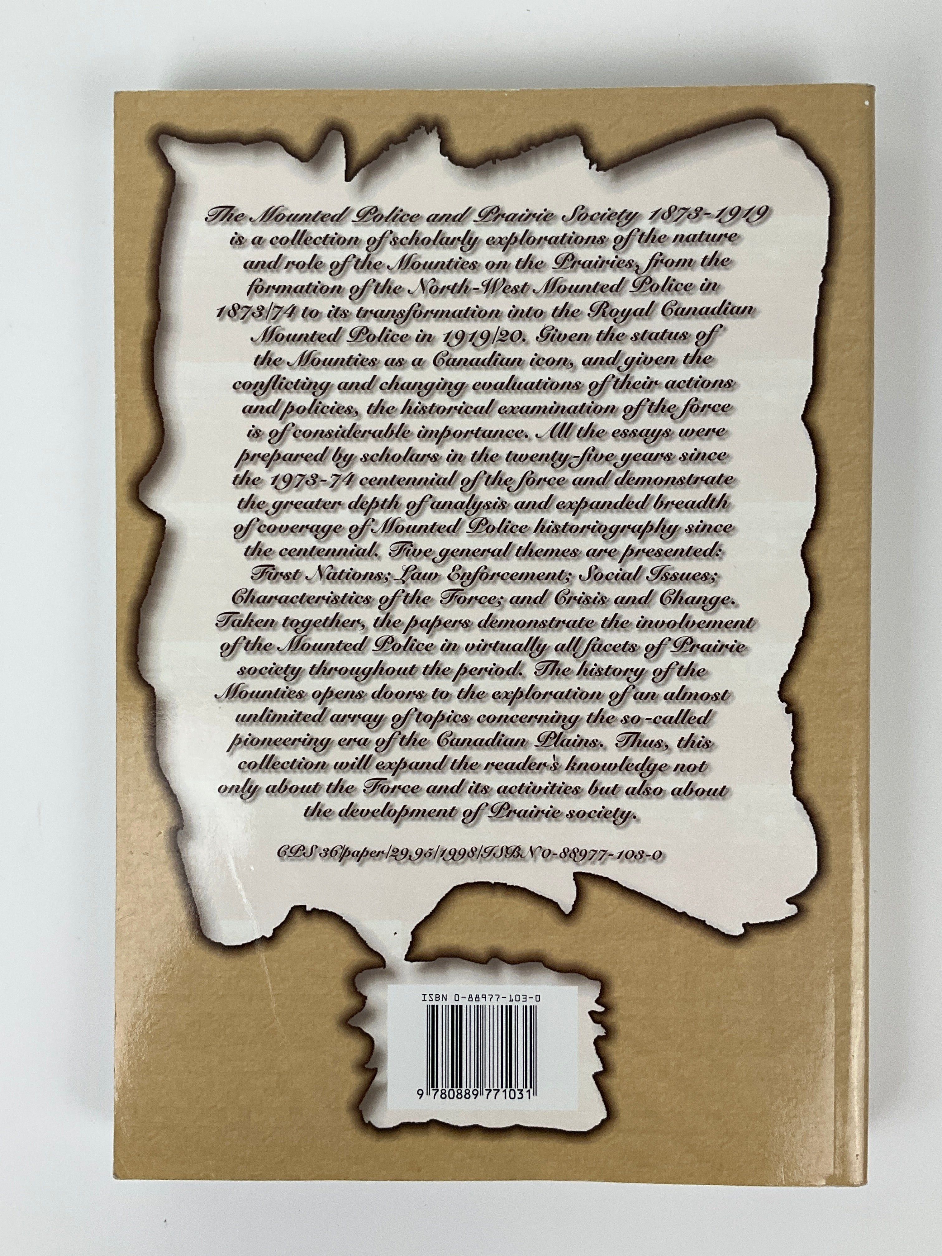 A scholarly anthology examining the role of the North-West Mounted Police—and later the Royal Canadian Mounted Police—in shaping prairie society from 1873 to 1919. The Mounted Police and Prairie Society, edited by William M. Baker, brings together previously published papers by students, historians, and academics, exploring the force’s involvement in the legal, social, and cultural life of Western Canada.