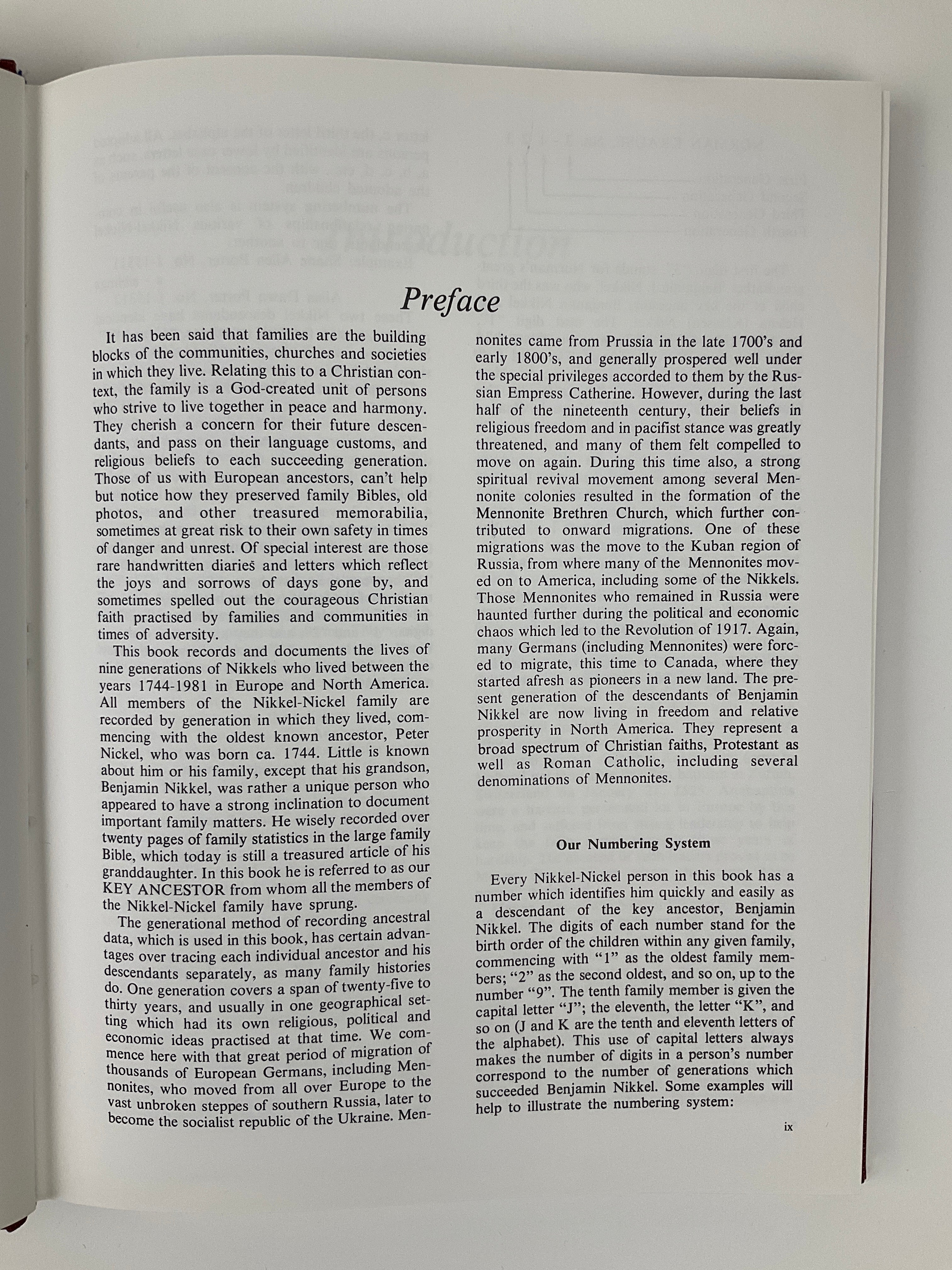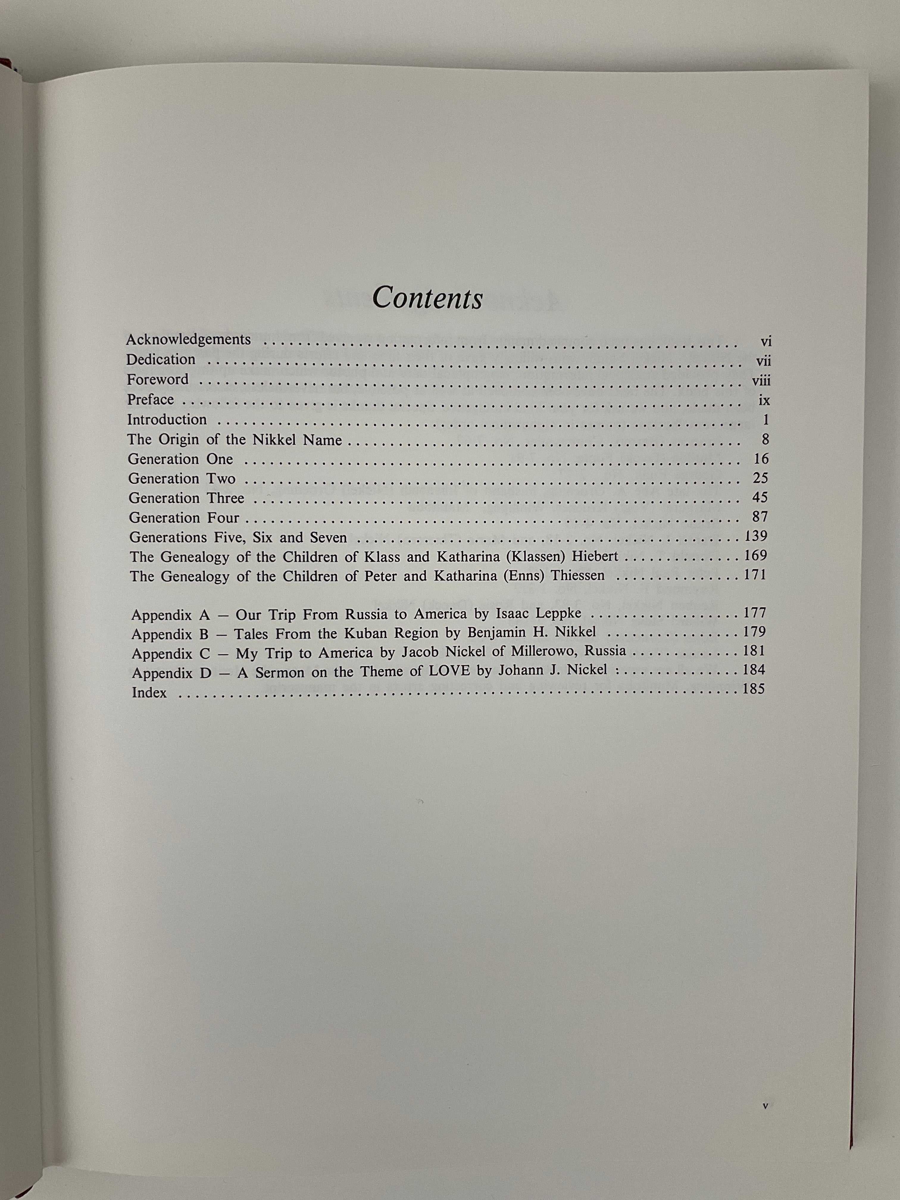 This volume "records and documents the lives of nine generations of Nikkels who lived between the years 1744-1981 in Europe and North America. All members of the Nikkel-Nickel family are recorded by generation in which they lived, commencing with the oldest known ancestor, Peter Nickel, who was born ca. 1774. Little is known about him or his family, except that his grandson, Benjamin Nikkel, was rather a unique person who appeared to have a strong inclination to document important family matters. He wisely recorded over twenty pages of family statistics .... In this book he is referred to as our KEY ANCESTOR from whom all he members of the Nikkel-Nickel family have sprung." Includes an Index of Names - of the descendants of Benjamin Nikkel.