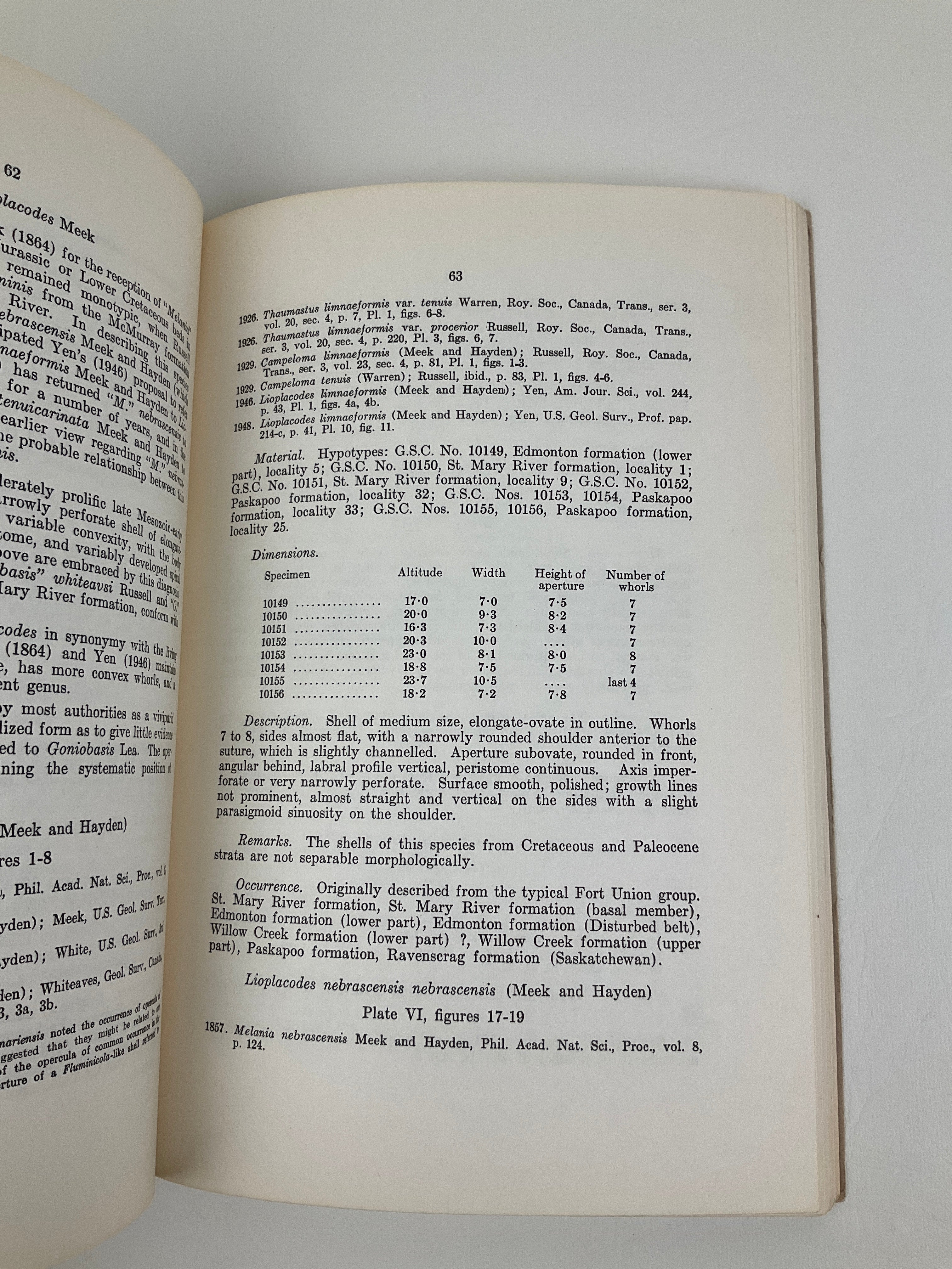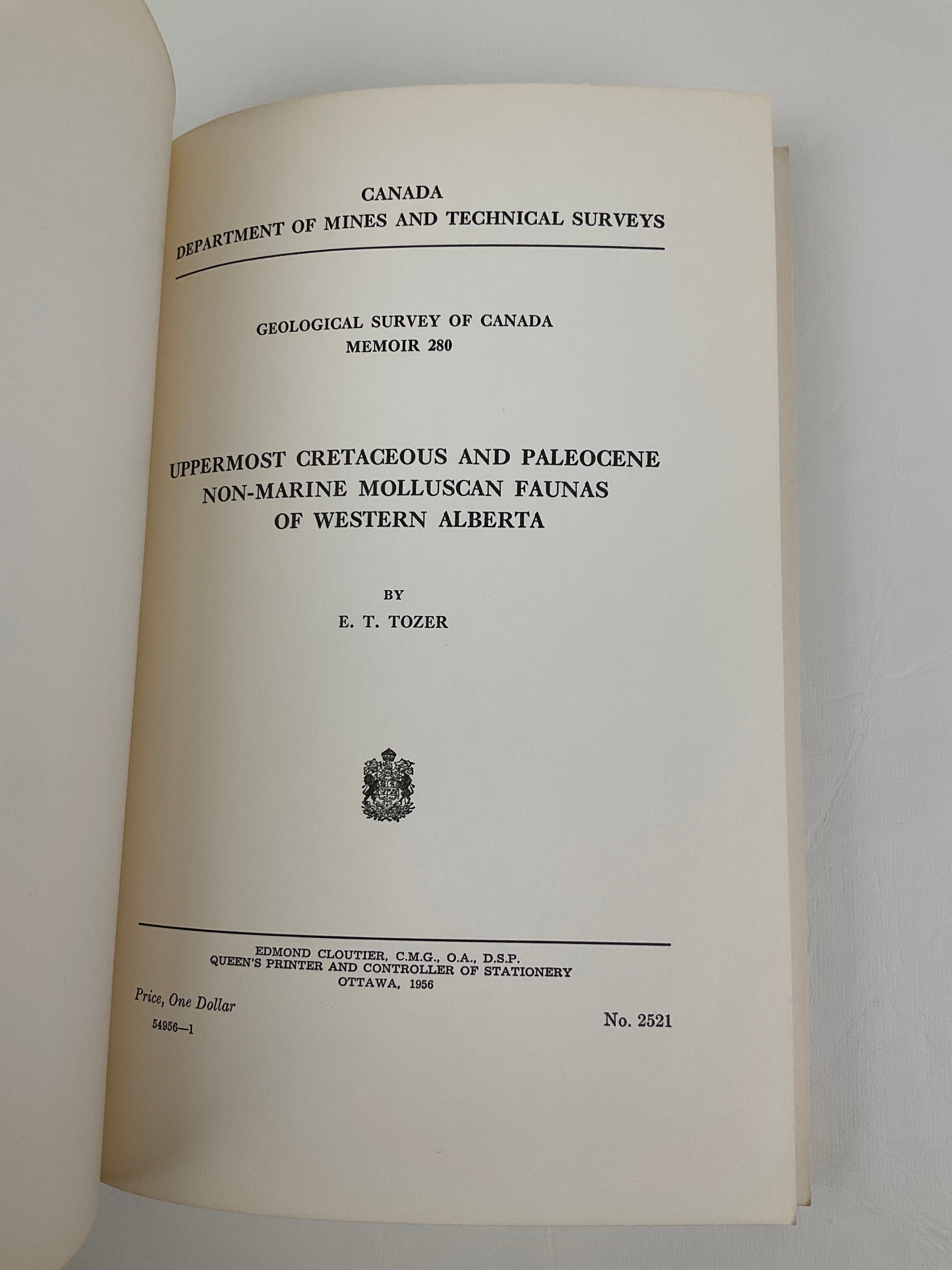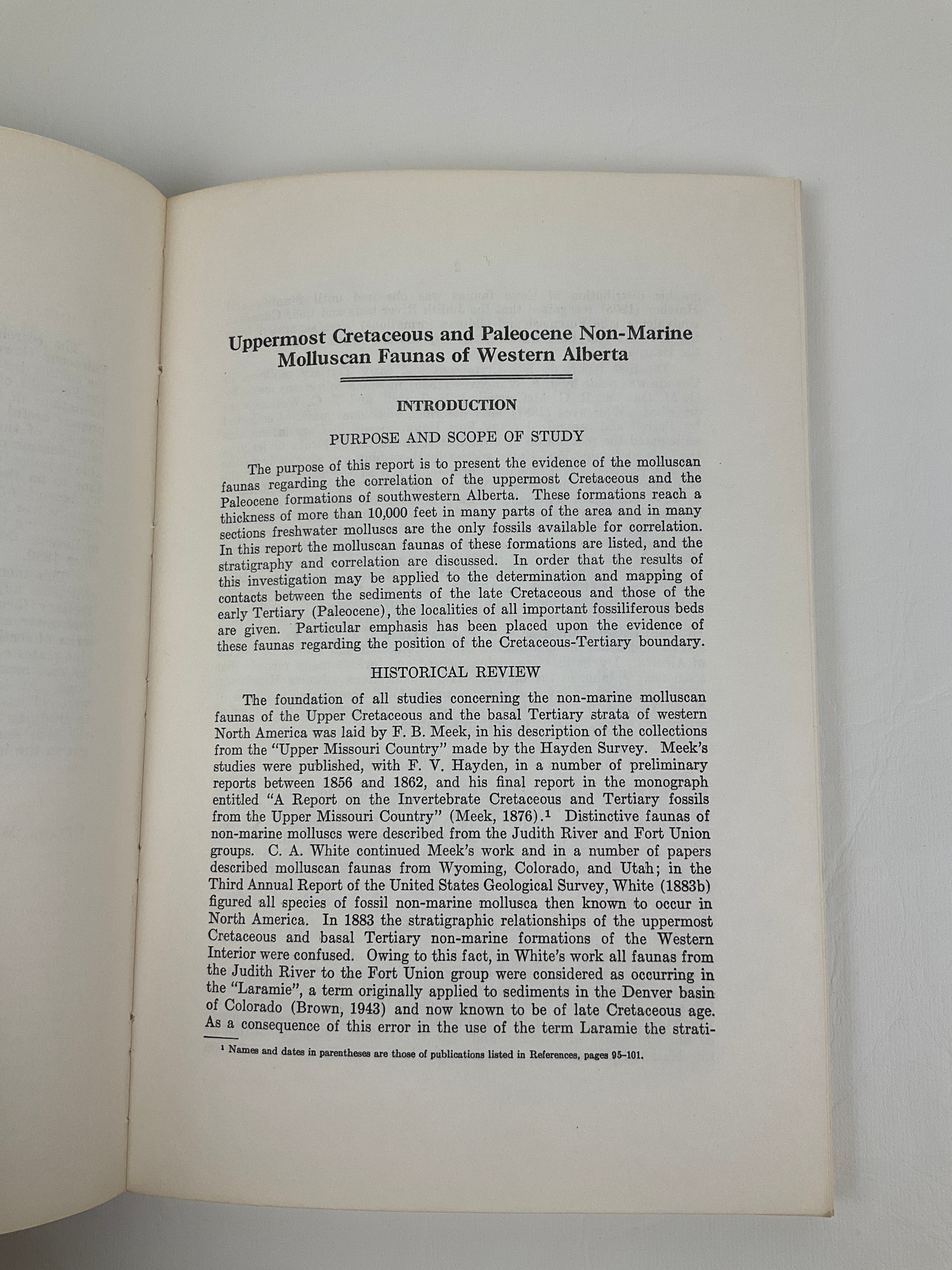 George Hanson, Director, Geological Survey of Canada writes in the Preface "... This memoir summarizes particularly the results of the study of the sediments adjoining the contact between the latest Mesozoic and earliest Tertiary formations together with a detailed description of their known freshwater and terrestrial molluscan species. A correlation table and a series of sections showing the positions of the fossil beds are presented, also nine plates containing one hundred and thirty figures illustrating species of the molluscan fauna and six tables listing their distribution in the formations. An index of the exact localities from which the molluscan shells were collected is given and this and other data will be of great assistance in studying the coal measures, and preparing sections correlating the beds encountered in wells drilled through these formations for oil or gas in the underlying strata.