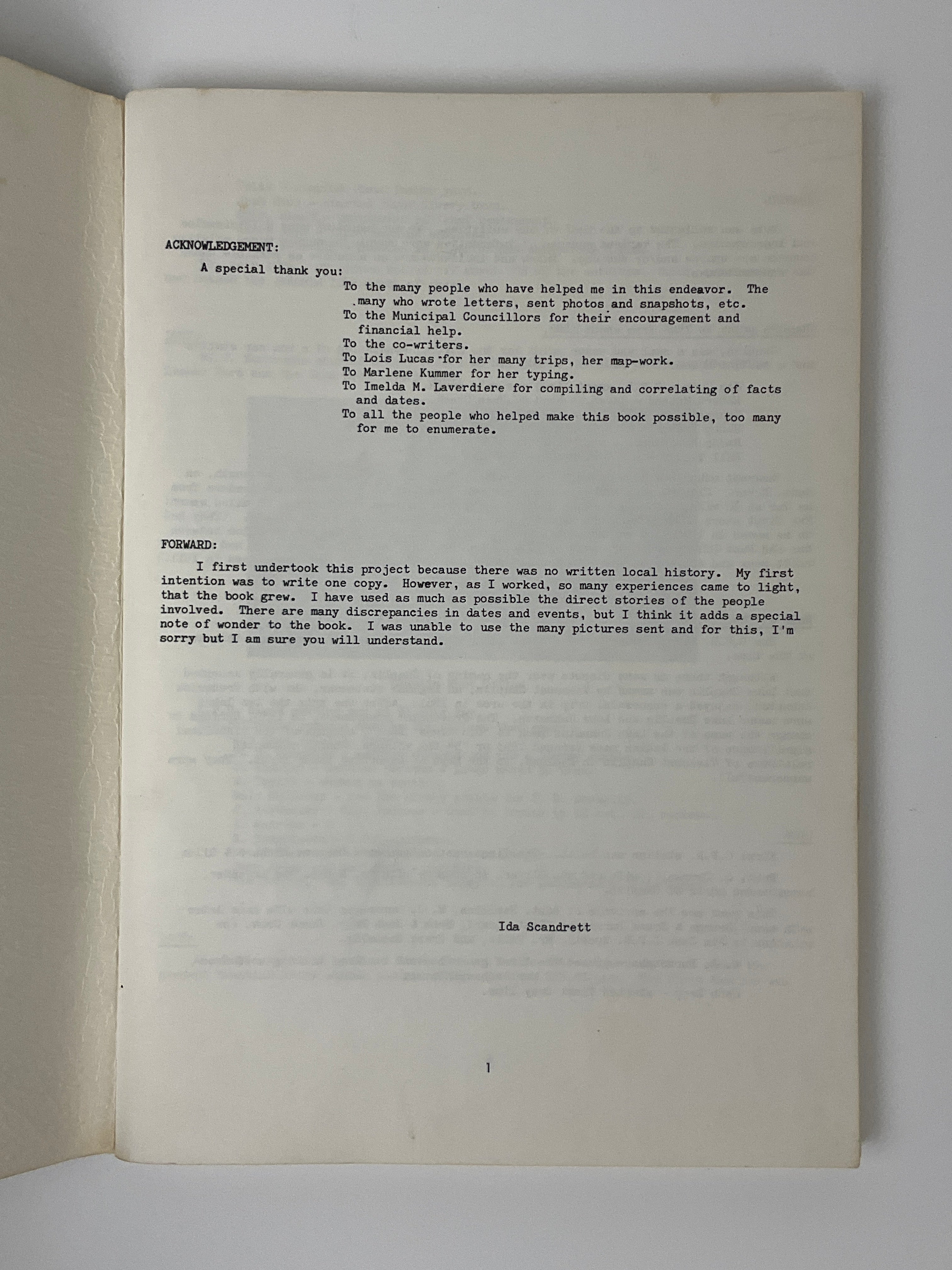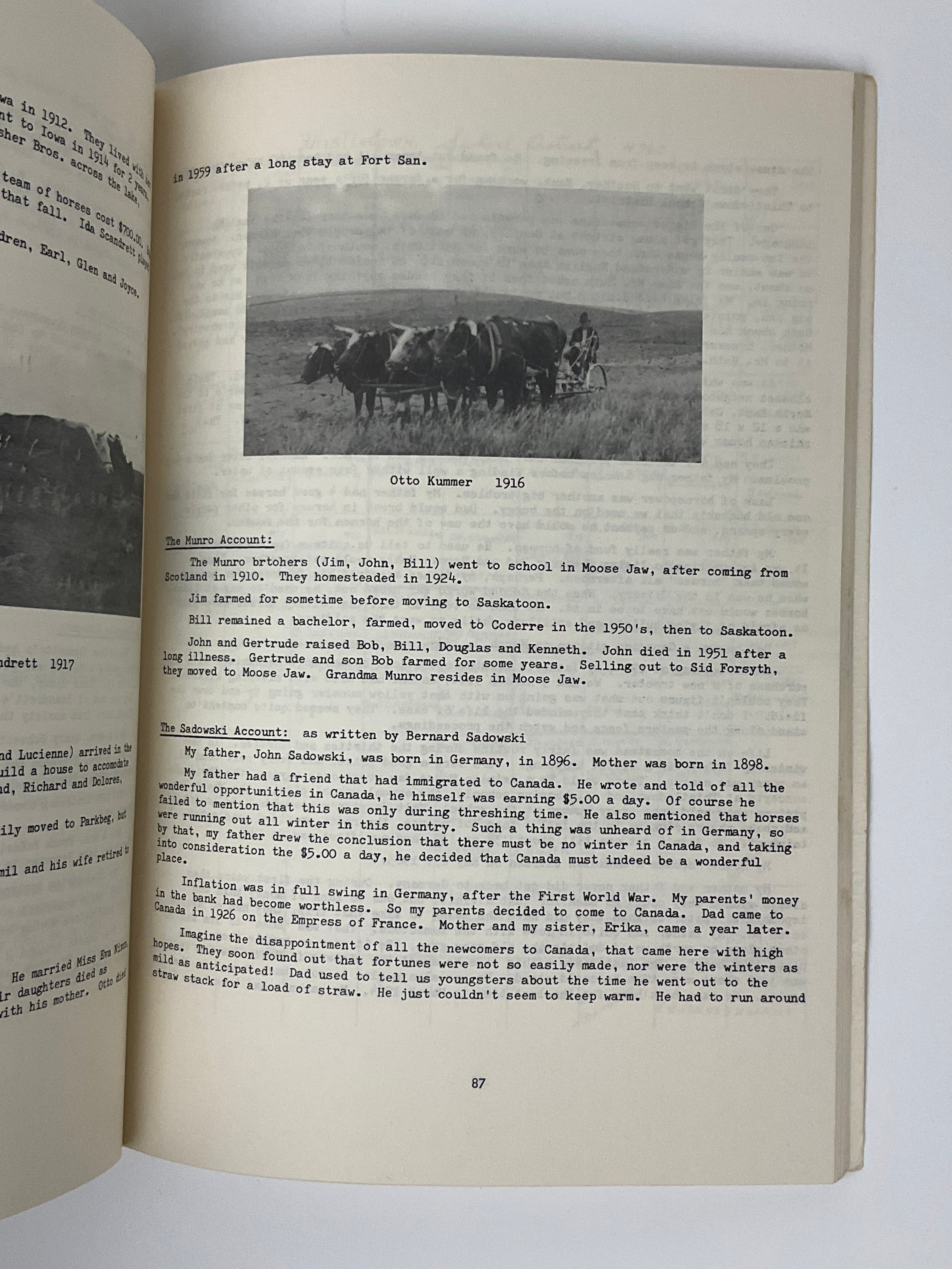 Welcome Home is a local history book documenting the community of Chaplin in south-central Saskatchewan, along with the surrounding school districts and settlements of Laura Secord, Antelope Creek, Uren, Champion Hill, Bothwell, Lambourne, Droxford, Thistledown, Esther, Northam, Valjean, Secretan, Three Hills, Pine Lake, Aquadell, Knowleside, and Mount Rumble. Where available, the compiler includes brief biographies of early settlers, providing a personal glimpse into the region’s pioneer past. The book also features a concise historical overview of the area.