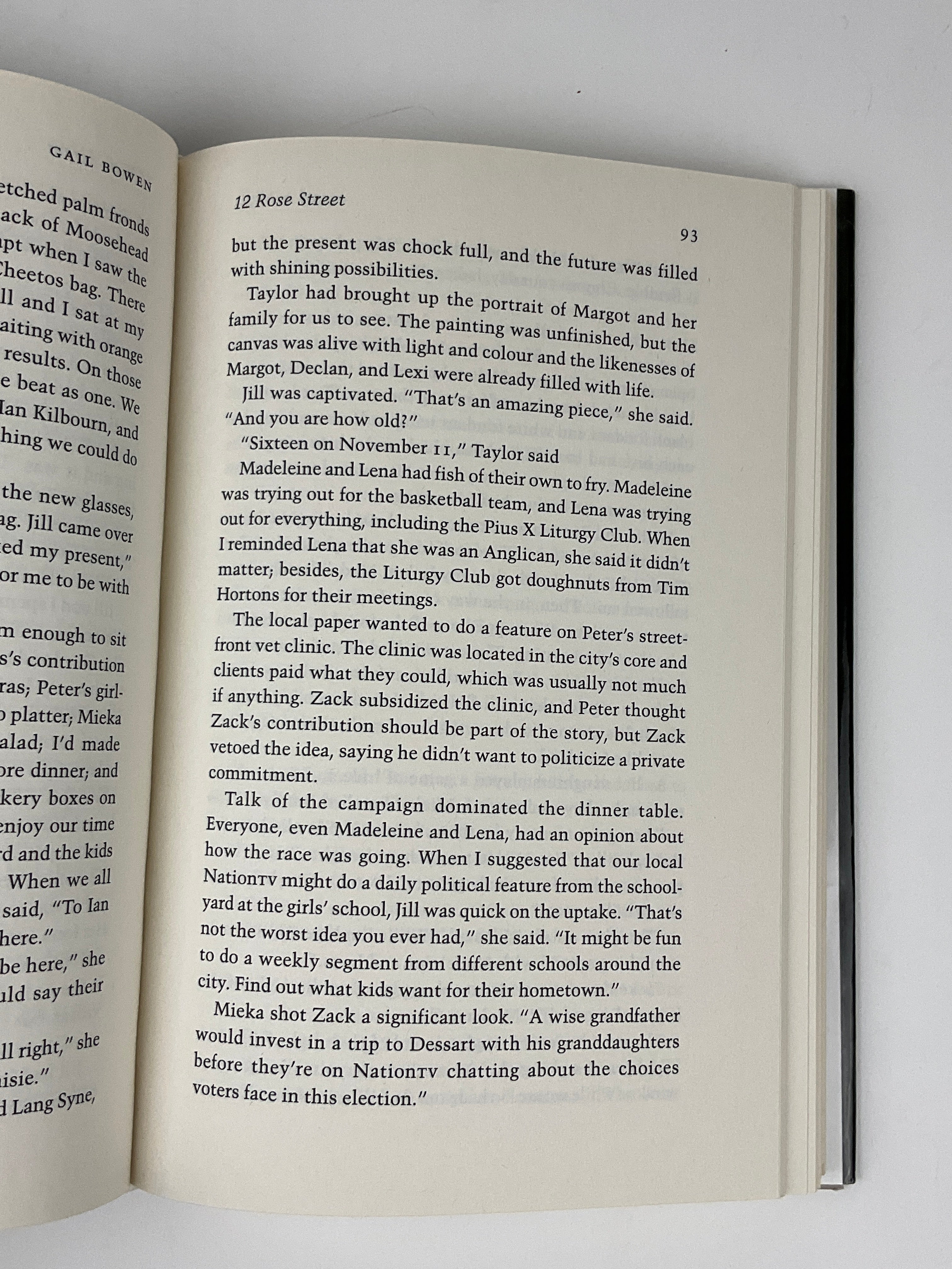 The blurb on the front flap reads "... Joanne's husband Zack is the leading progressive candidate in a neck-and-neck race with the existing mayor for Regina's top job. The tough campaigning is well underway when a disturbing threat disrupts the celebration for the opening of the Racette-Hunter Centre - a project Zack has been spearheading, intended to benefit the impoverished community of North Central Regina. A savage crime soon follows, and it becomes clear that certain players in the vicious election will stop at nothing to maintain the status quo. ..."