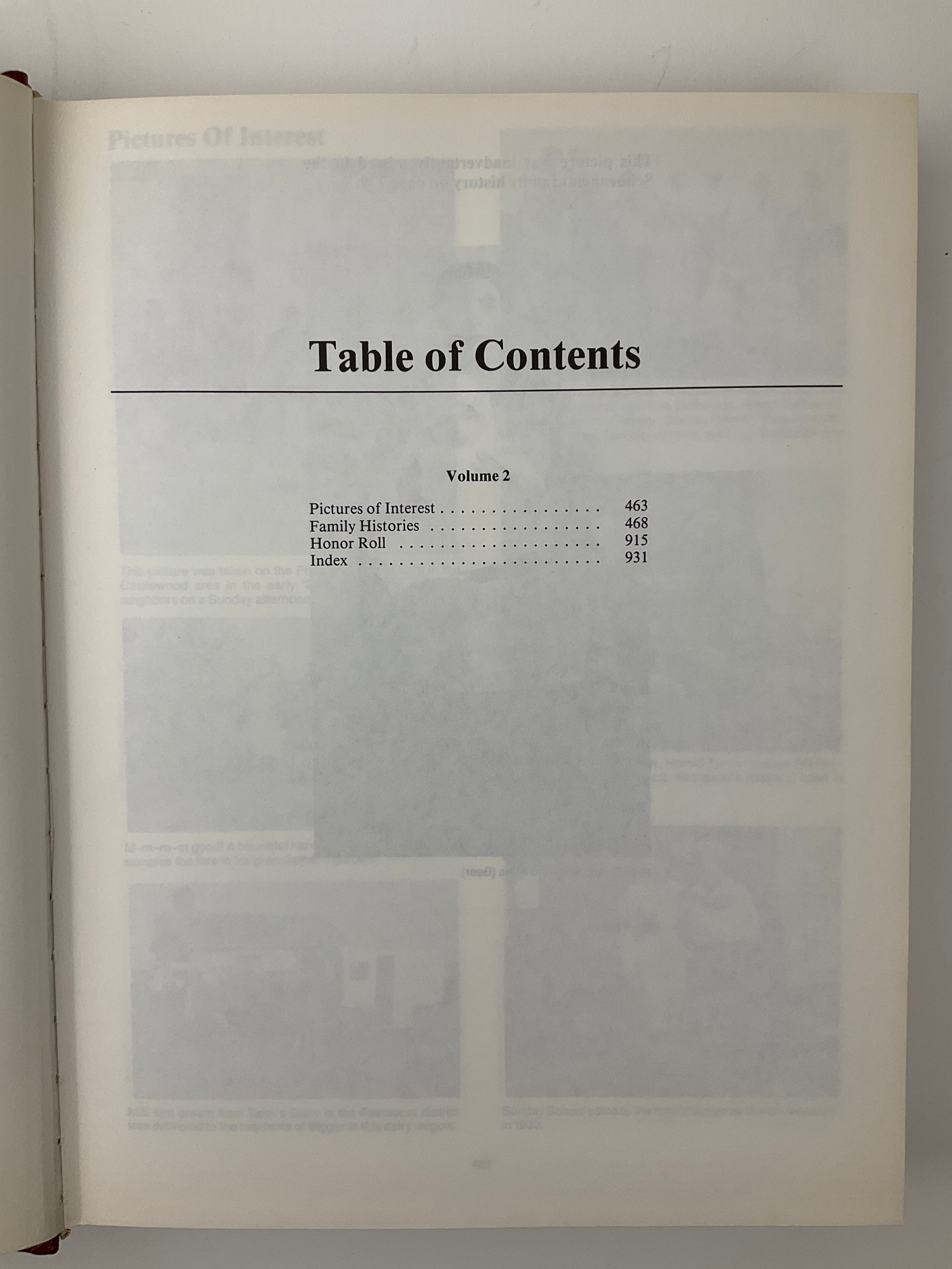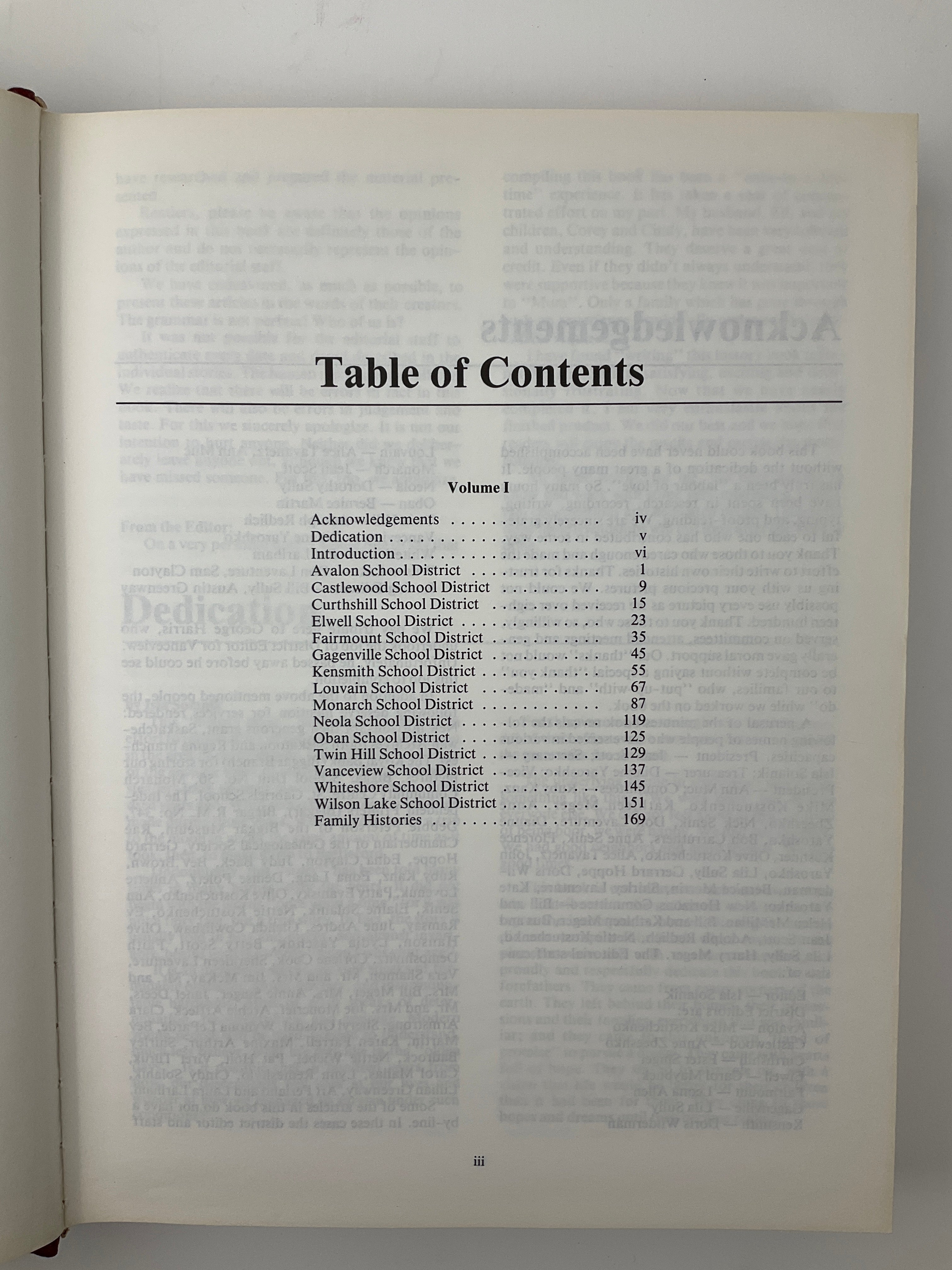 This two-volume community history of Saskatchewan's Rural Municipality of Biggar #347 (particularly the area north of Biggar). The first third of Volume I includes histories of fifteen school districts: Avalon, Castlewood, Curths Hill/Curthshill, Elwell, Fairmount, Gagenville, Kensmith, Louvain, Monarch, Neola, Oban, Twin Hill, Vanceview, Whiteshore, and Wilson Lake. The remainder of the volume contains family histories for surnames A-K (surnames K-Z continue in Volume 2). Included at the end of Volume I is a single page of material that was erroneously left out during publication (although, alphabetically, the surnames presented fit into Volume 2).