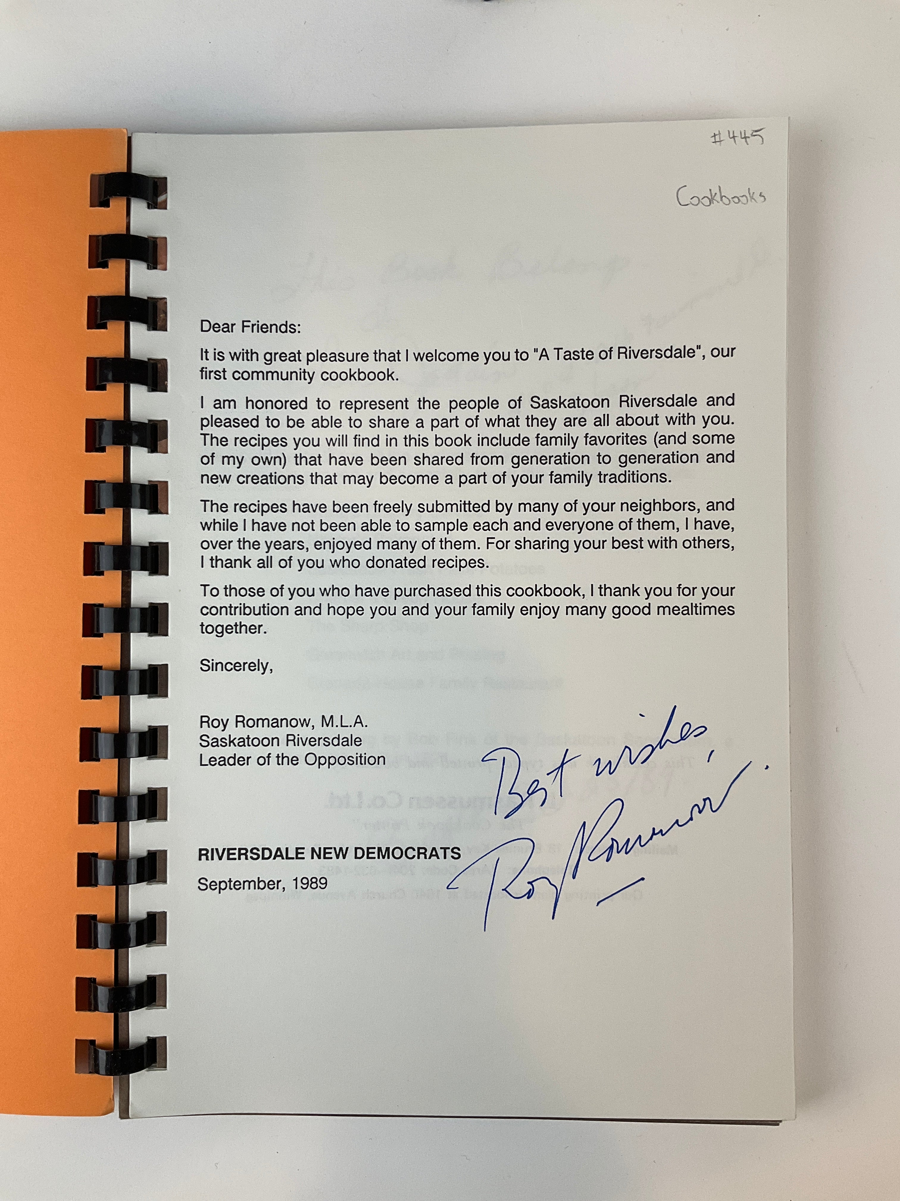 This cookbook contains recipes submitted by residents of Saskatoon’s Riversdale provincial electoral riding as well as by Roy Romanow (the riding’s MLA for 30 years, and Saskatchewan's Premier 1991-2001) and members of Saskatchewan’s New Democratic Party. Contributions range from Romanow’s mother’s “Ukrainian Walnut Torte” to Saskatoon artist Bob Fink’s “Noodles ‘Alfinko’,” with Desserts making up the largest category of recipes. Includes index and a great recipe for Elephant Stew.