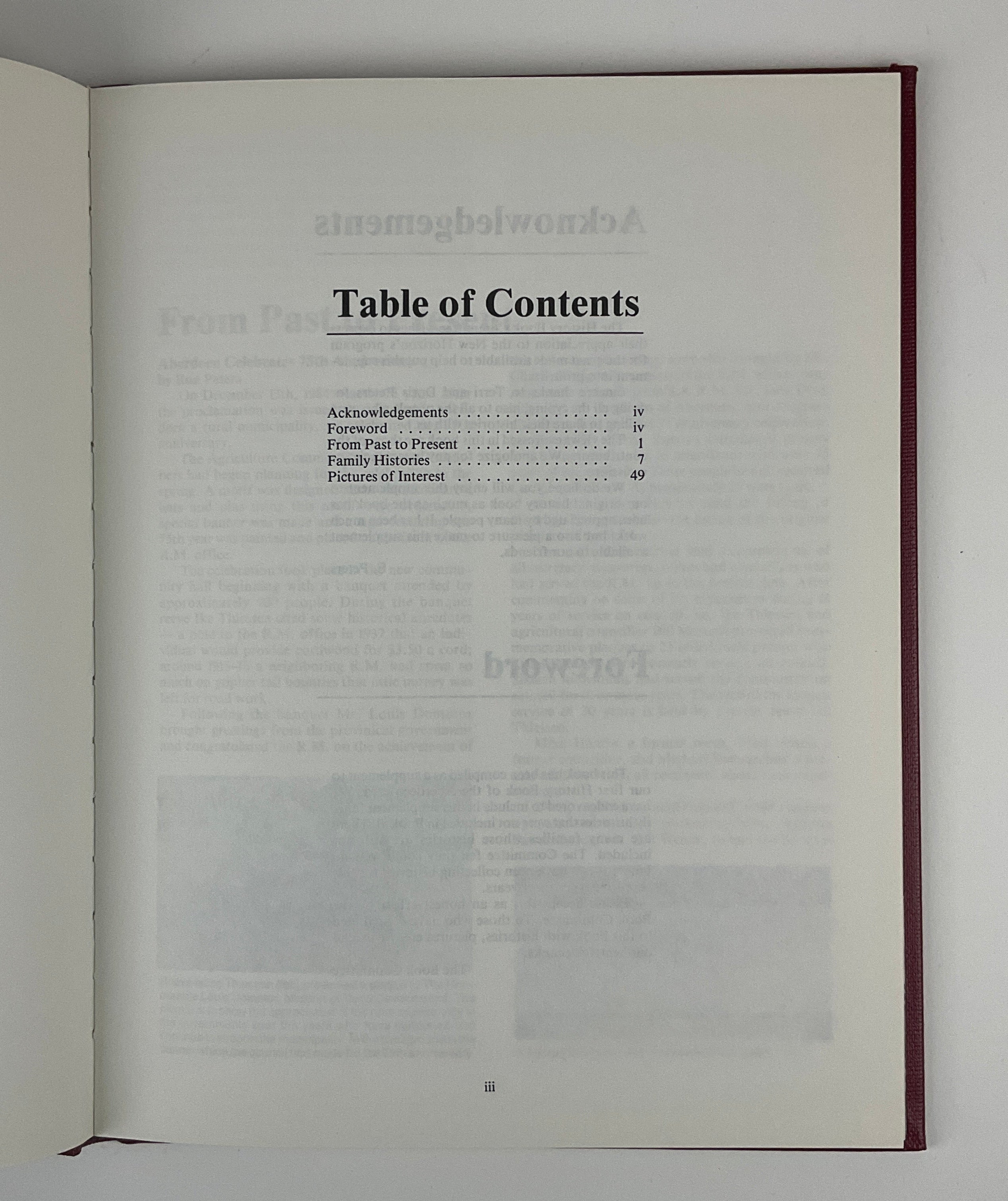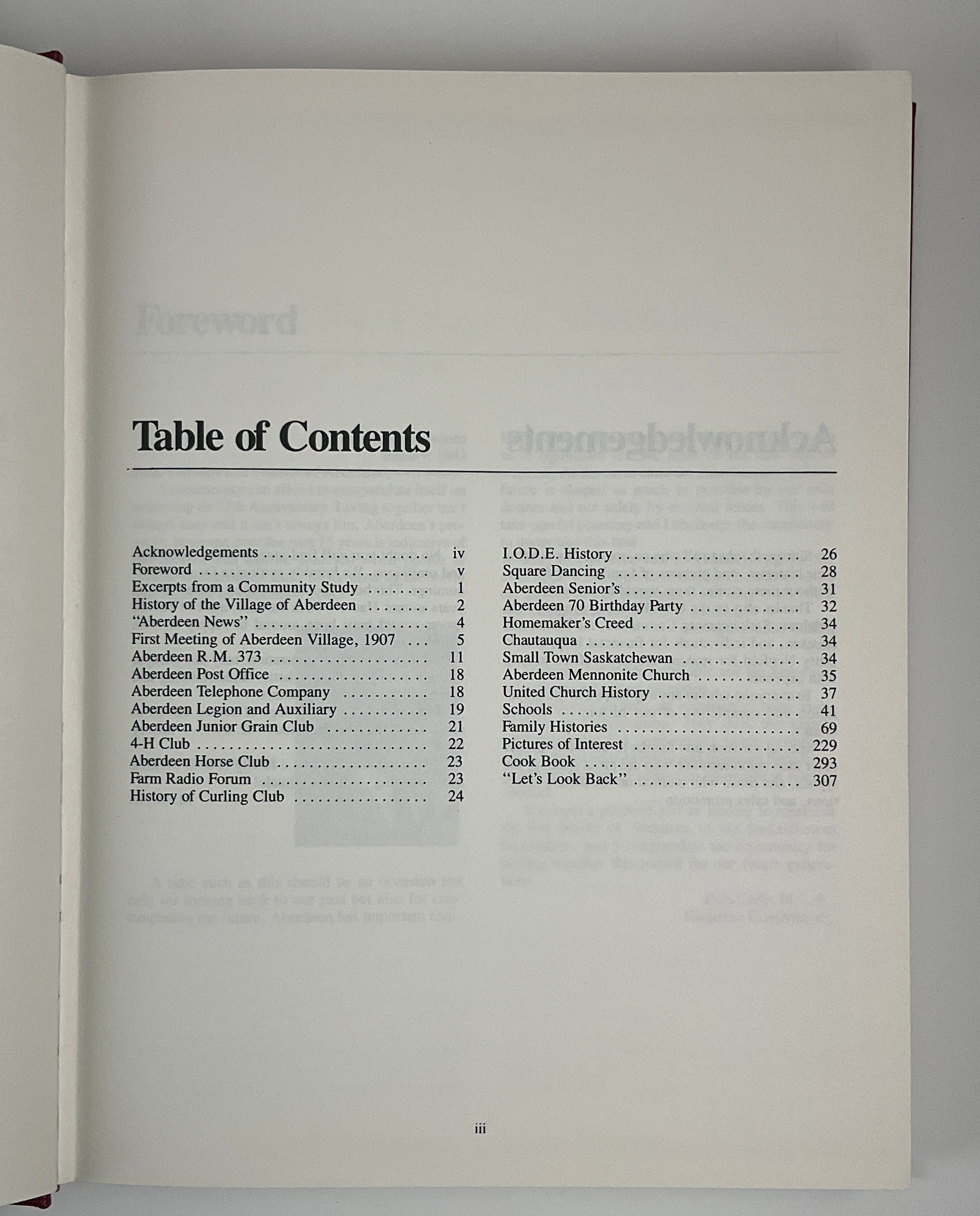 This volume collects the community history of Saskatchewan's Rural Municipality of Aberdeen #373. It begins with histories of local organizations, businesses, clubs, churches, and schools, followed by family histories of area residents. The volume includes a copy of "Reliable Recipes," a cookbook compiled in 1927 by the Aberdeen United Church's Ladies Aid.