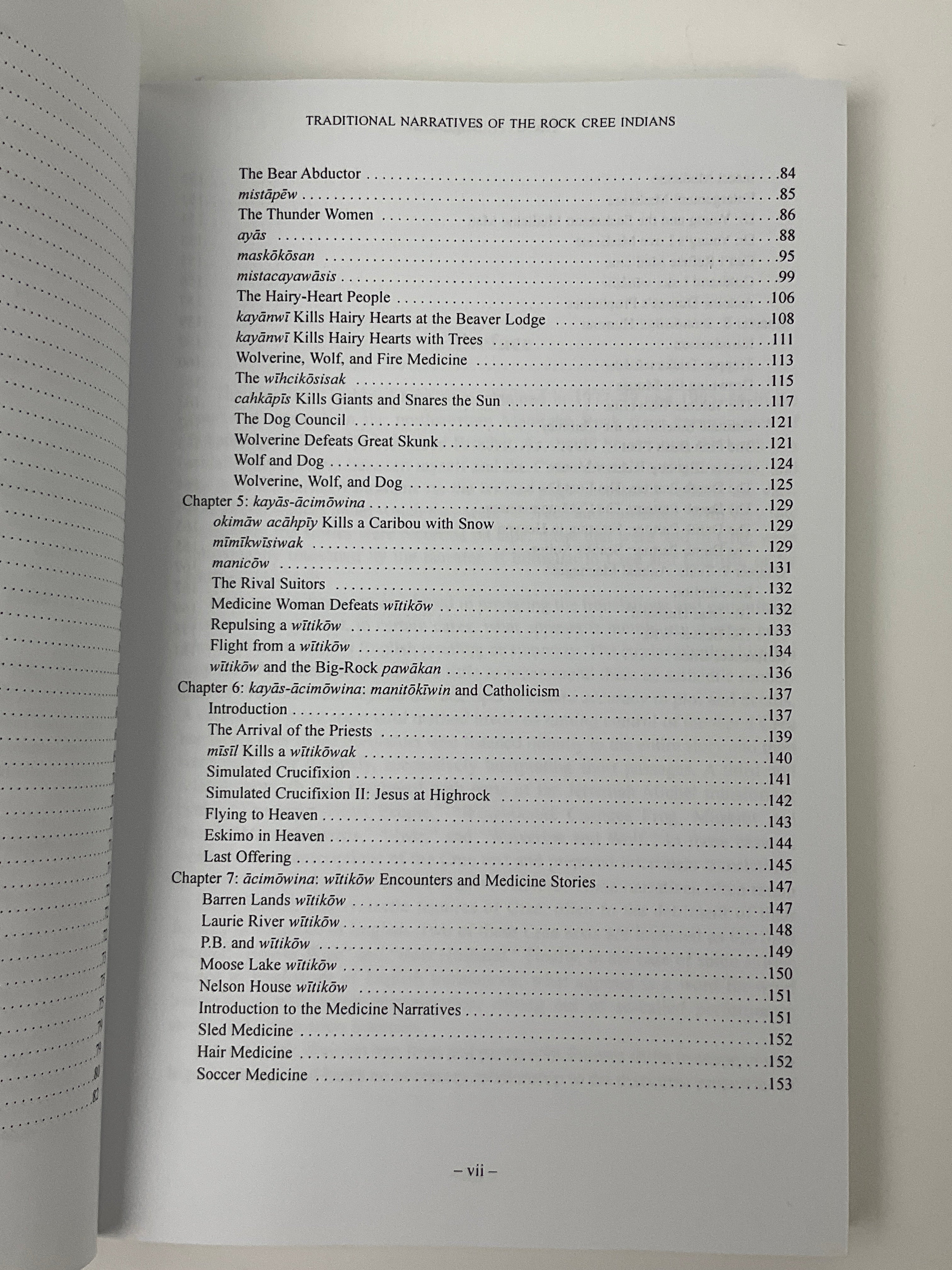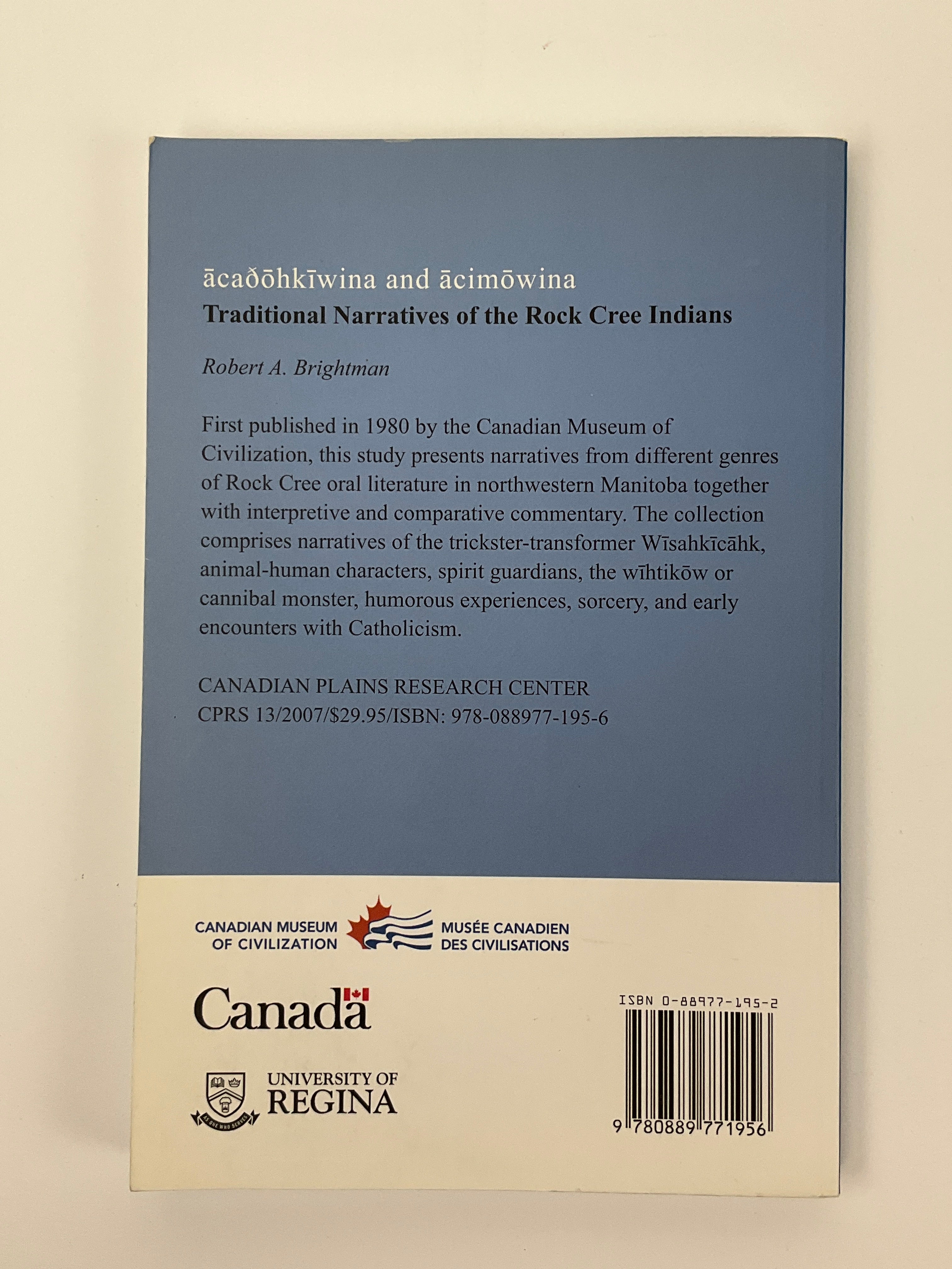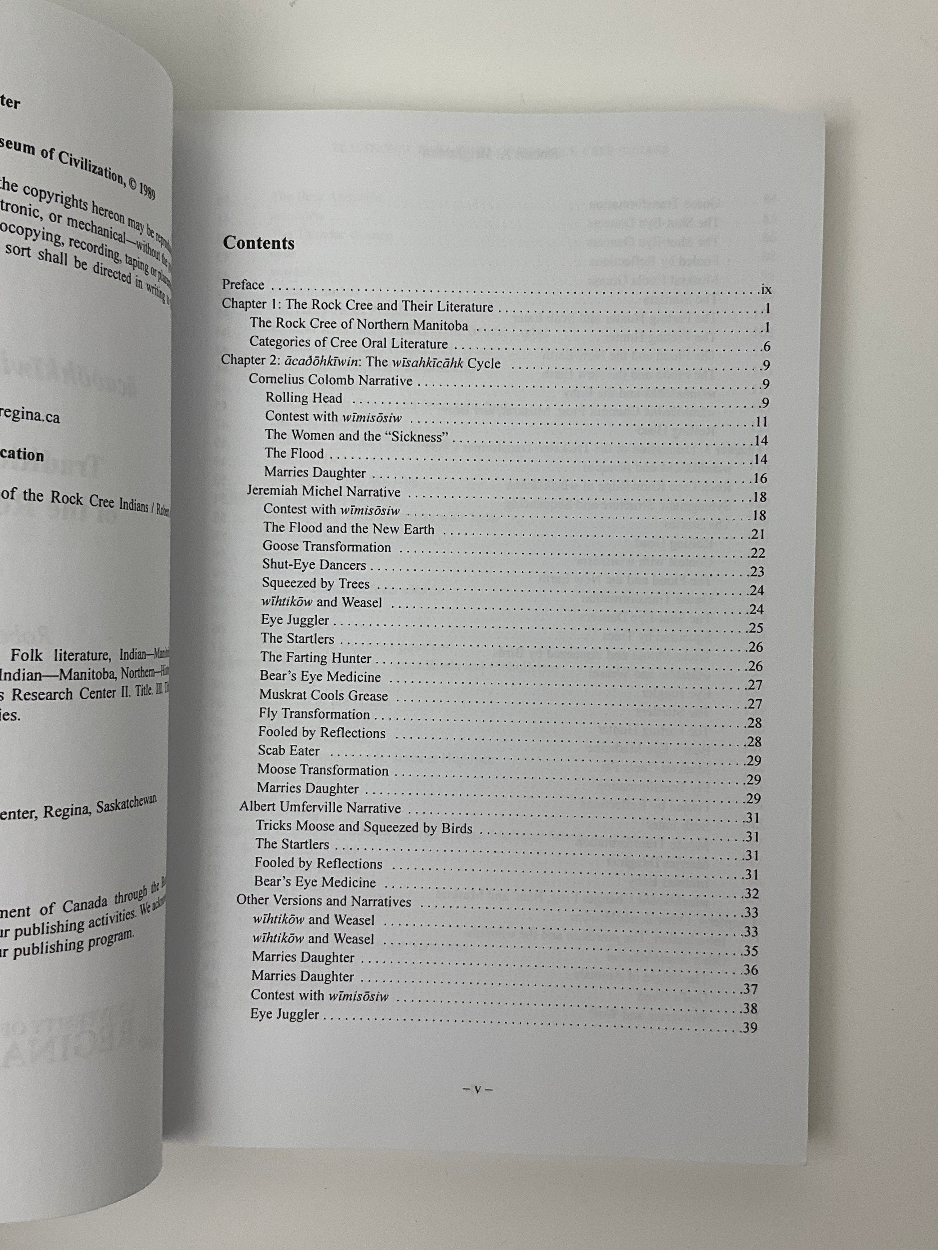 This volume presents a selection of oral traditions from the Rock Cree (Rock Creek Cree) of northwestern Manitoba. Drawing from diverse narrative forms—acadohkiwina (traditional stories) and acimowina (personal narratives or histories)—the collection includes accounts of the trickster-transformer Wisahkicahk, animal-human beings, spirit helpers, the fearsome wihtikow (cannibal monster), episodes of sorcery, humorous incidents, and early encounters with Catholic missionaries. Each narrative is accompanied by interpretive commentary and comparative notes.