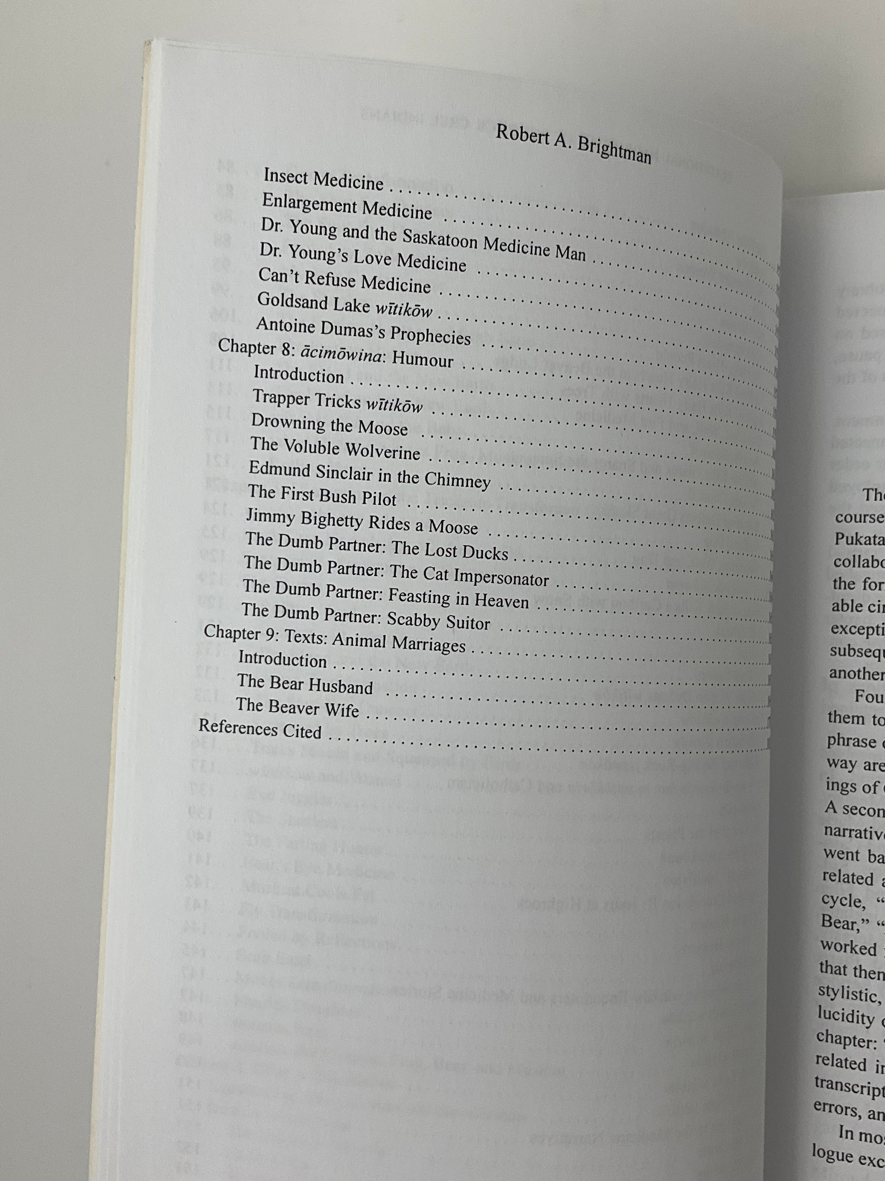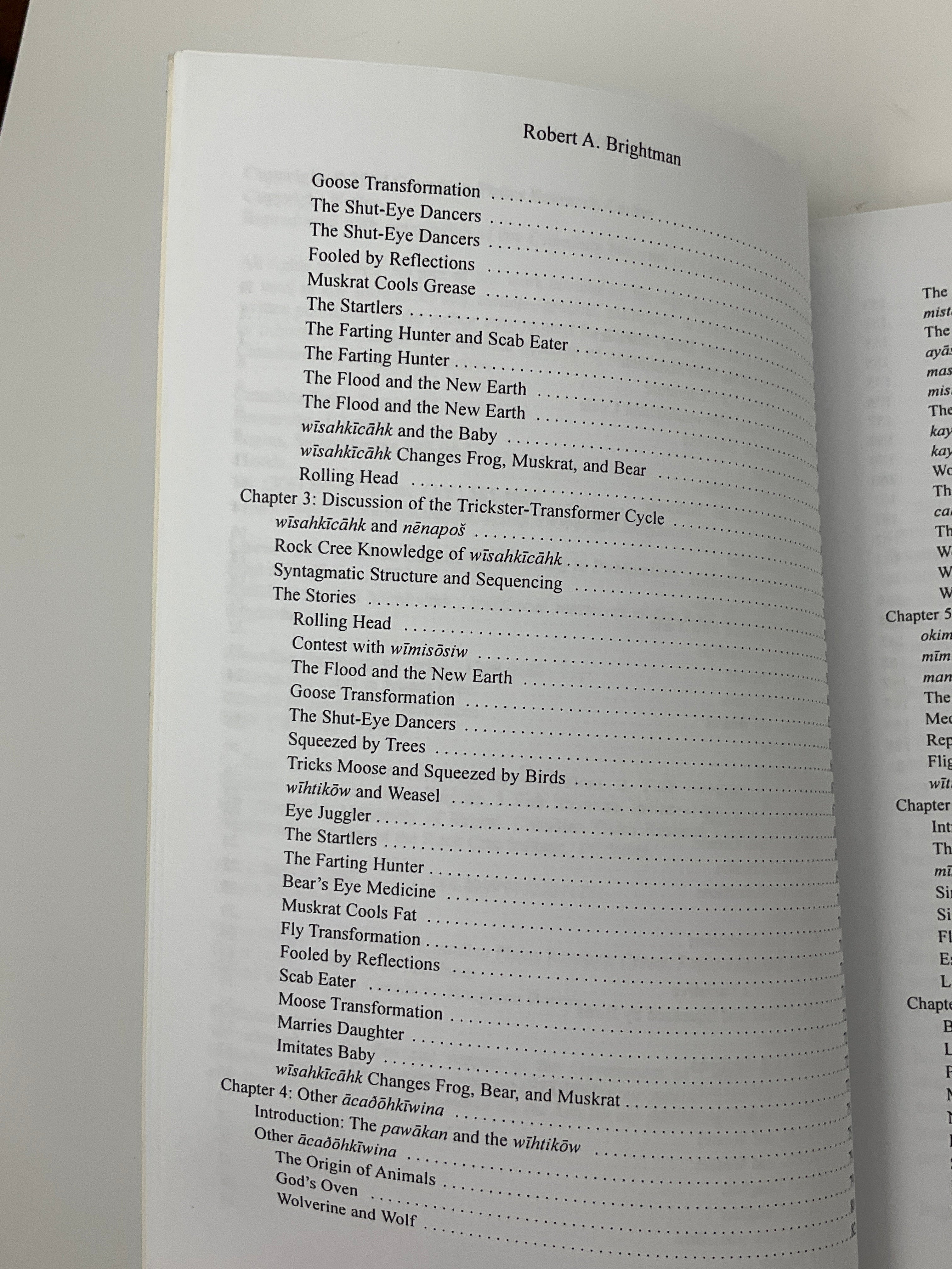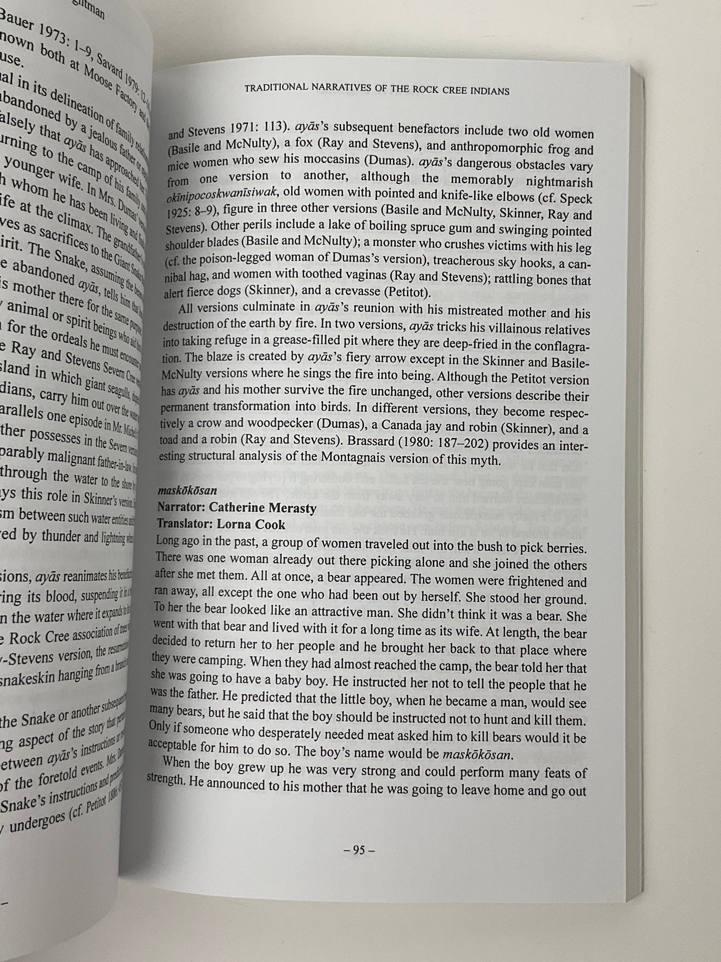 This volume presents a selection of oral traditions from the Rock Cree (Rock Creek Cree) of northwestern Manitoba. Drawing from diverse narrative forms—acadohkiwina (traditional stories) and acimowina (personal narratives or histories)—the collection includes accounts of the trickster-transformer Wisahkicahk, animal-human beings, spirit helpers, the fearsome wihtikow (cannibal monster), episodes of sorcery, humorous incidents, and early encounters with Catholic missionaries. Each narrative is accompanied by interpretive commentary and comparative notes.