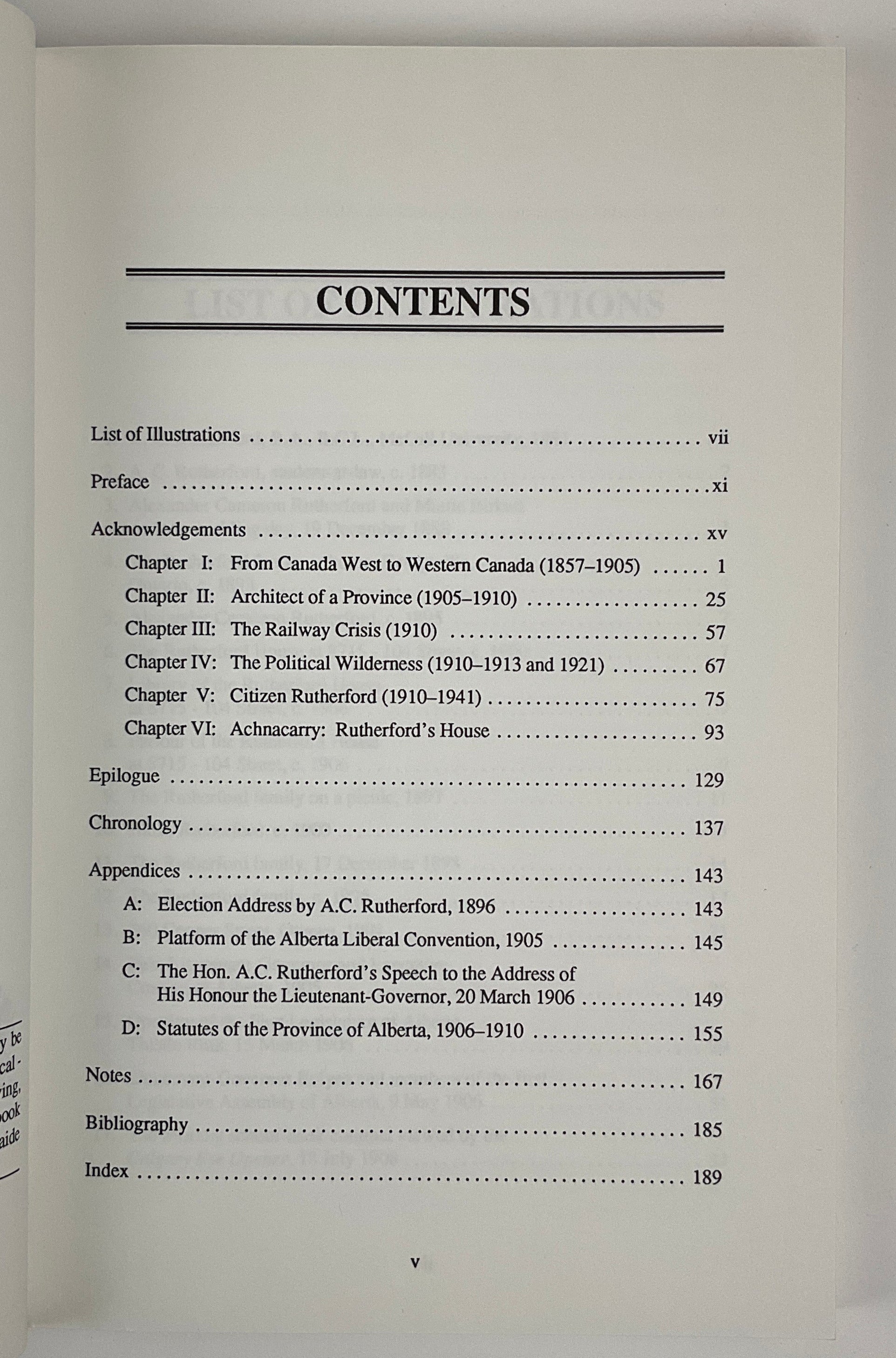 In this volume, Douglas R. Babcock writes a biography of Alexander C. Rutherford (1857-1941), Alberta’s first Premier and cofounder of the University of Alberta. Moving quickly through Rutherford’s childhood and early career as a lawyer in Ontario, Babcock describes Rutherford’s 1895 arrival in Strathcona and entry into provincial politics. The book discusses Rutherford’s 1905 appointment as Premier, explains and critiques his handling of Alberta’s first legislative assemblies, and sketches the 1910 Alberta and Great Waterways Railway scandal that forced his resignation. After Rutherford’s defeat in the 1913 election, Babcock traces his return to practicing law and work as the University of Alberta's Chancellor. A final chapter covers Rutherford House's history. Throughout, Babcock assesses Alberta’s political climate and Edmonton’s growth. Includes endnotes and index.