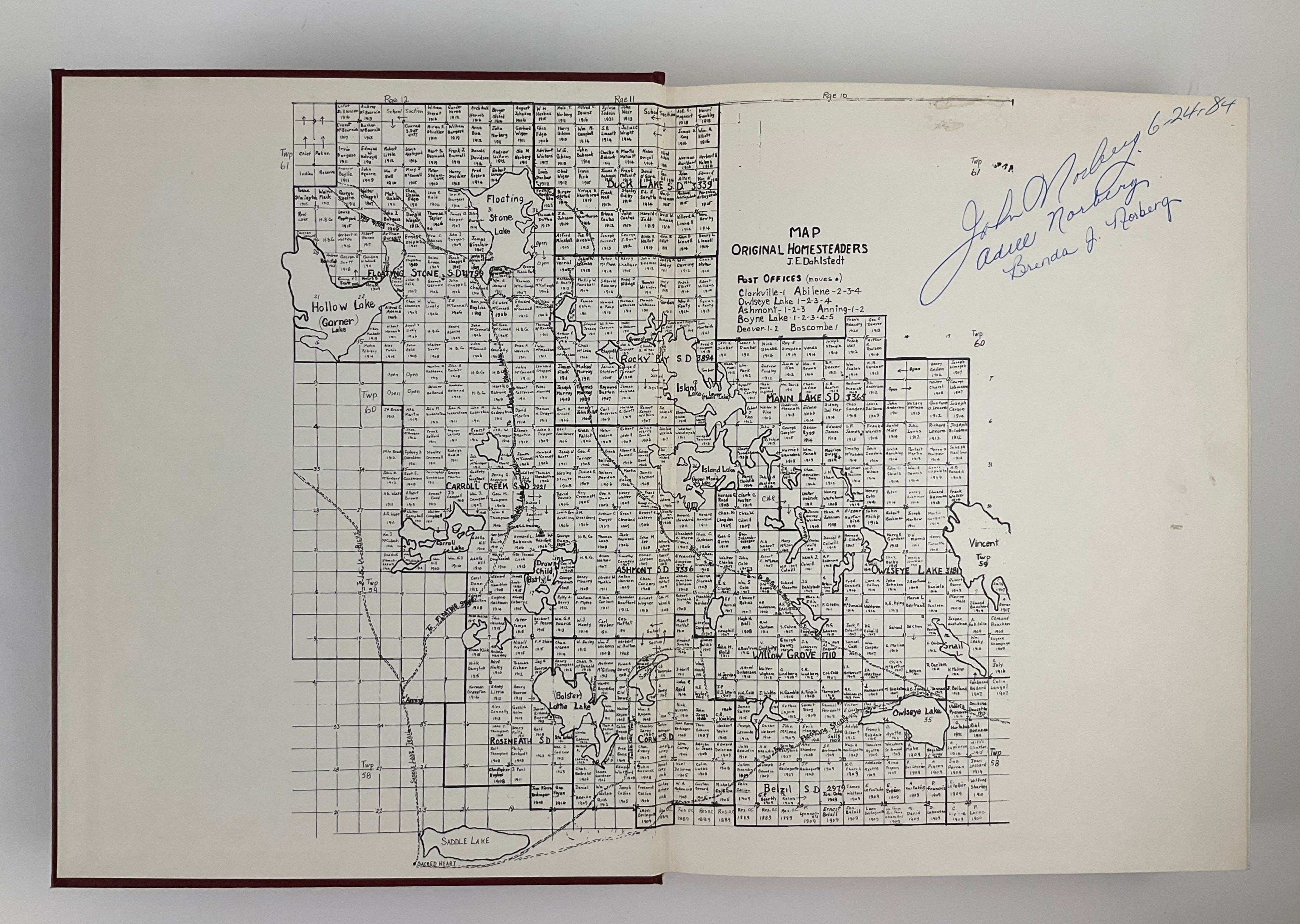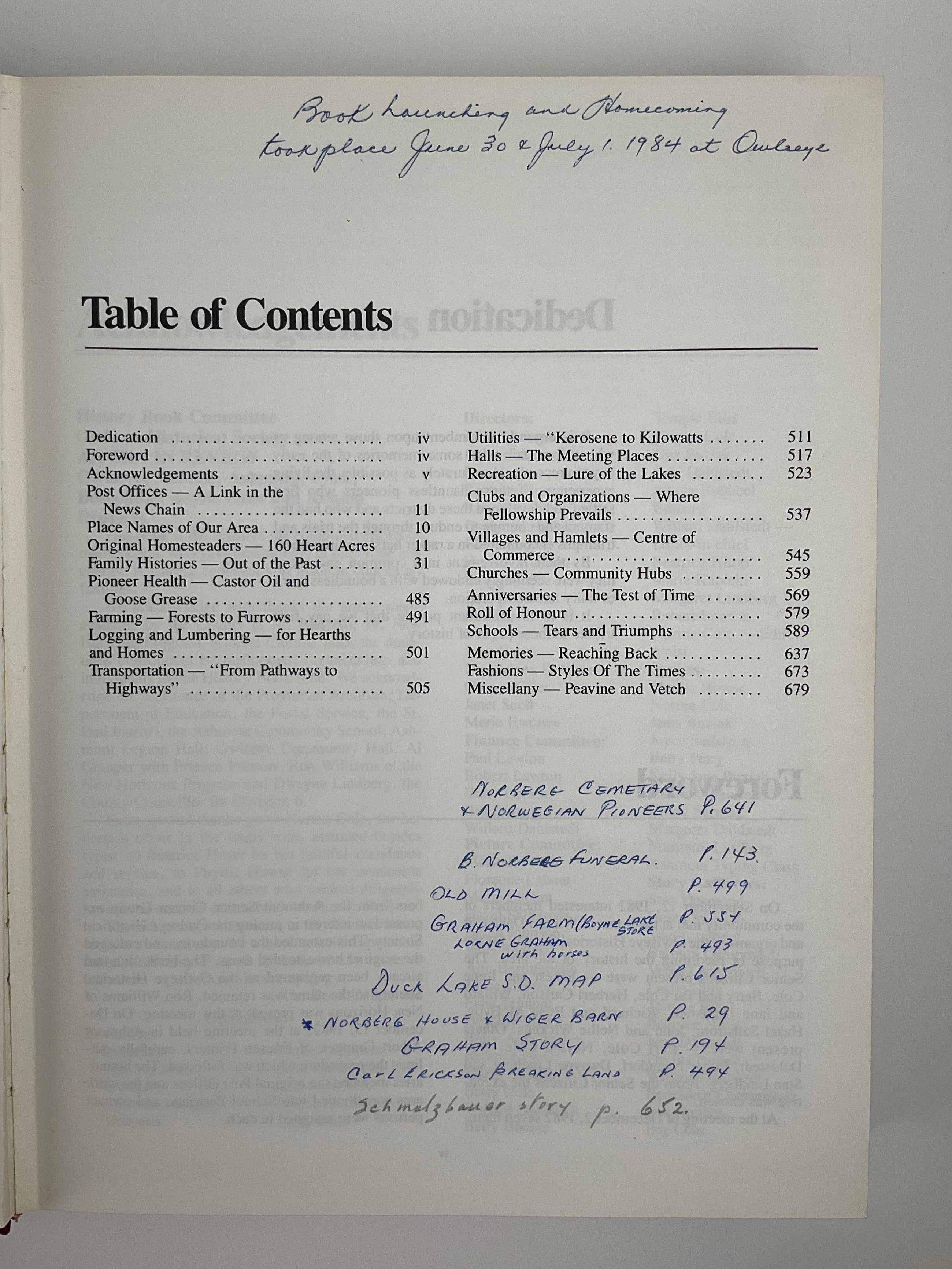 This volume contains a community history of several hamlets and localities in Alberta’s County of St. Paul #19: Abilene, Anning, Ashmont, Boscombe, Boyne Lake, Cork, and Owlseye. The book opens with brief explanations of local place names and postal services, as well as a section-by-section list of homestead owners. Family histories contributed by area residents make up the majority of the text. Topical chapters on local agriculture, healthcare, logging operations, organizations and clubs, schools, and services also appear. Includes index. Newspaper clippings concerning residents laid in at pp. 243 and 276; written notes concerning Duck Lake school laid in at p.614.