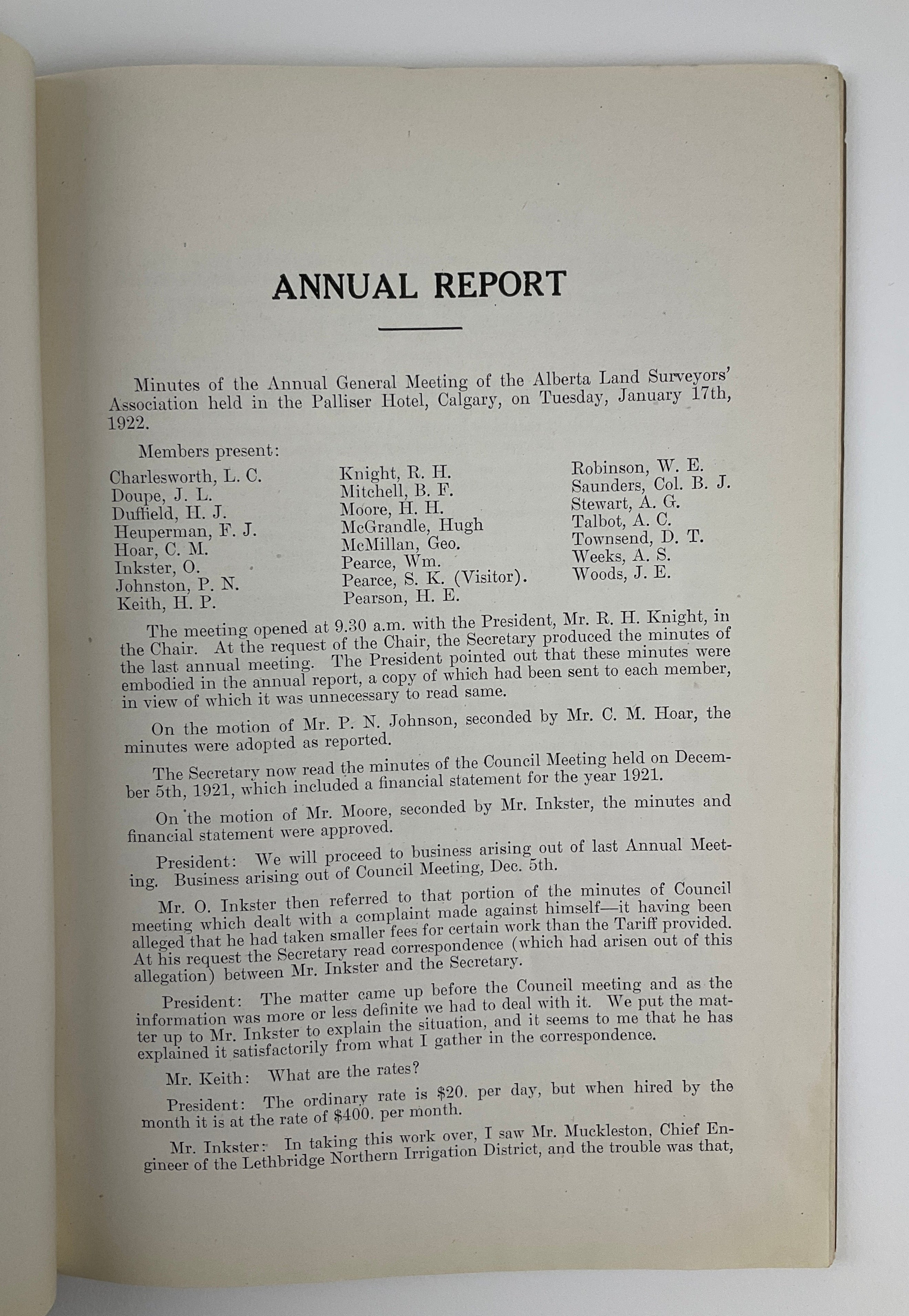 Annual Report of the Alberta Land Surveyors’ Association and Honour Roll 1921 [Observer At Louis Riel's Trial]