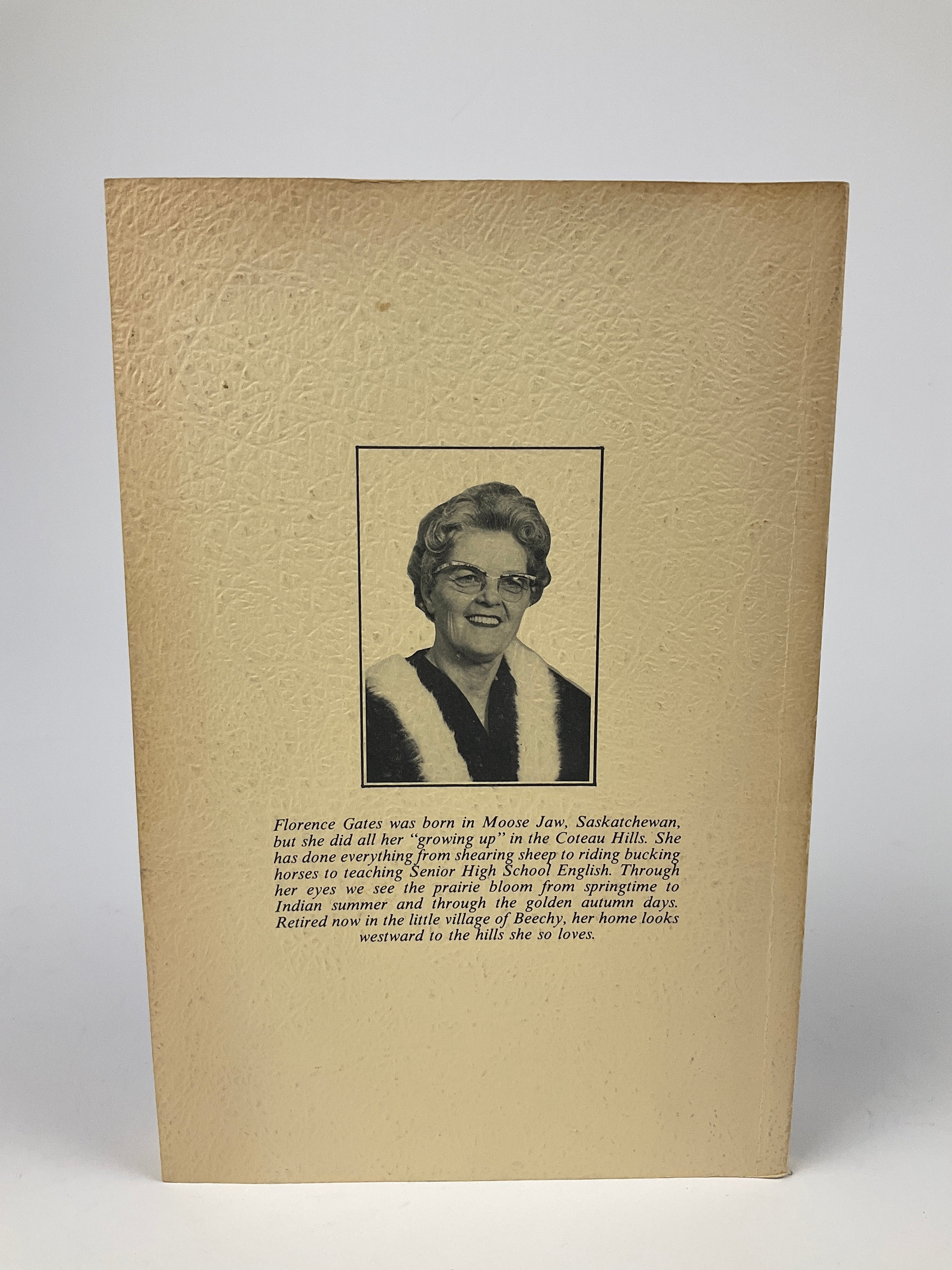 Florence Gates (b.1913) was a Saskatchewan rancher, teacher, and author. In addition to contributing to publications like “Canadian Cattleman,” Gates wrote “Back to the Coteau Hills,” a personal memoir of growing up in rural Saskatchewan and homage to the Coteau Hills region (west of Regina). Gates begins her story with her grandparents’ arrival in Saskatchewan in search of land in the early 1900s. She describes the circumstances of her parents’ meeting, her birth in 1913, and the family’s ranch established in 1917. Gates recalls growing up and going to school with siblings, teaching in a country school, and eventually meeting her husband in 1937. Throughout, Gates’ thoughtful insights and fond anecdotes form an engaging personal history of ranching in southern Saskatchewan. No publication date indicated, but illustrations are dated 1984, making a publication date of 1984 or later likely.