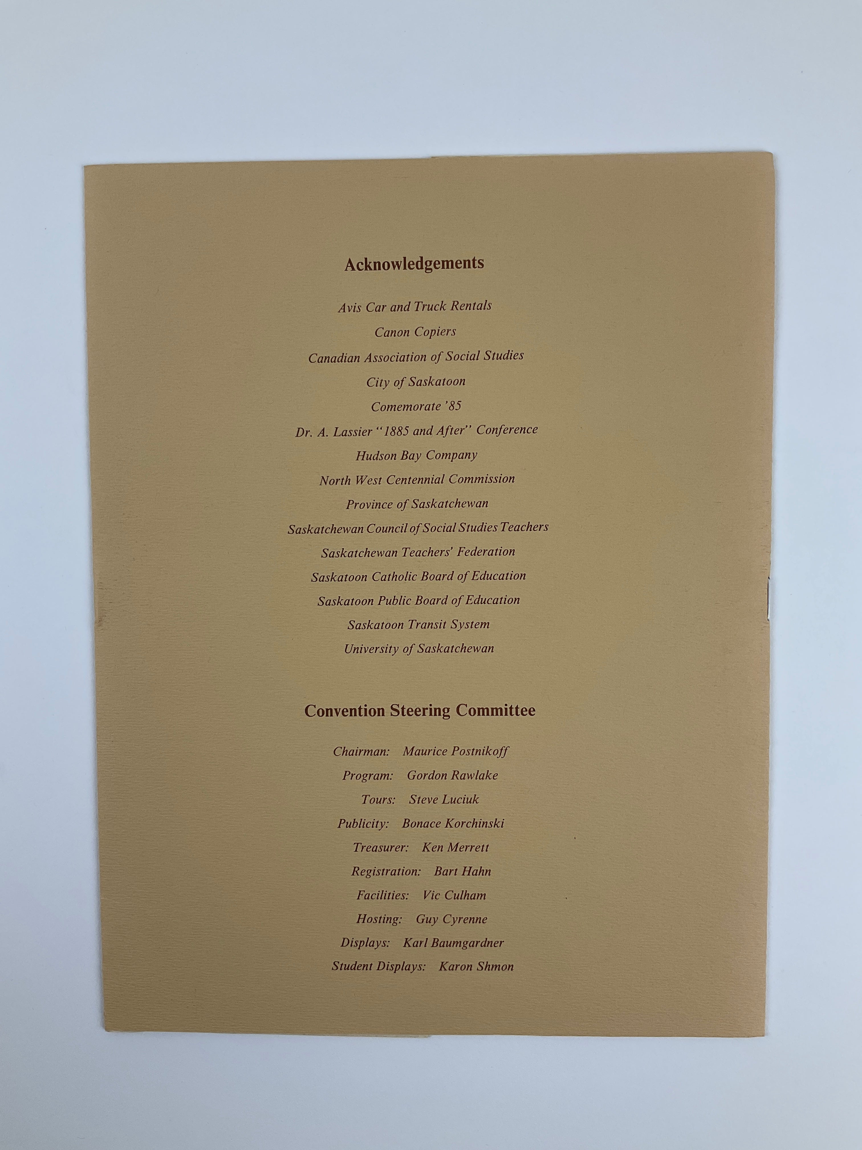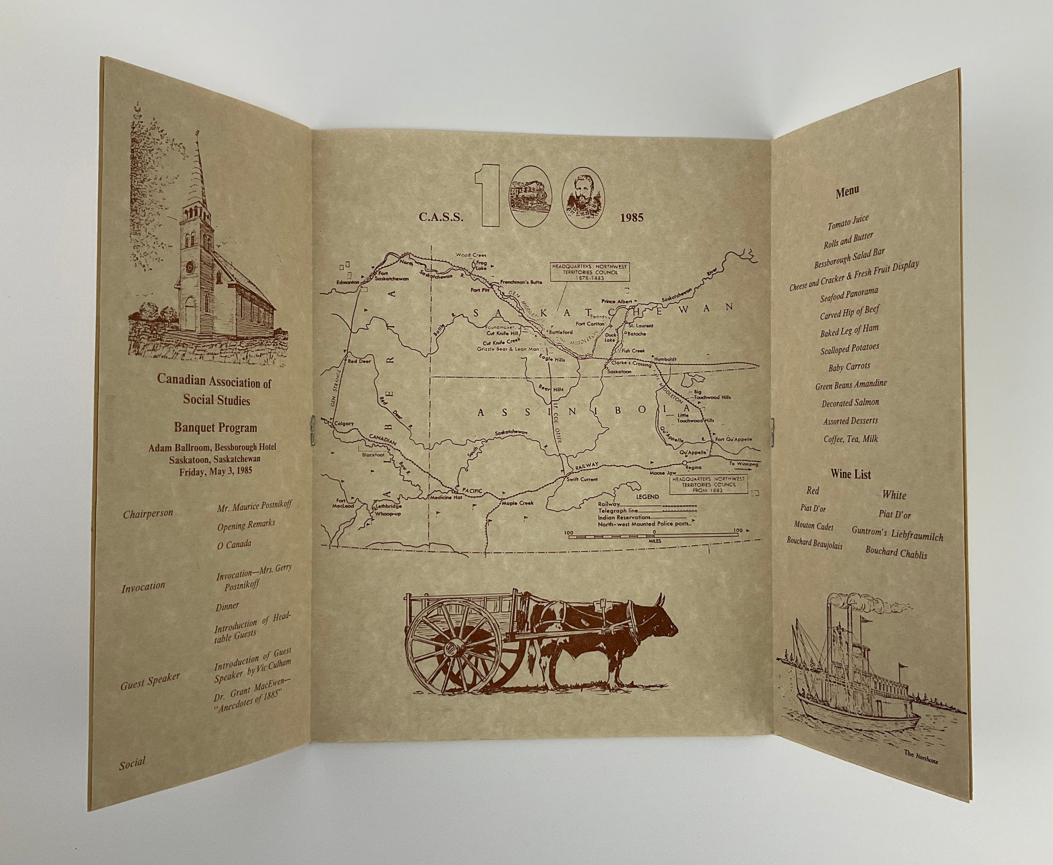 This booklet contains a programme of the evenings events and menu for a 1985 banquet held by the Canadian Association of Social Studies in Saskatoon, Saskatchewan. The banquet took place during a joint convention of the Canadian Association of Social Studies and the Saskatchewan Council of Social Studies Teachers. Sessions and lectures were held at the University of Saskatchewan, with some meetings and functions (including the banquet) at the Bessborough Hotel. The convention’s sessions focussed on the 1885 North-West Resistance, and the banquet featured a lecture by Grant MacEwan.