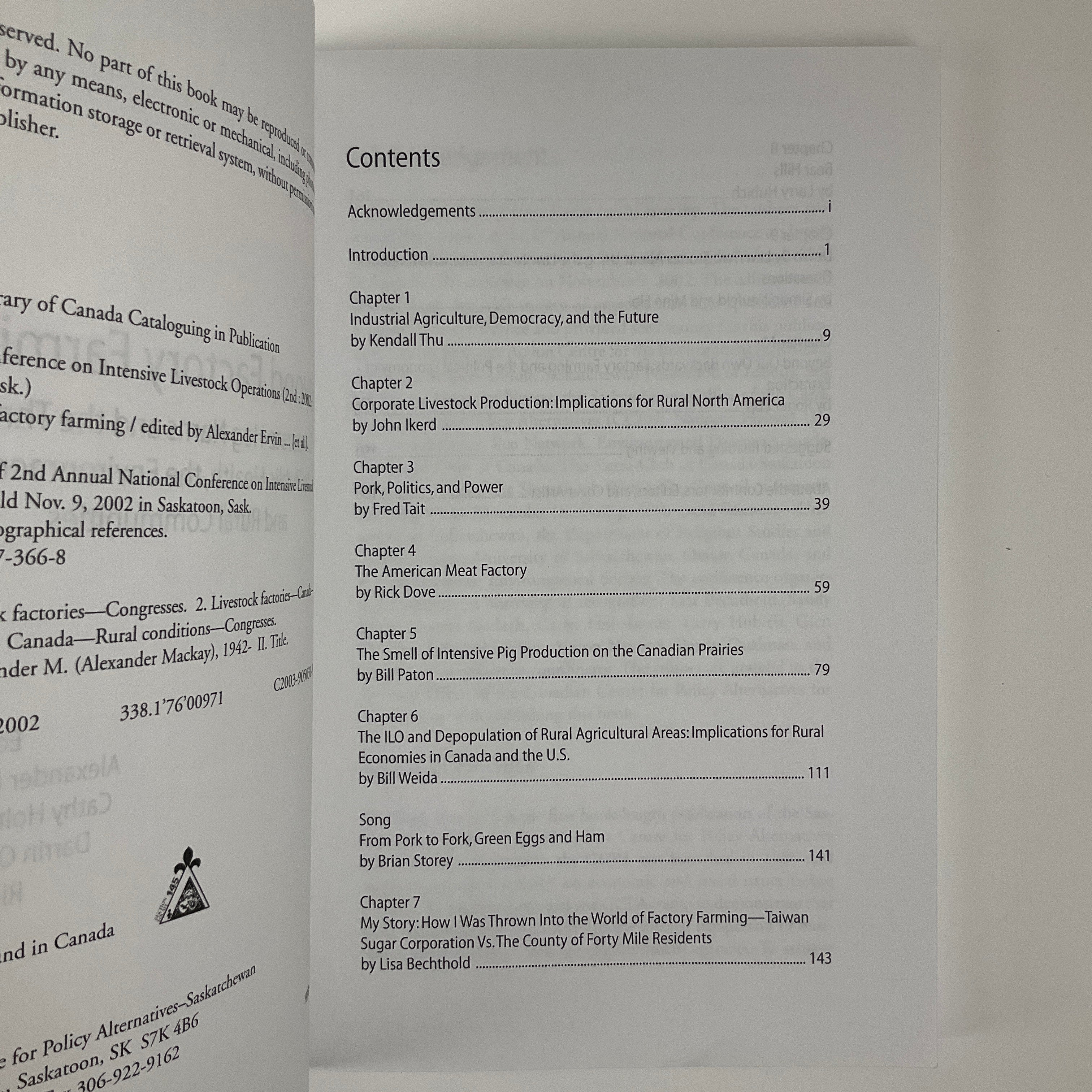 The Canadian Centre for Policy Alternatives was founded in 1980 as a venue for envisioning and presenting nonpartisan solutions to economic and social issues in the country. CCPA’s Saskatchewan branch was formed in 2001, and this volume constitutes its first book-length publication. The book contains ten papers presented by academics, environmentalists, and farmers from Canada and the United States at a 2002 National Conference on Intensive Livestock Operations held in Saskatoon. The presenters critique corporate hog barns from multiple angles (including odor complaints, worker safety, and threatening small-scale farming operations) as well as the government legislation that supports corporate interests. They also offer suggestions for protecting local farms and communities (through activism or education, for example) or improving conditions in corporate settings (through unionization, for example). Includes references, charts, and graphs.