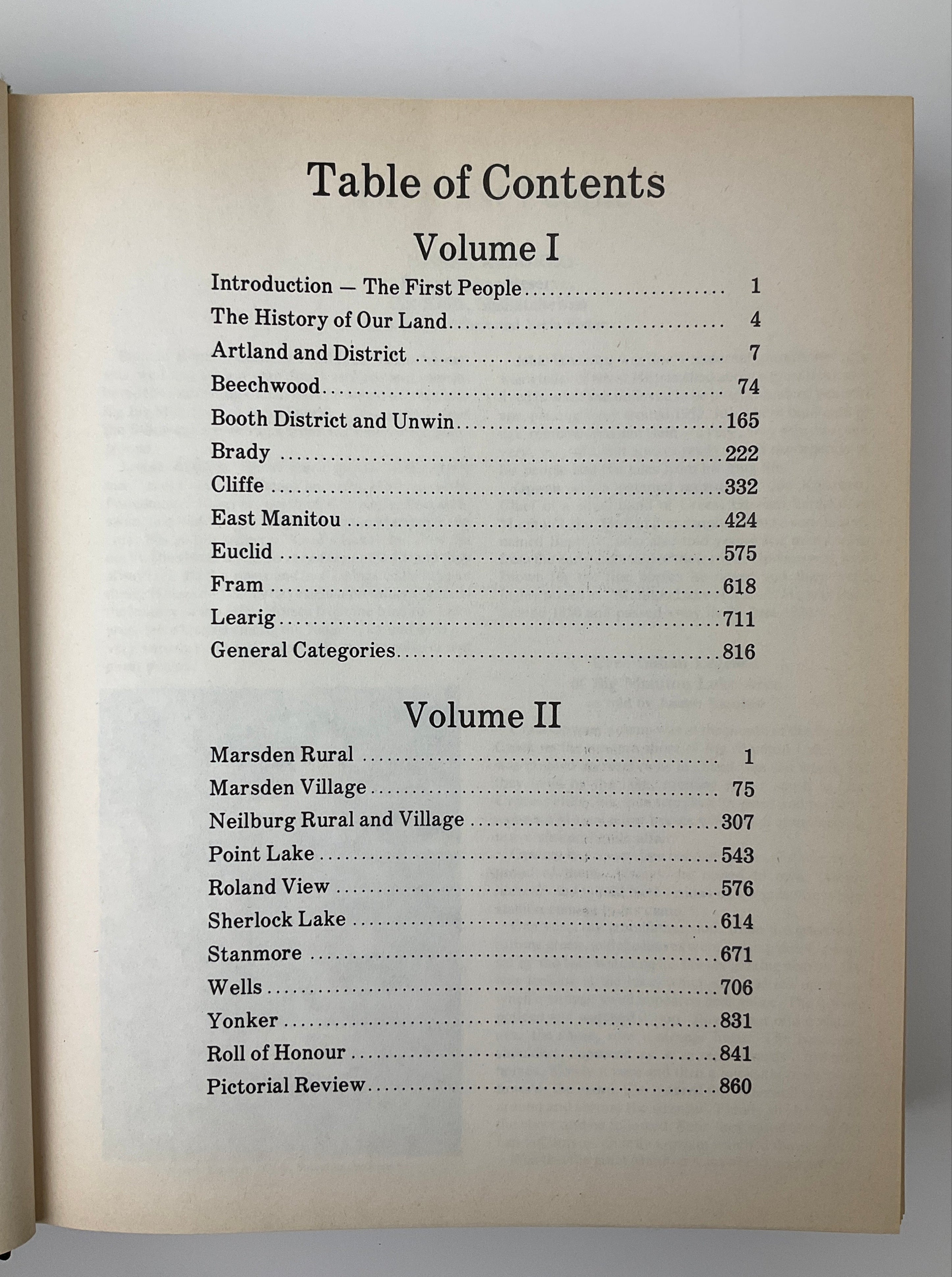 Volume One the first in the two-volume history of communities in the Manitou Lake area (south of Lloydminster near the Saskatchewan/Alberta border) is organized by school district, with each section containing historical overviews of towns/schools followed by family histories contributed by area residents. Volume One includes family histories from Artland, Beechwood, Booth and Unwin, Brady, Cliffe, East Manitou, Euclid, Fram, and Learig. This volume also includes chapters on "The First People" and "The History of Our Land: Marsden-Neilburg," as well as a 100-page "General Categories" section describing local agriculture, aviation, churches, Manitou Lake (including services and parks), municipalities, health, recreation, and wildlife. Includes index. Volume Two is the second in the two-volume community history of the Manitou Lake area (south of Lloydminster near the Saskatchewan/Alberta border). The volume is organized by school district, with each section containing historical overviews of towns/schools followed by family histories contributed by area residents. Volume Two includes family histories from Marsden, Neilburg, Point View, Roland Lake, Sherlock Lake, Stanmore, Wells, and Yonker. The volume opens with group photos of the Historical Association's members and closes with an Honor Roll. Includes index.