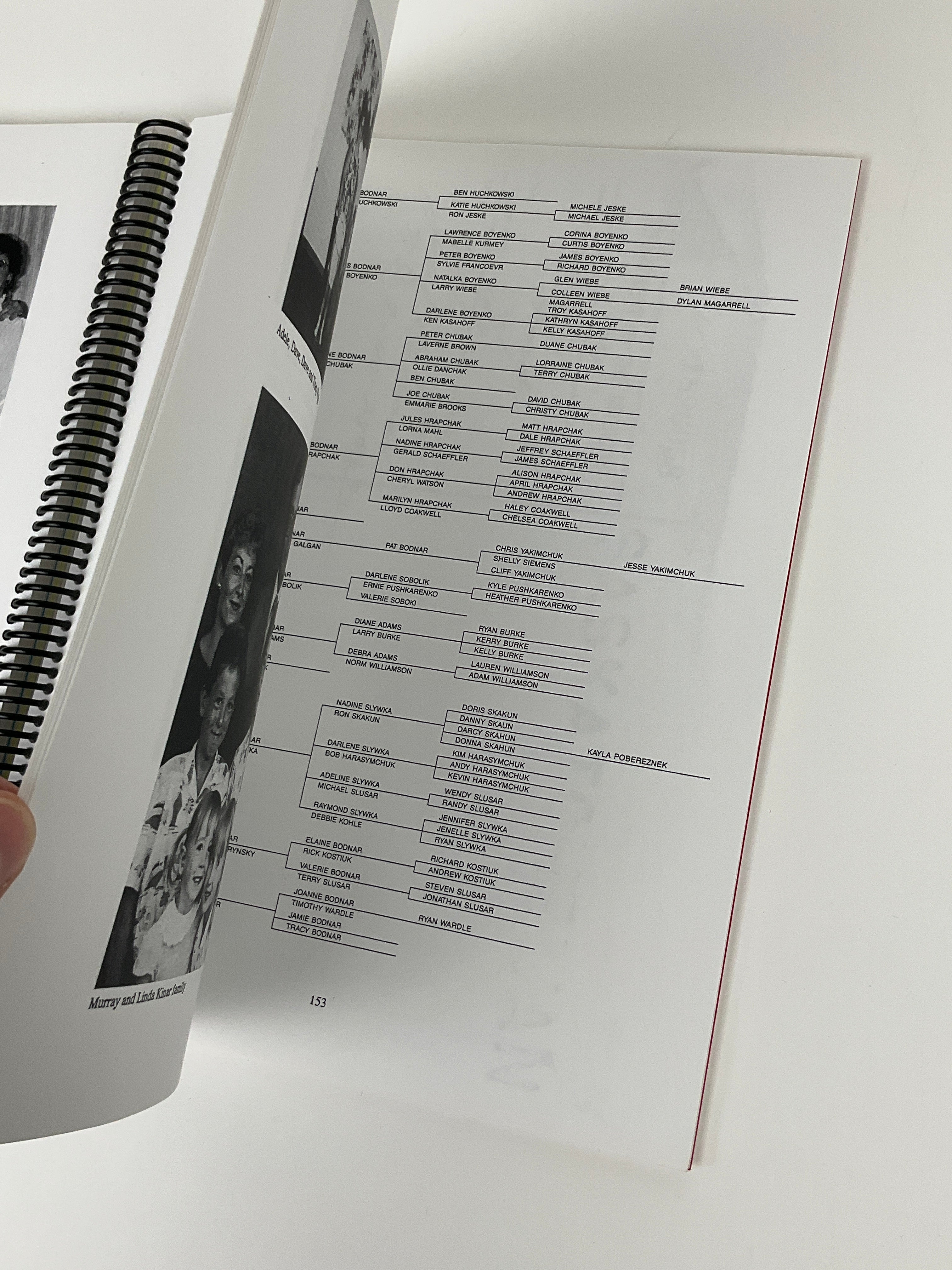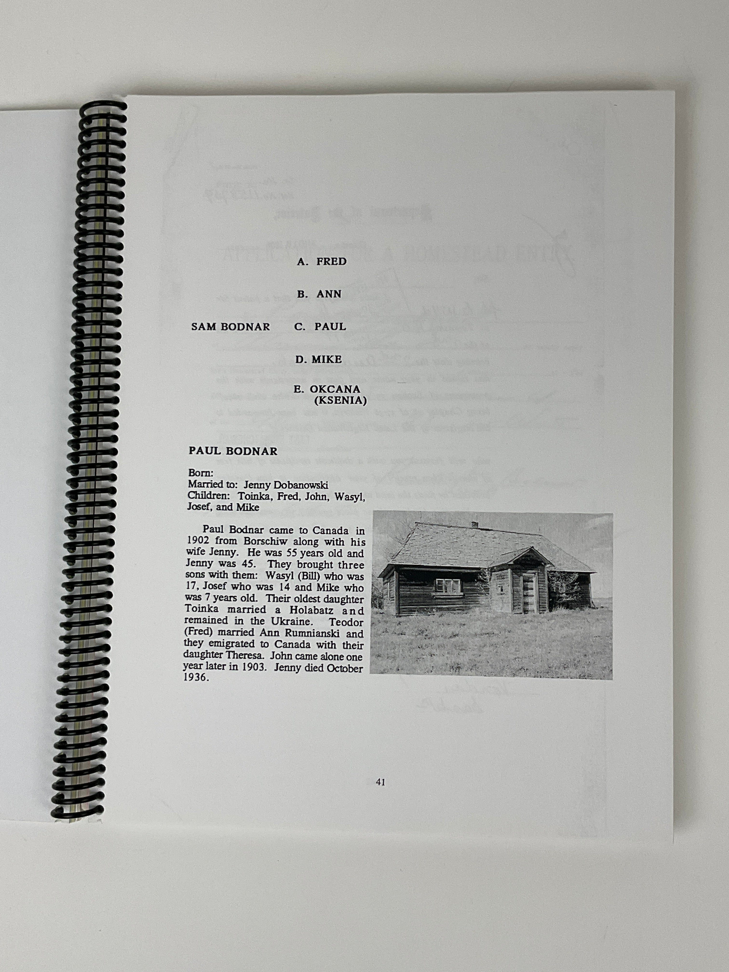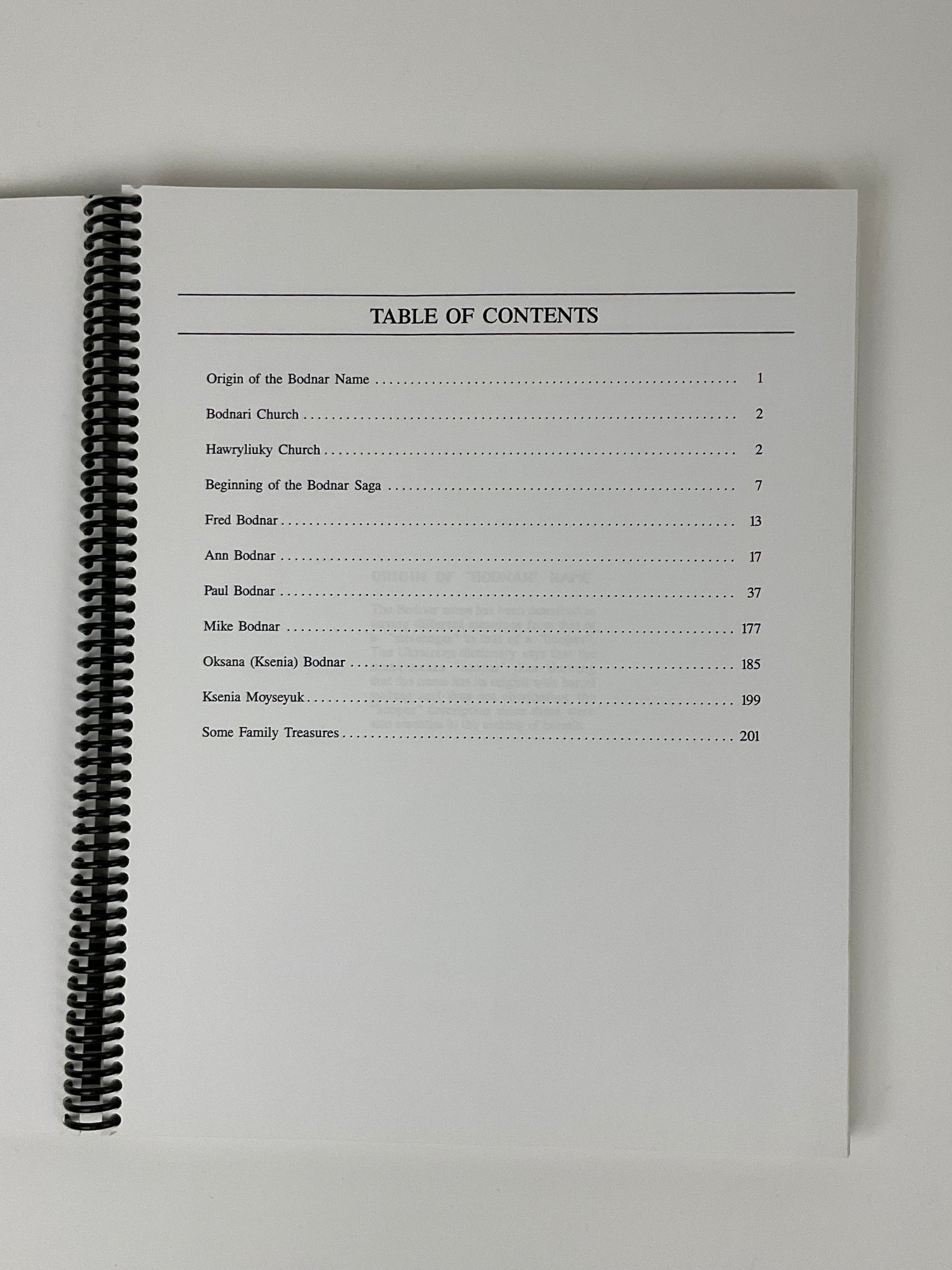 A genealogical account tracing the descendants of Semenko (Sam) Bodnar and his wife, née Schumanski, of Borschiw, Ukraine. The couple's children—Fred, Ann, Paul, Mike, and Okcana—and their descendants form the focus of this family history, particularly those who emigrated to Canada and settled in the Prud’homme district of Saskatchewan. The volume primarily documents the Canadian branch of the Bodnar family across multiple generations.