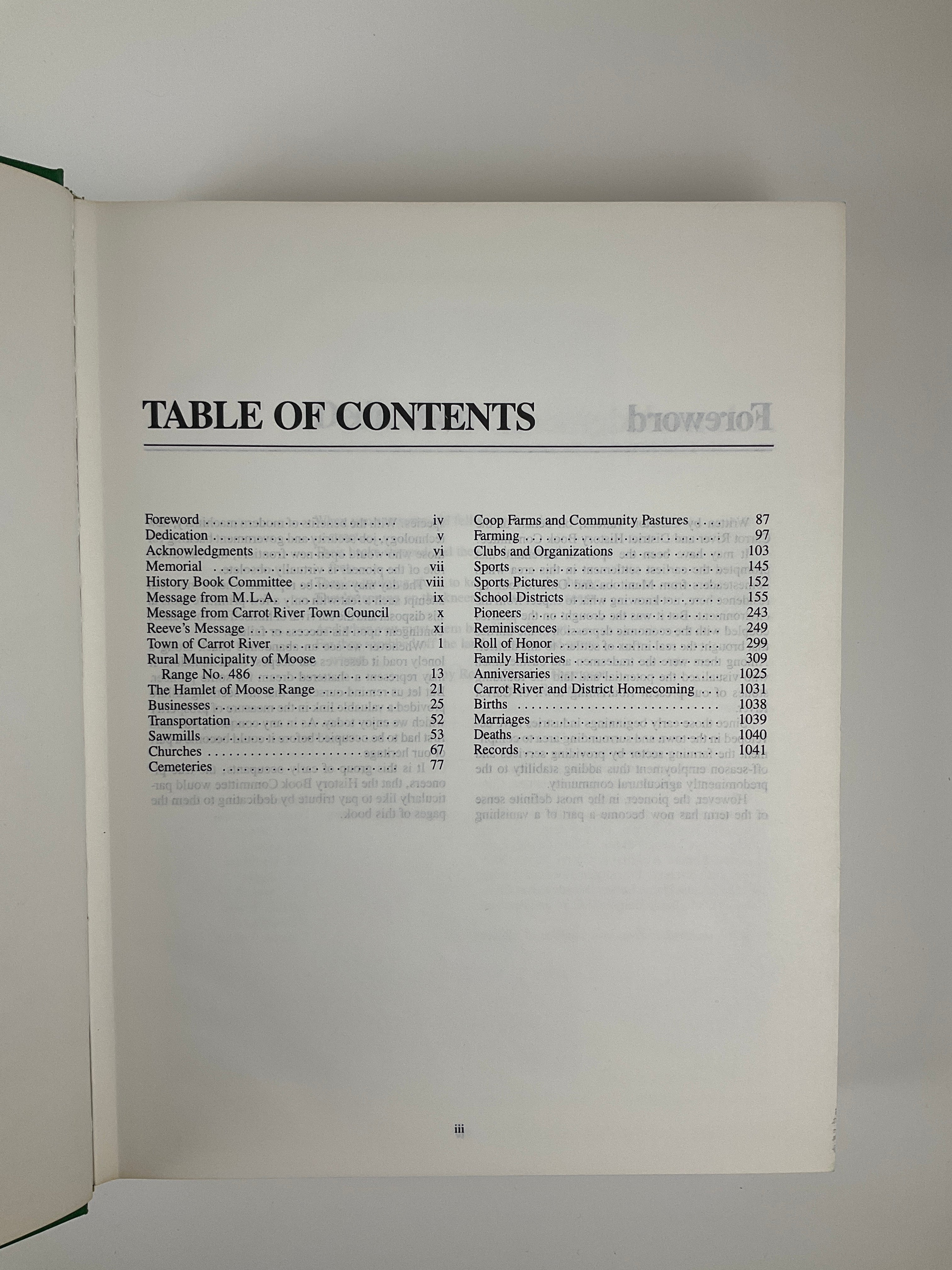 This thick volume contains a history of the Carrot River area in Saskatchewan’s Rural Municipality of Moose Range #486. The book opens with historical overviews of the towns of Moose Range and Carrot River and the R.M. of Moose Range. Topical sections covering local agriculture, businesses, churches, sports teams, and community organizations follow, along with a lengthy section detailing the area’s schools and districts (Bell Boy, Blue Jay, Carrot River, Causeway, Charmfield, Cosmo, Glen Horne, Grassy Run, Hollywood, Huntdale, Jordan River, Labalm, Luing, Meadowcroft, Merryfield, Moose Range, Moosedale, Mossy Vale, Papikwan, Pas Trail, Petaigan, Ptarmigan, Ravendale, Reno Hill, Silver Echo, Silver Pine, Smoky Burn, White Clay, and Woodchuck). Family histories contributed by area residents comprise the largest portion of the text, with an Honour Roll appearing at the end. Includes index and a 40 x 55 cm (16 x 21.5 in) fold-out map. Laid in is a typed note asking purchasers to ensure that no pages are missing.