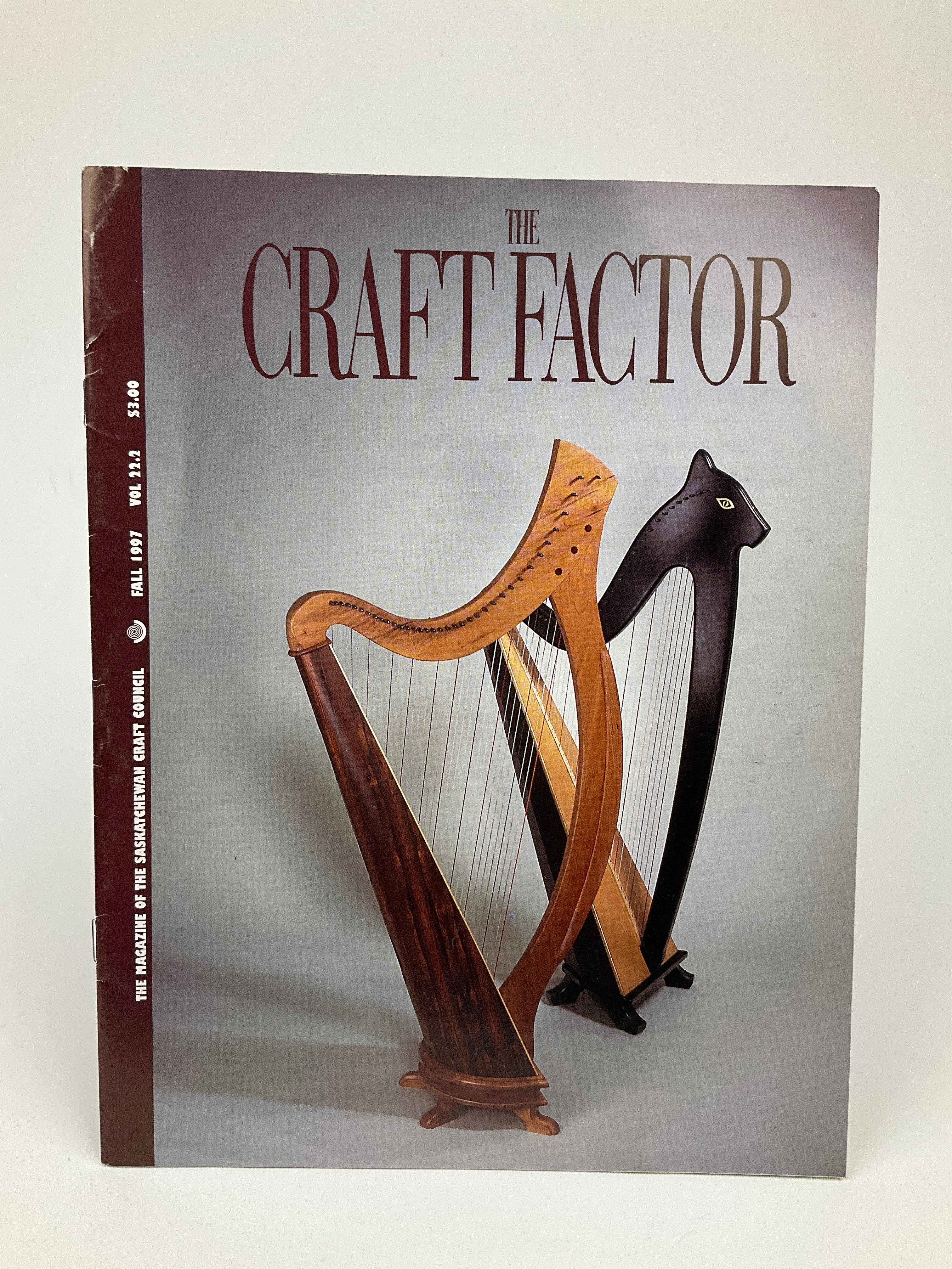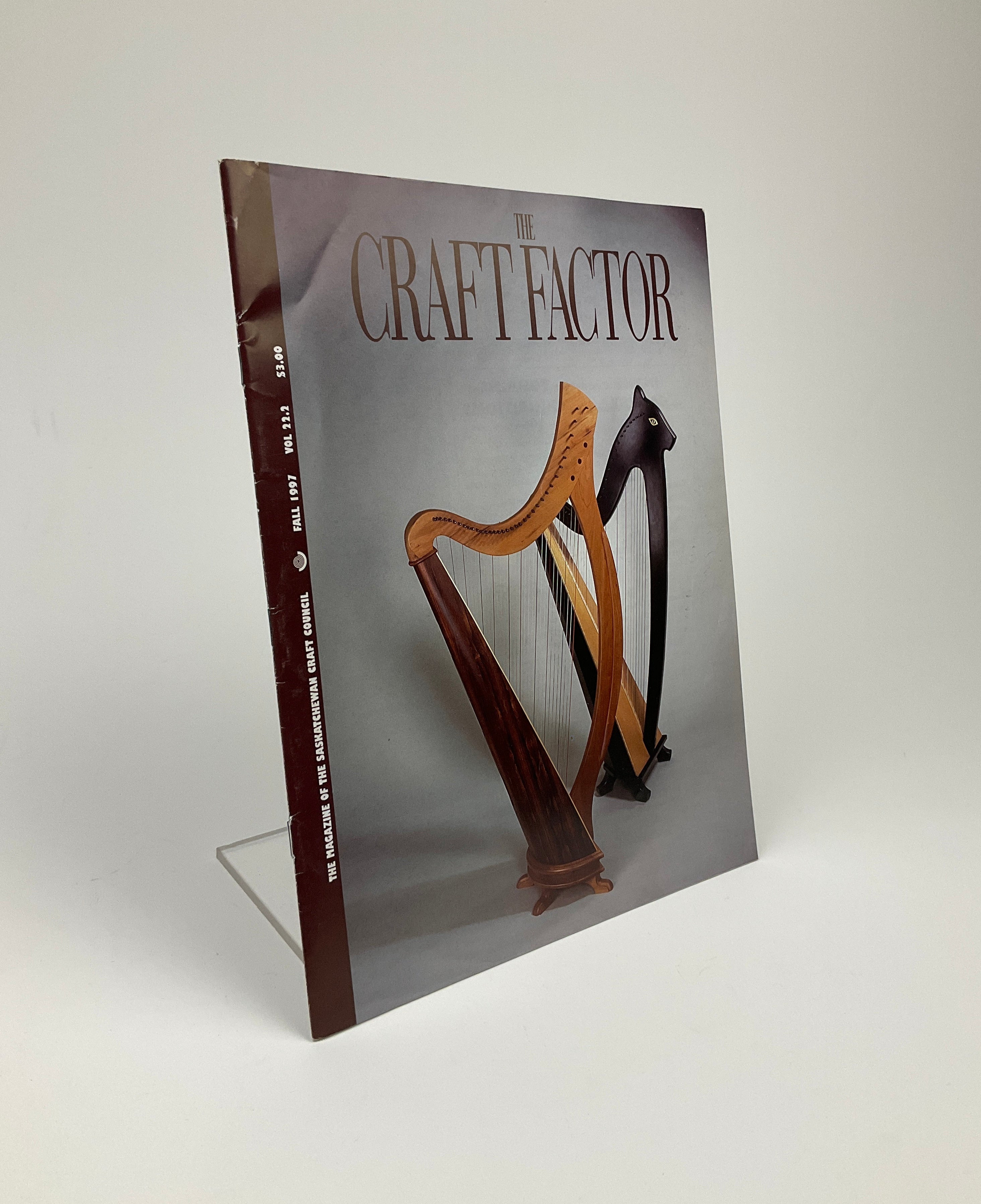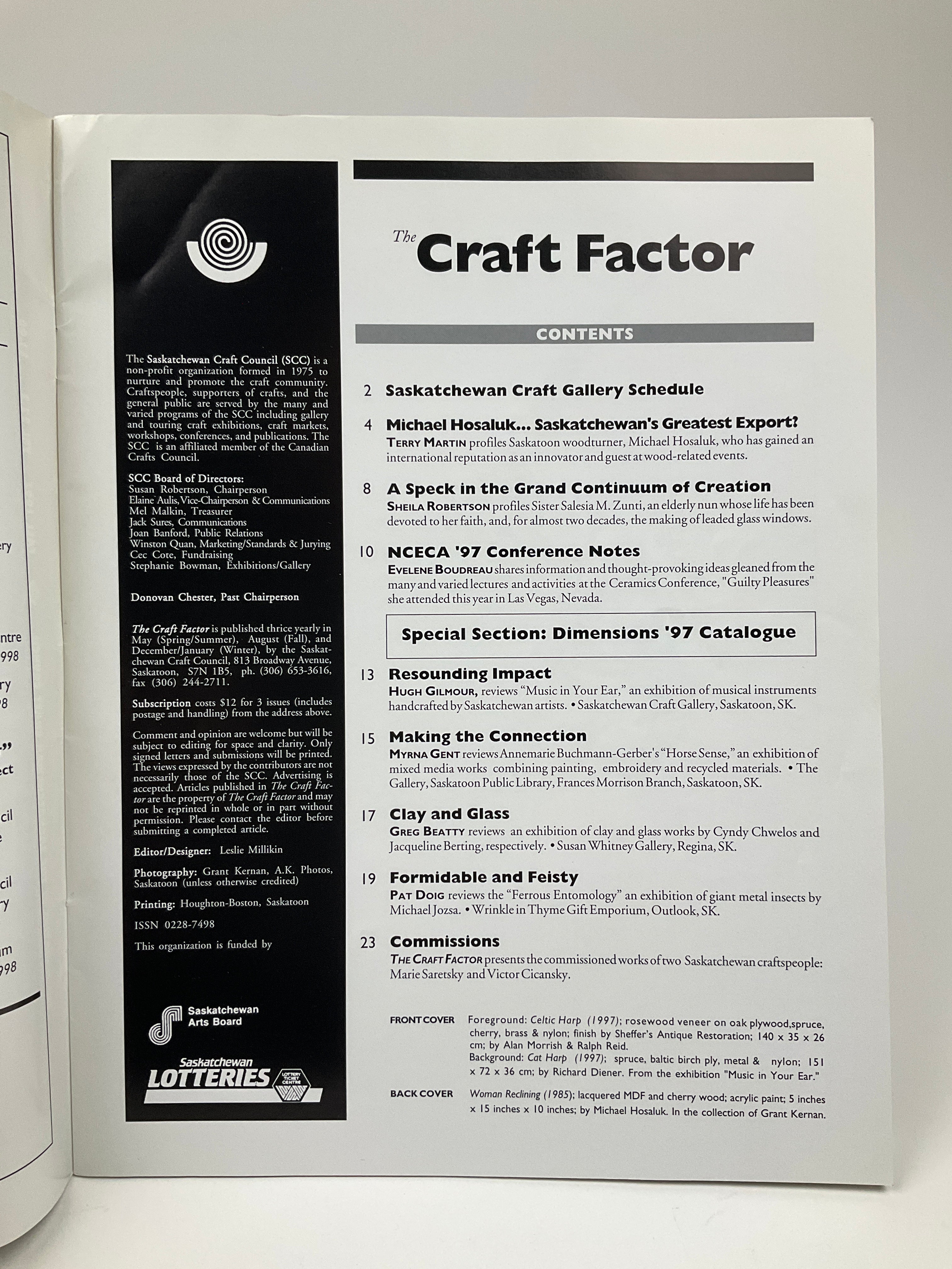 Published from 1974 to 2004 by the Saskatchewan Craft Council, “The Craft Factor” served as an ambassador and forum for craft in the province. Issues typically include interviews or profiles of Saskatchewan craftspeople, reviews or synopses of exhibitions and works, and analyses or perspectives on various aspects of crafting and crafting culture. Article tones range from personal to philosophical, and color images appear throughout. This issue features an exhibition catalogue from the Saskatchewan Craft Council’s “Dimensions ‘97” touring exhibit and a profile of woodturner Michael Hosaluk.