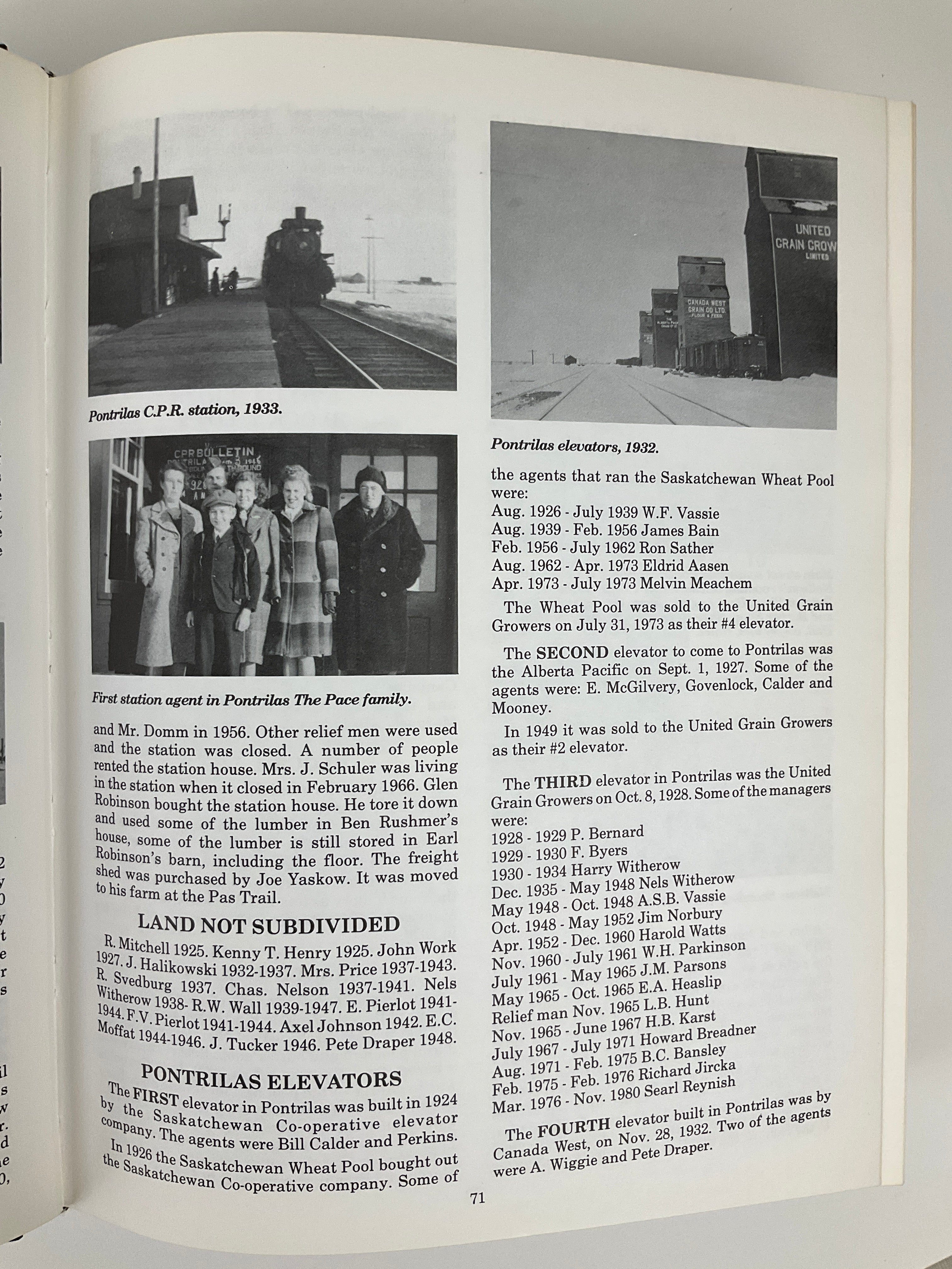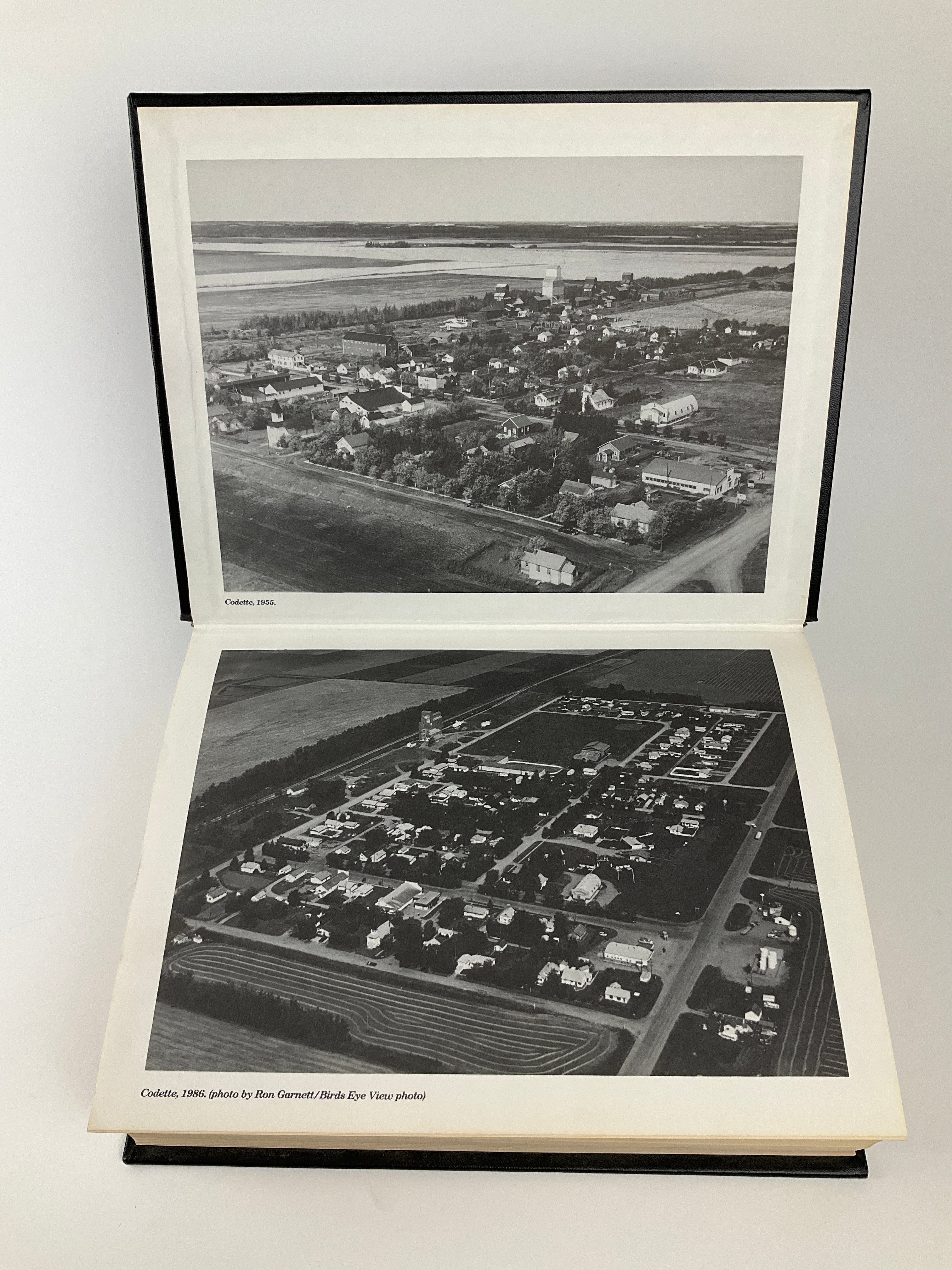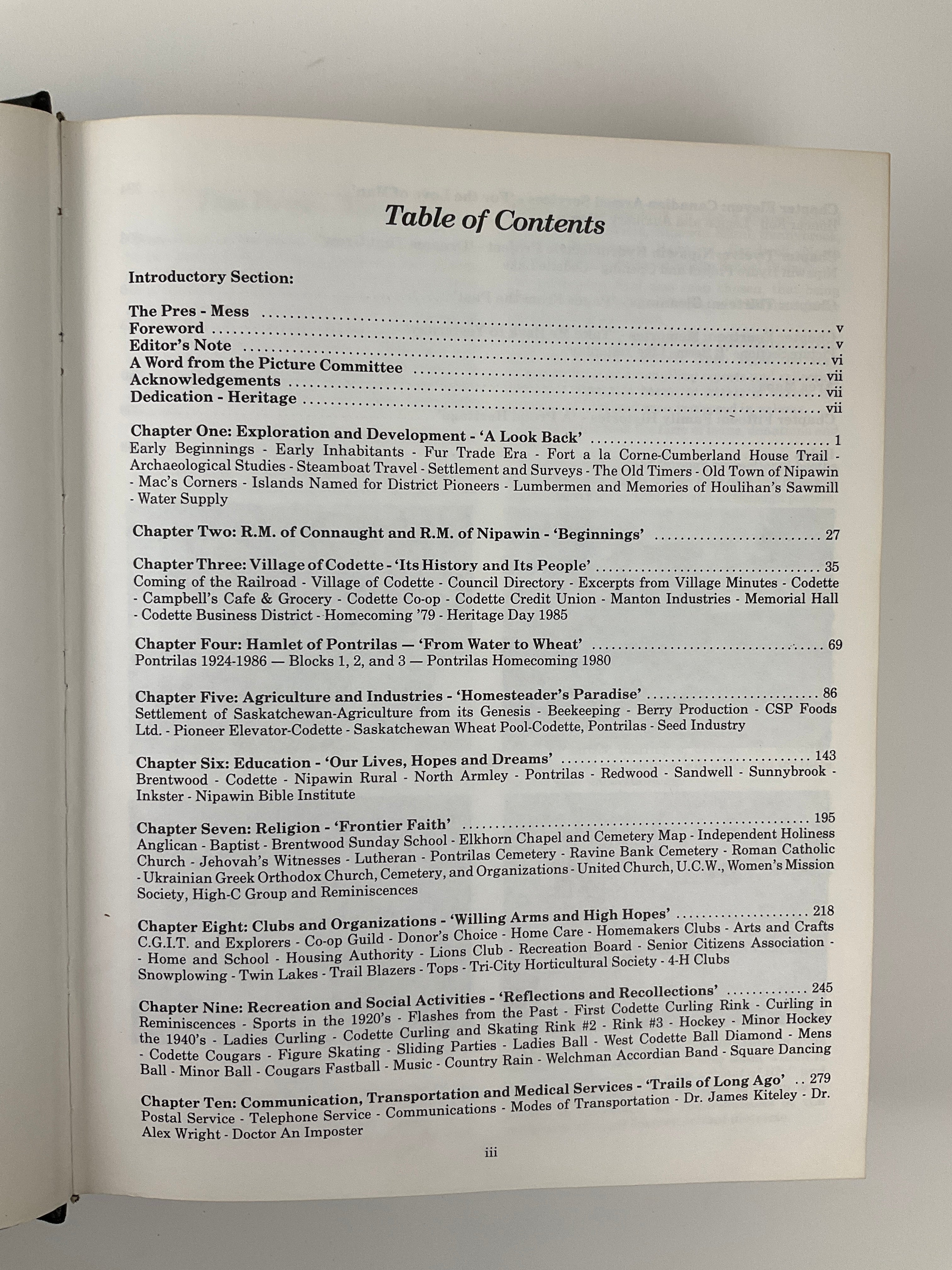 This large, thick volume contains a community history of the region surrounding the village of Codette and former town of Pontrilas (in Saskatchewan’s Rural Municipalities of Nipawin #487 and Connaught #457). The book opens with a historical overview of the area’s settlement and the founding of Codette and Pontrilas, as well as topical chapters on local schools (incl. Nipawin Bible Institute), churches (incl. burial listings for Elkhill Cemetery #1 and Pontrilas Cemetery, clubs, recreation and sports, and municipal services. An Honour Roll and chapter on the Nipawin Hydroelectric Station are also included. The balance of the volume contains family histories contributed by area residents. Laid in is one printed page of “Photos Missed When Compiling Book.” Includes index.
