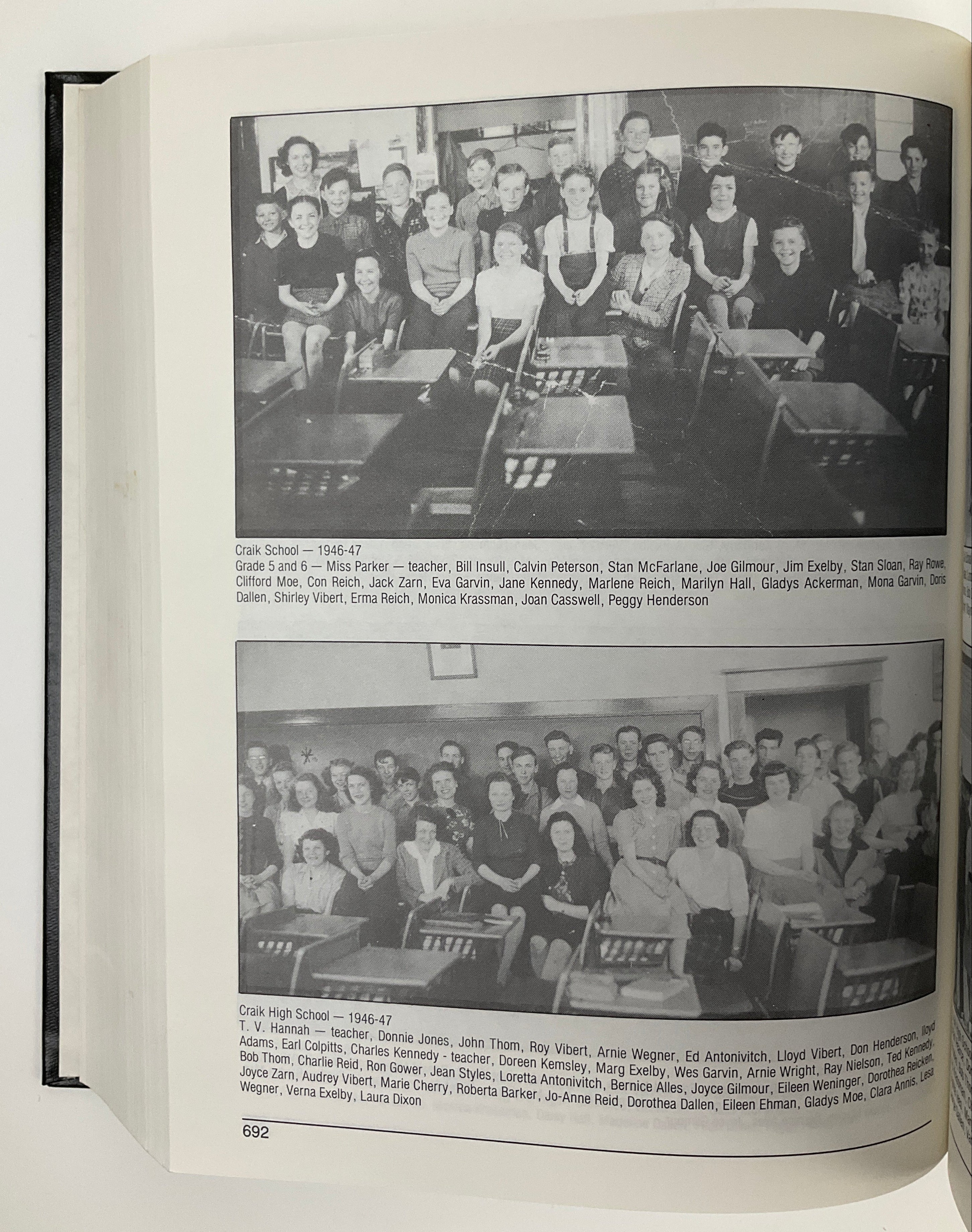This large book comprises Vol. 1 of a community history of the town of Craik and its surrounding area (in Saskatchewan’s Rural Municipality of Craik #222). The first half of the book contains family histories contributed by area residents. The second half includes sections about local involvement in both world wars (photographic Honour Roll, reminiscences of war brides) as well as chapters covering local churches, agriculture, organizations, sports teams, and recreation. In addition, there is a lengthy chapter that compiles the histories of the following schools: Ames, Antelope, Aylesbury, Banbury, Barrett, Beacon, Bennett, Craik, Dixmude, Eclipse, Eildon, Erie, Fargo, Foxbury, Hallville, Holmsdale, Hustlers, Parkhill, Pilgrim, Rose Hill, Sheppard, Squaw Creek, Sunkist, Watkins, and Willow Bluff. Includes index and township maps with names of each section’s first owner.