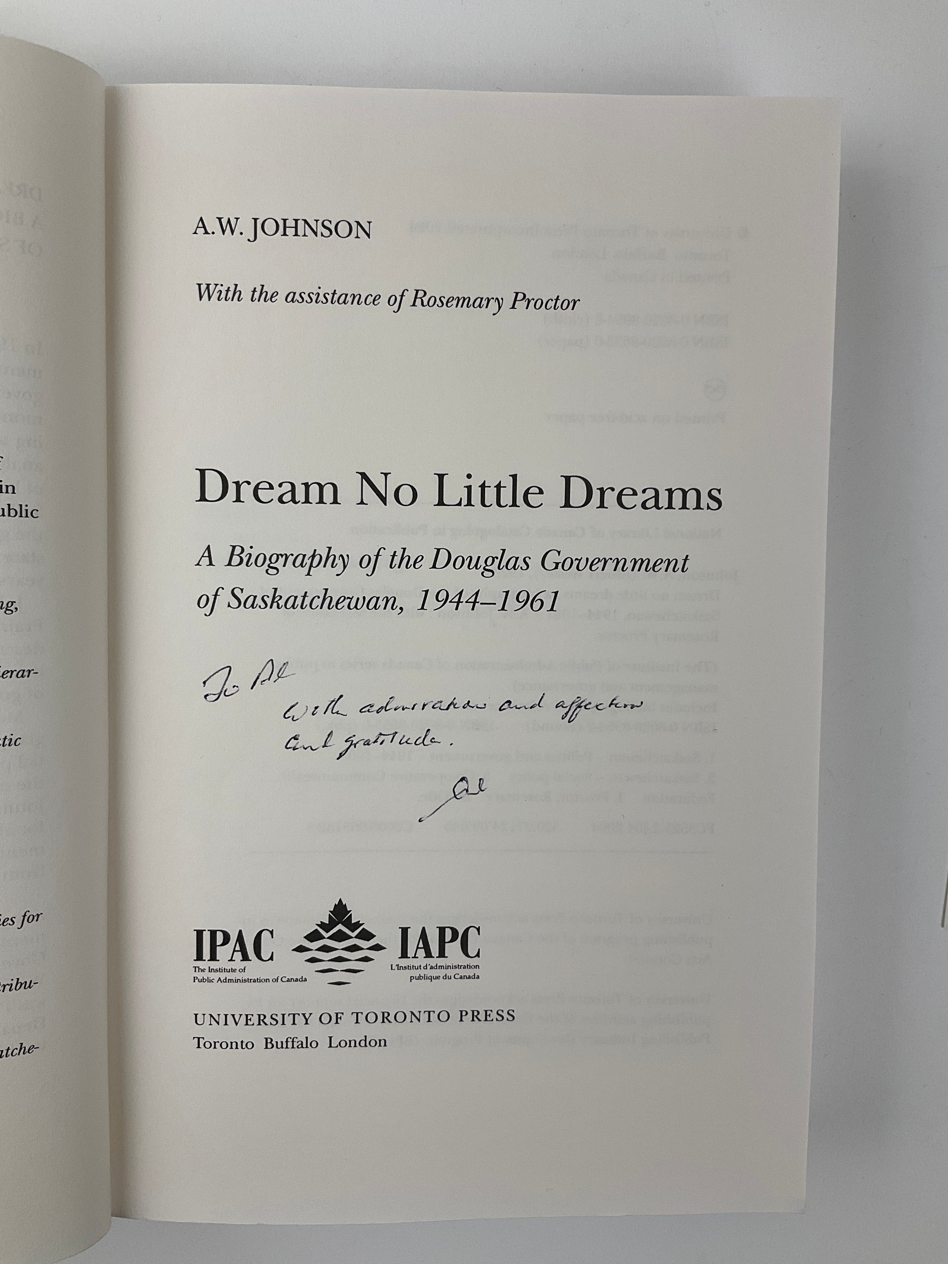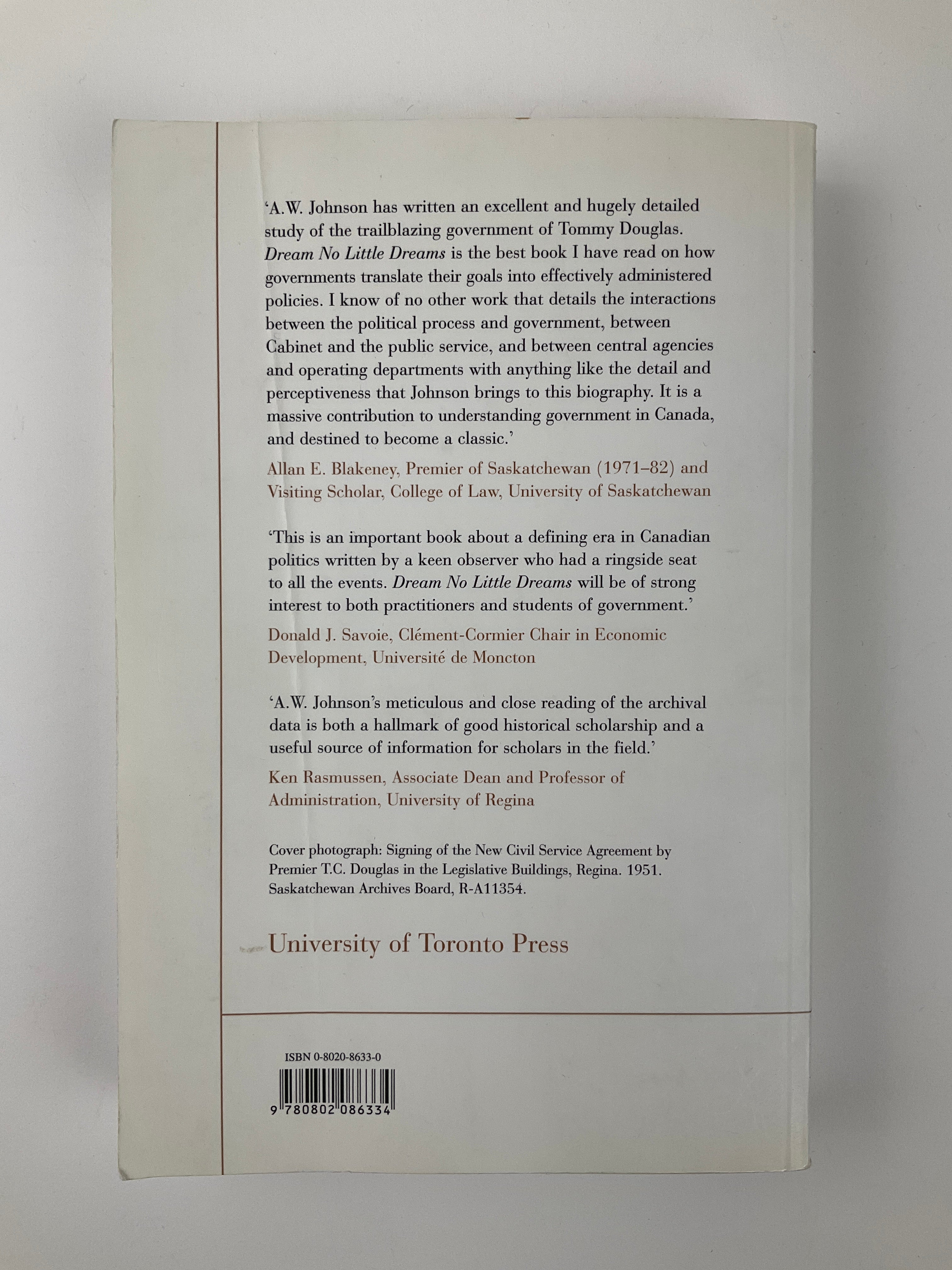 In 1944, the people of Saskatchewan elected the first socialist government in North America. Dream No Little Dreams tells the story of that government, led by Tommy Douglas and the Cooperative Commonwealth Federation (CCF), which later became the New Democratic Party (NDP). The book is both a history of the CCF and a look at how the government worked from the inside. A.W. Johnson, who was a senior public servant during most of Douglas’s time in office, explains the government’s main goal: to change the role of the state. He shows how they worked toward this goal over 17 years.