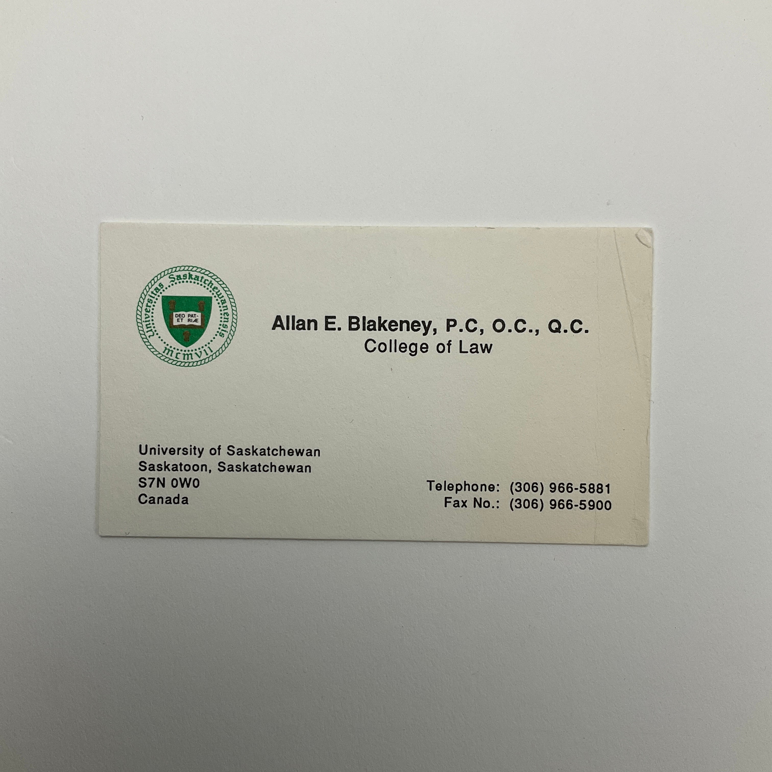 Laid-in - Allan E. Blakeney, University Of Saskatchewan, College Of Law, business card.