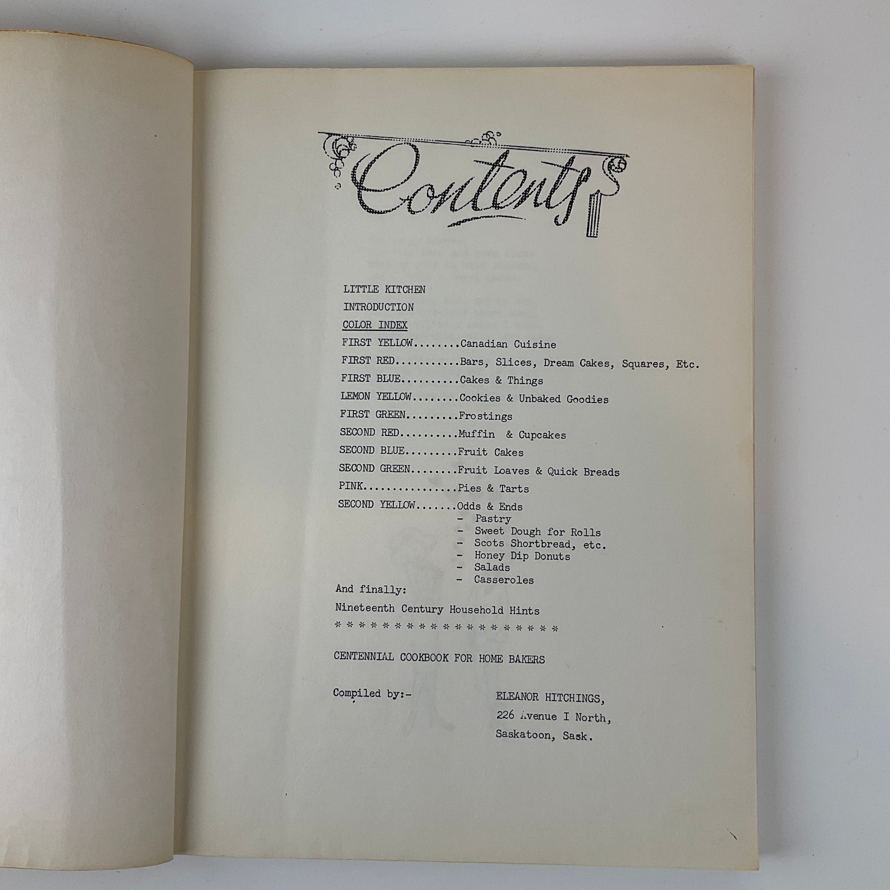 Eleanor Hitchings (1917-1999) worked for the Saskatoon Construction Association for 25 years, rising to the position of Executive Director. In 1967 she compiled this cookbook to raise money to travel from Saskatoon to Expo ’67 in Montreal. While the first printing ran 250 copies, Hitchings went on to sell more than 5000 copies of her cookbook (to individual buyers as well as to Eatons, The Bay, the Co-Op, and local Saskatoon stores). Intended to celebrate Canada’s history and geographic diversity, the cookbook includes contemporary and historical baking recipes from across the country. From Pumpkin Pie to Tomato Soup Cake (“try it, it’s good!”), the volume preserves recipes and baking hints from the early/mid-1900s.