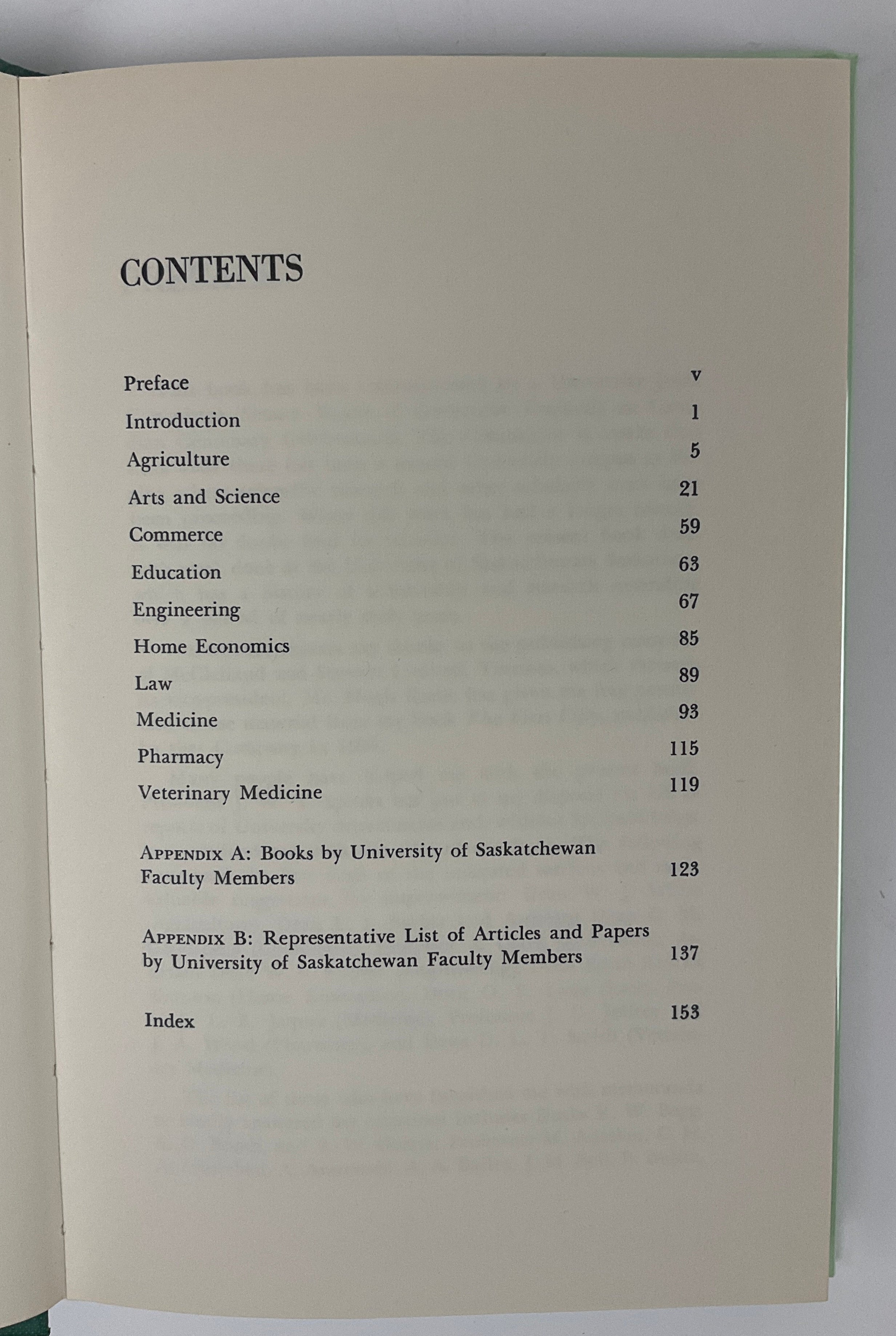 In this volume, Carlyle King – then-Dean of Academic Services at the University of Saskatchewan – enumerates the research contributions made by University faculty in their respective fields. Organized by college, the book’s chapters summarize major publications, discoveries, and innovations by University of Saskatchewan academics. From E. B. Moysey’s work on effective windbreaks for prairie climates in Engineering to Richard Albert Wilson’s book “The Birth of Language” in English, King reveals the breadth of research conducted on campus. Effectively a prospectus of the University’s research achievements in its first 55 years, King’s book underscores the local and international relevance of the University's research. No publication date, but the Preface’s 1967 dating suggests a publication year of 1967 or later.