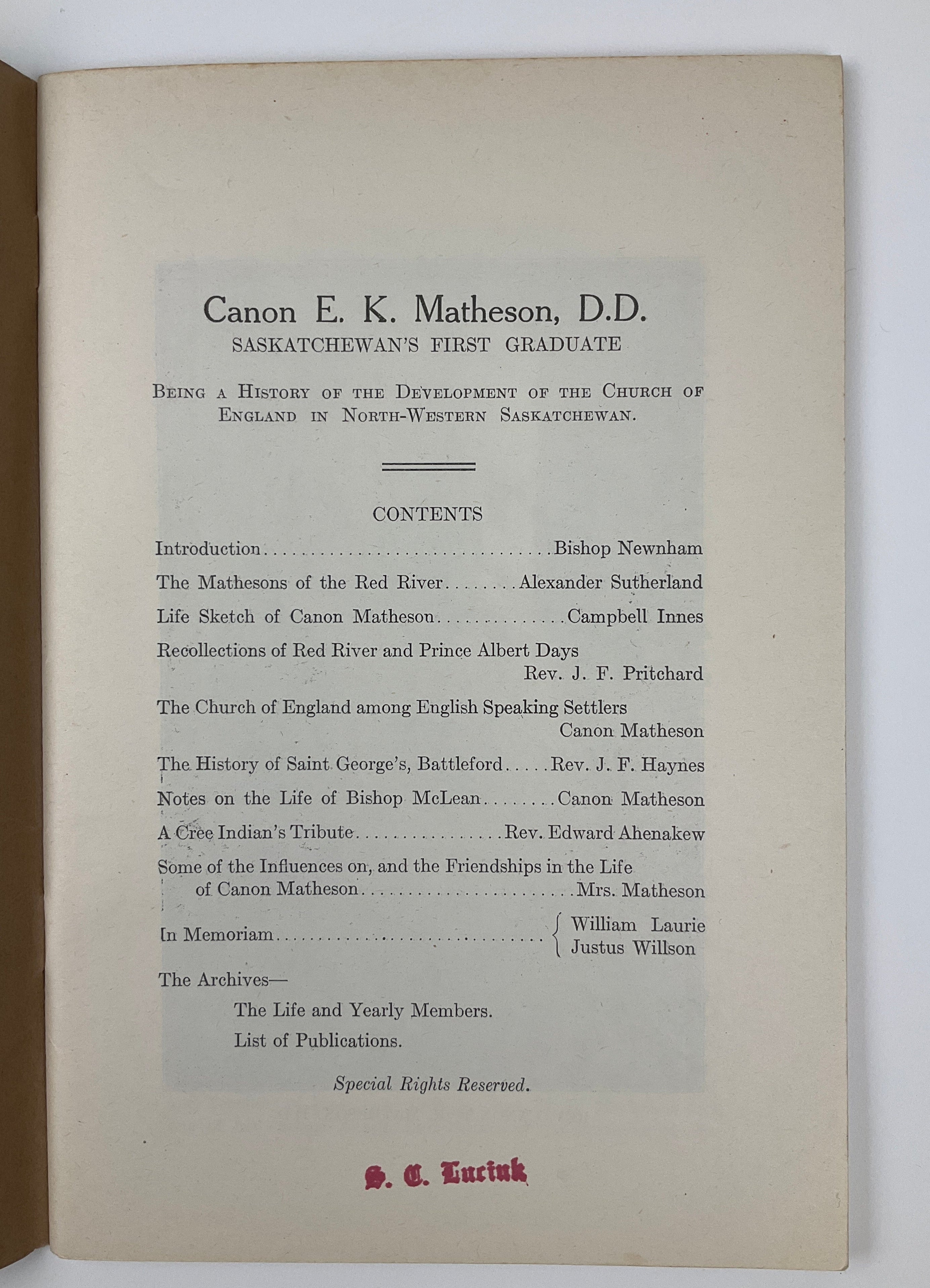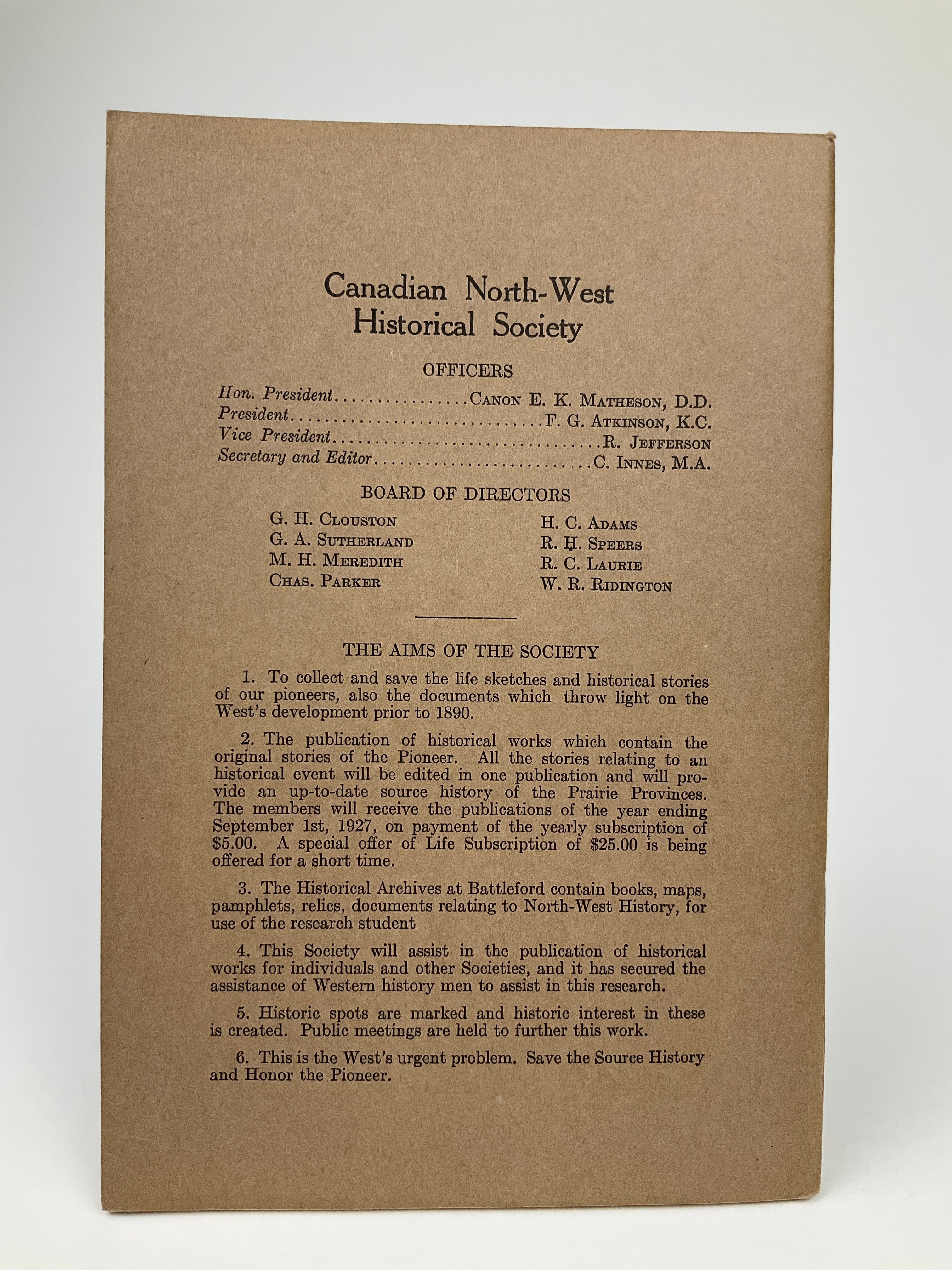 Canadian North-West Historical Society Publications Vol. 1 No. 5. The Canadian North-West Historical Society was founded in 1924 (as the Battleford Historical Society) to preserve the Battleford area’s history, in part by publishing accounts of life in the region prior to 1890. This volume contains an account of Cree life and culture by Robert Jefferson, a British immigrant who served as a teacher on Red Pheasant’s reserve and a farm instructor on Poundmaker’s reserve in the 1870s and 1880s. Jefferson chronicles his journey to the North-West, offers anecdotal and ethnographic observations on Cree society, and describes Indigenous-settler relations in the wake of treaty signings. The latter third of the book provides a sympathetic eyewitness account of the 1884/5 Cree uprisings and 1885 North-West Resistance, including encounters with figures such as Poundmaker, Big Bear, and General Middleton. Errata. Peel(3) 1472.