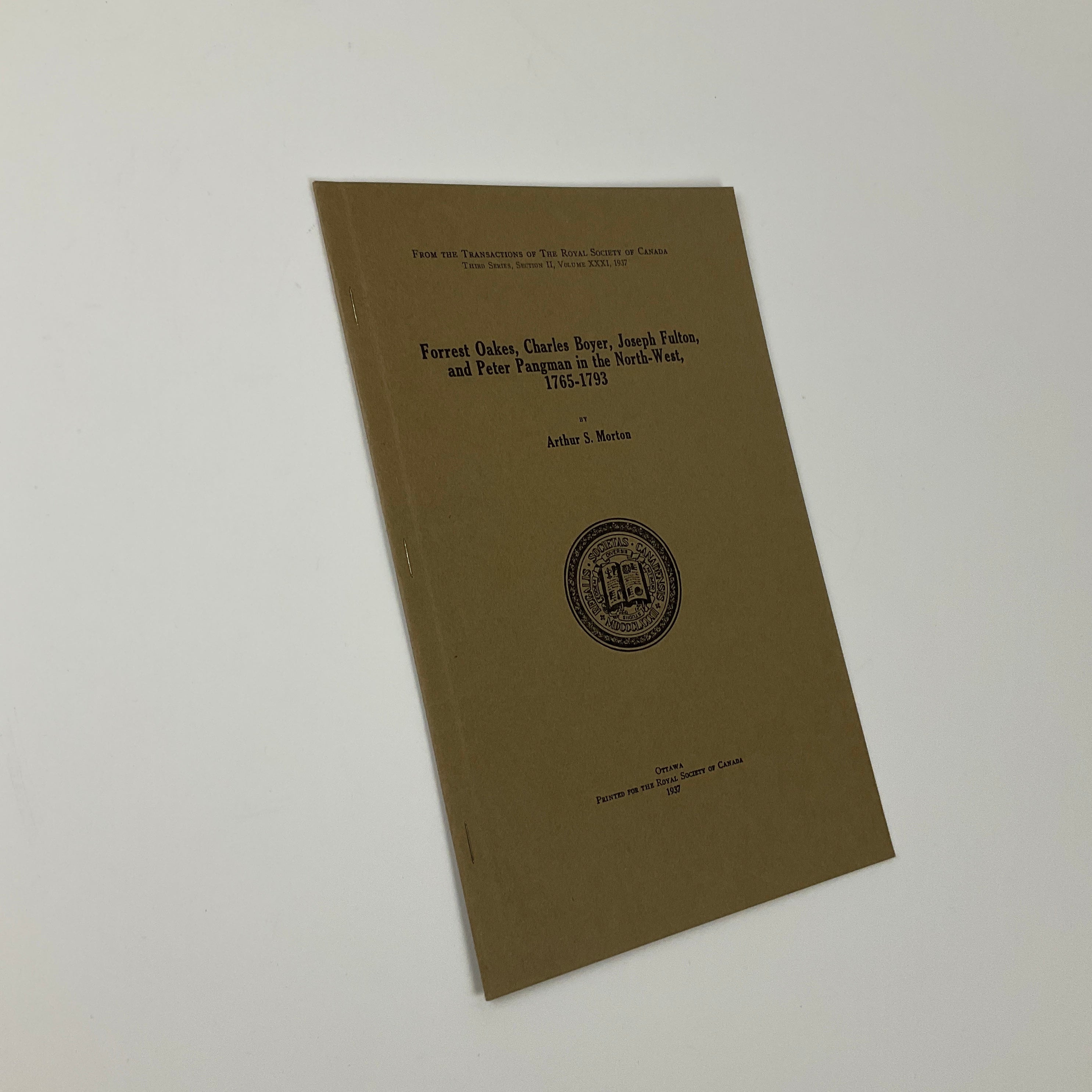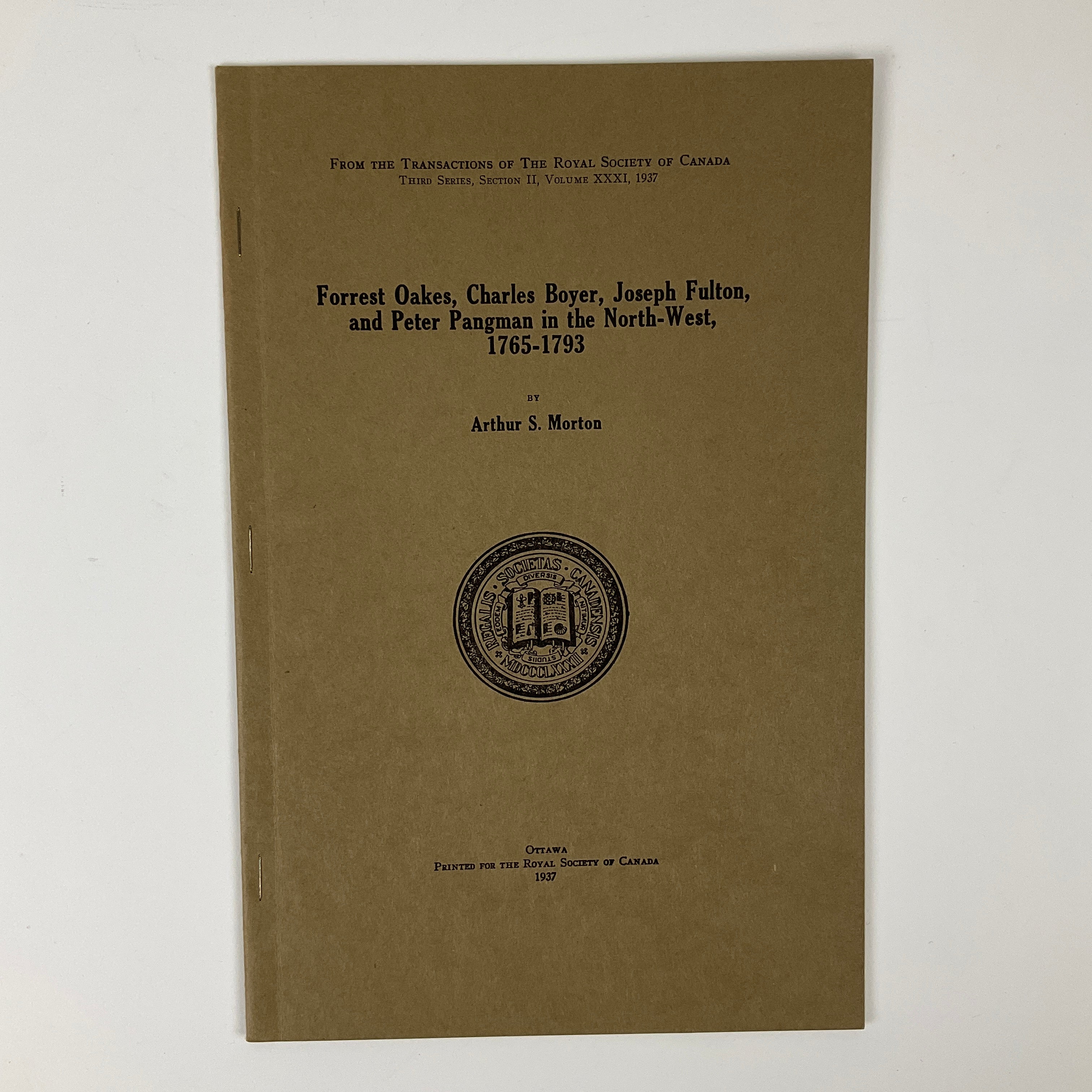 From the Transactions of the Royal Society of Canada, Third Series, Section II, Volume XXXI. Arthur S. Morton was a professor of History at the University of Saskatchewan as well as the University’s Librarian. In this article, he attempts to trace the histories of four early fur traders in the North-West who formed partnerships with one another: Forrest Oakes, Charles Boyer, Joseph Fulton, and Peter Pangman. Drawing on archival records, Morton describes their movements, business dealings, and interactions with better-known figures and posts. Due to a scarcity of references to the four traders in available sources, Morton’s conclusions sometimes takes the form of hypothesis or conjecture, demonstrating the challenges of early fur trade research. Offprint.