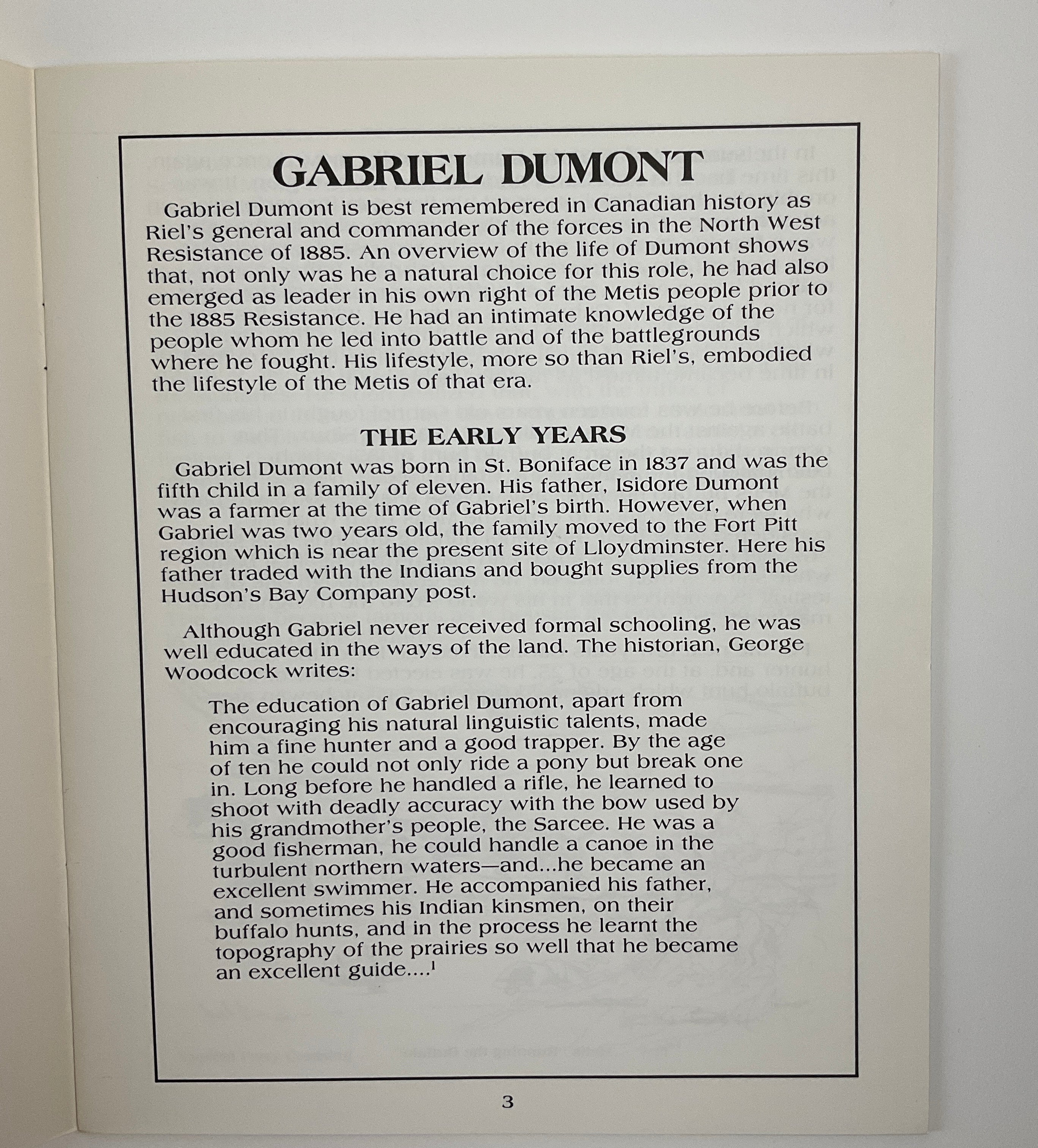 This slim volume (part of the Gabriel Dumont Institute’s “Métis Historical Booklet” series) traces the life of Gabriel Dumont, particularly as it relates to the Red River Métis and the 1885 North-West Resistance. The book covers Dumont’s life amongst the Métis prior to his involvement with Louis Riel as well as his role in the North-West Resistance’s battles. The period before 1885 is particularly well covered, and Dumont is portrayed as a buffalo hunter and trapper as well as a Métis military leader. Large photographs supplement the text throughout.