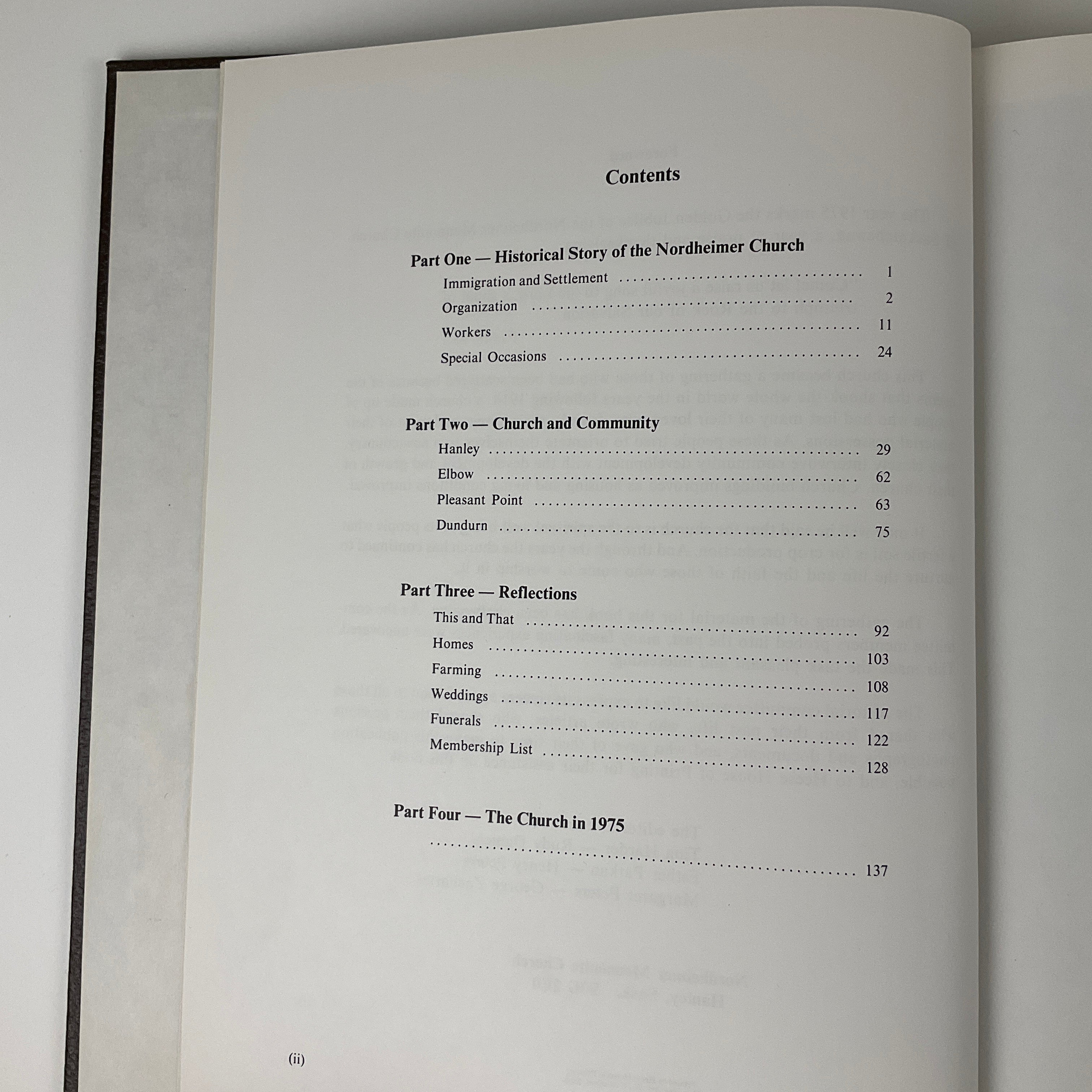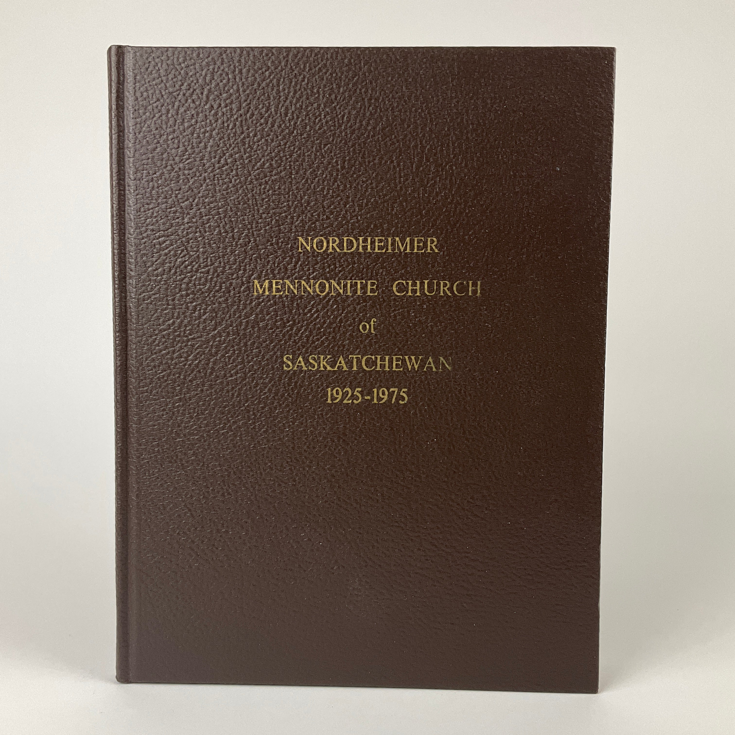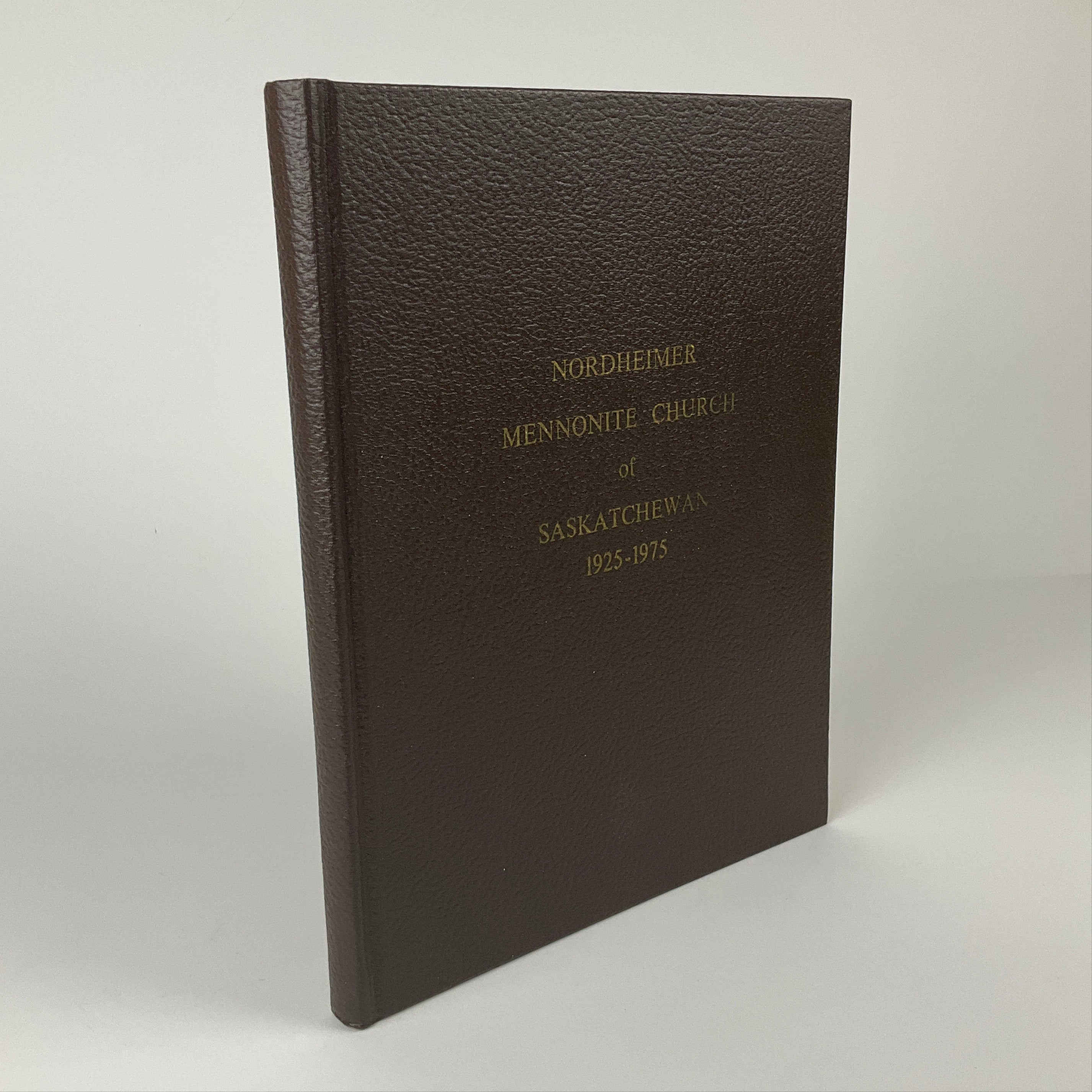This book contains a parish history of Nordheimer Mennonite Church (in Hanley, Saskatchewan) prepared in conjunction with the church’s 1975 Golden Jubilee. The volume describes Mennonite immigration to the Hanley area in the 1920s and the establishment of several Mennonite churches (at Dundurn, Elbow, Hanley, and Pleasant Point). The authors identify church leaders and officials, note milestones and major decisions, and describe congregational activities and community outreach. The latter section of the book contains reminiscences by church members. Includes a church membership list 1925-1975 and lists of burials at Hillside Cemetery and Hanley Cemetery (to 1974). Text in English (primarily) and German. No publication date indicated, but title and contents suggest a publication date of 1975 or later.