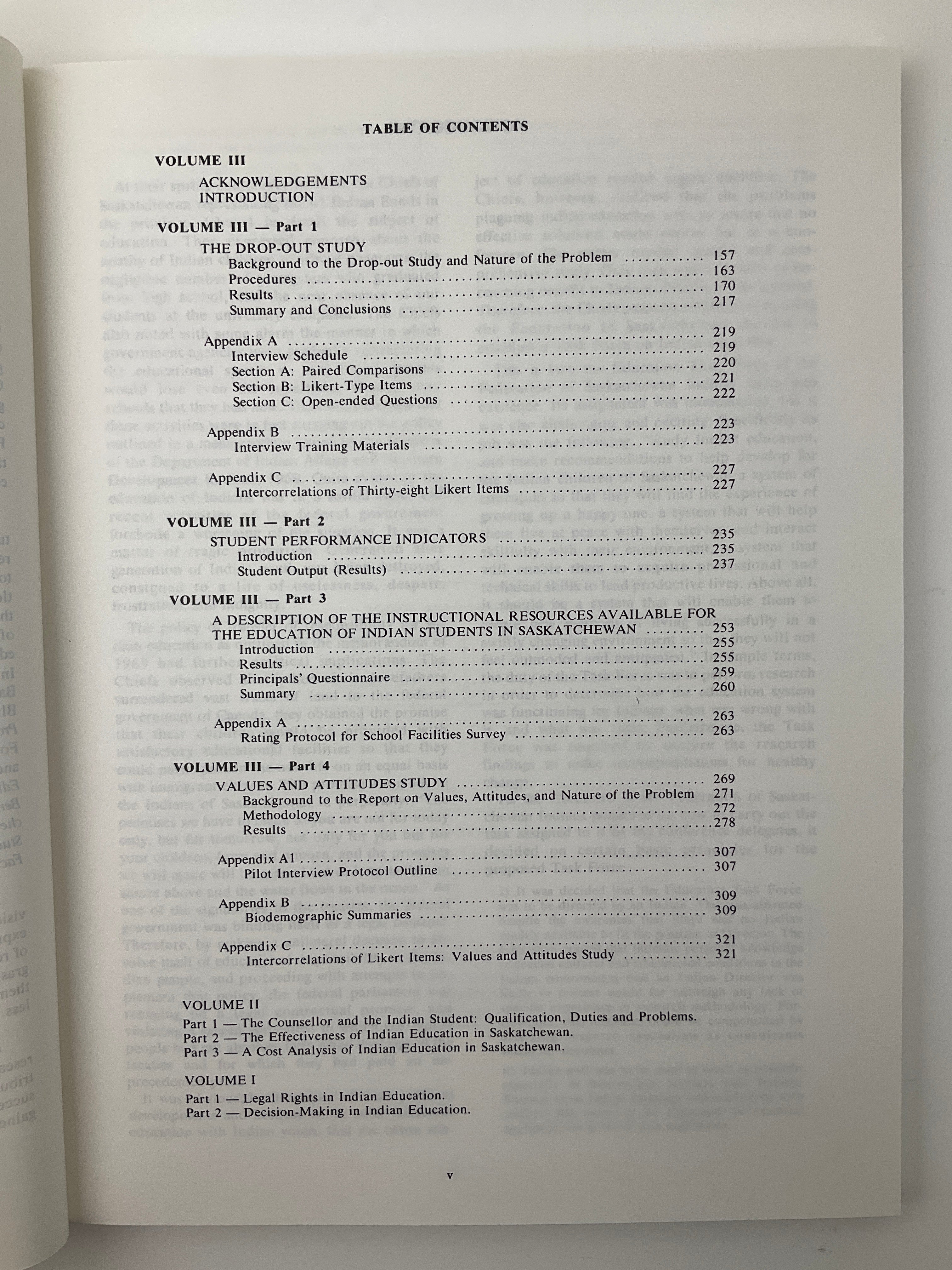 Established by the Federation of Saskatchewan Indians following the 1970 Saskatchewan Chiefs' Conference, the Education Task Force studied and made recommendations regarding First Nations education in the province. The Task Force finished collecting data in Aug. 1972 and published its findings in three volumes the following year. Volume 3 reports on four of the Task Force's nine areas of study: "The Drop-Out Study," "Student Performance Indicators," "A Description of the Instructional Resources Available for the Education of Indian Students in Saskatchewan," and "Values and Attributes Study." Includes 27.5 x 45 cm (11 x 17.5 in.) fold-out chart.