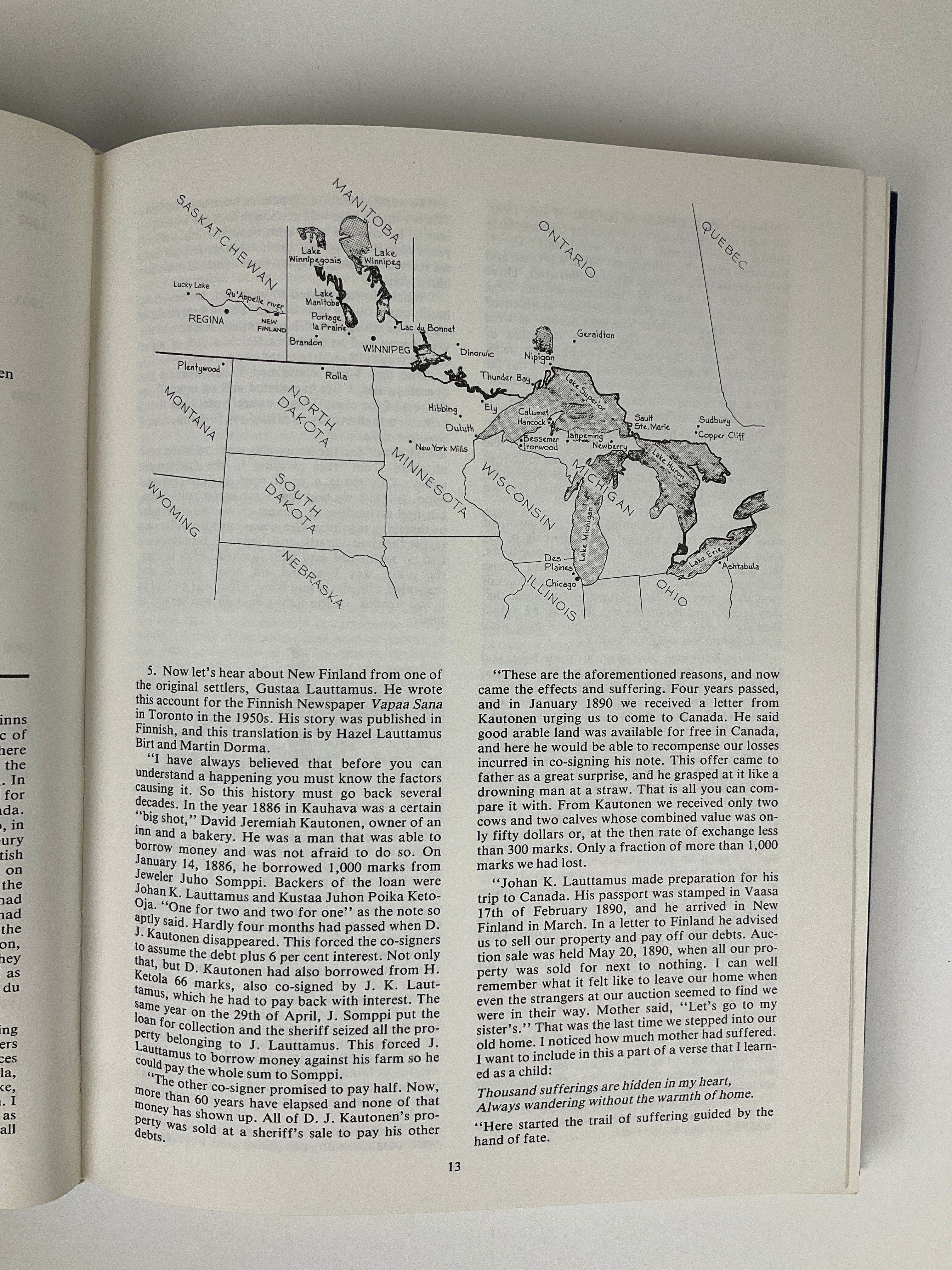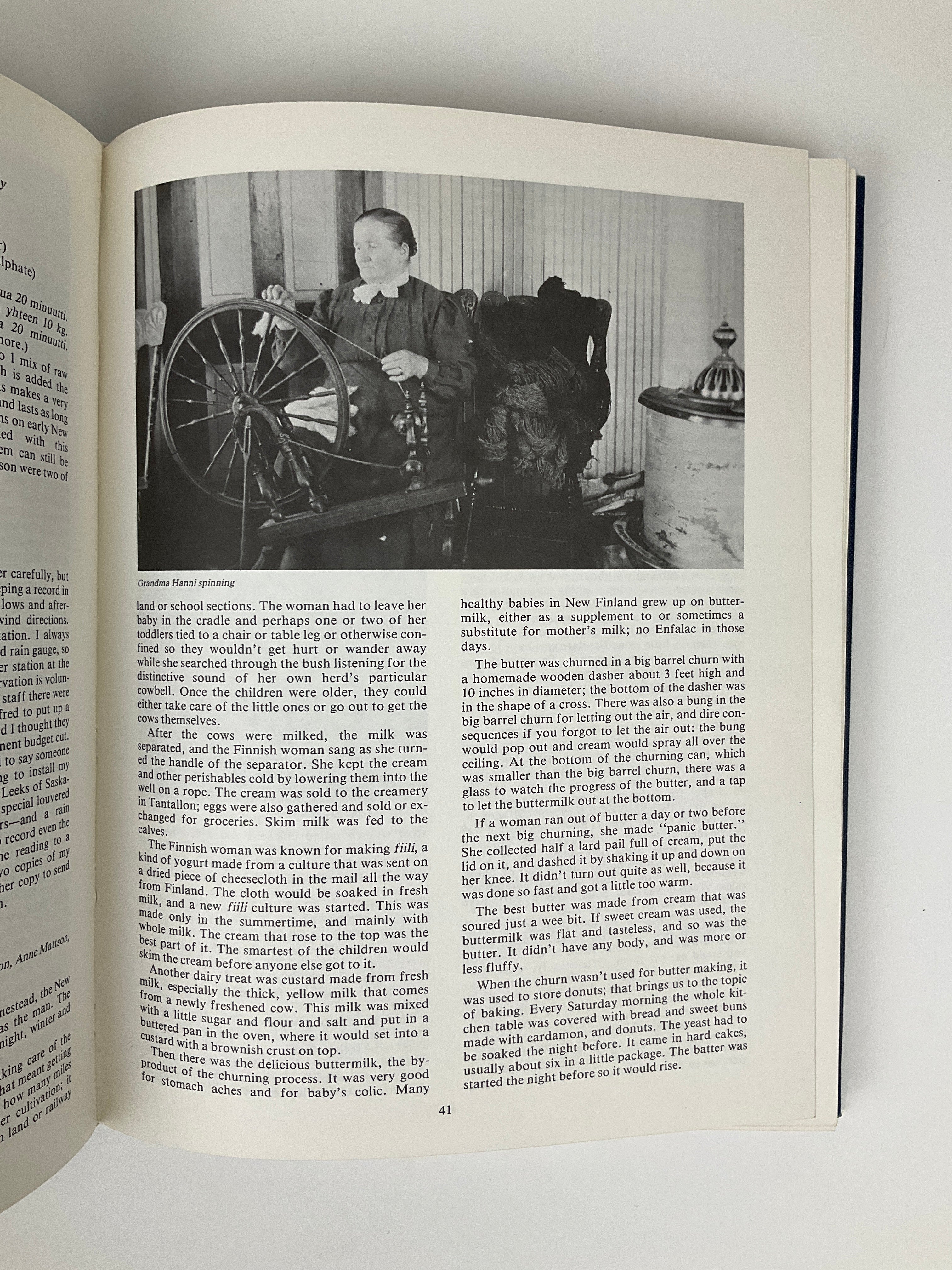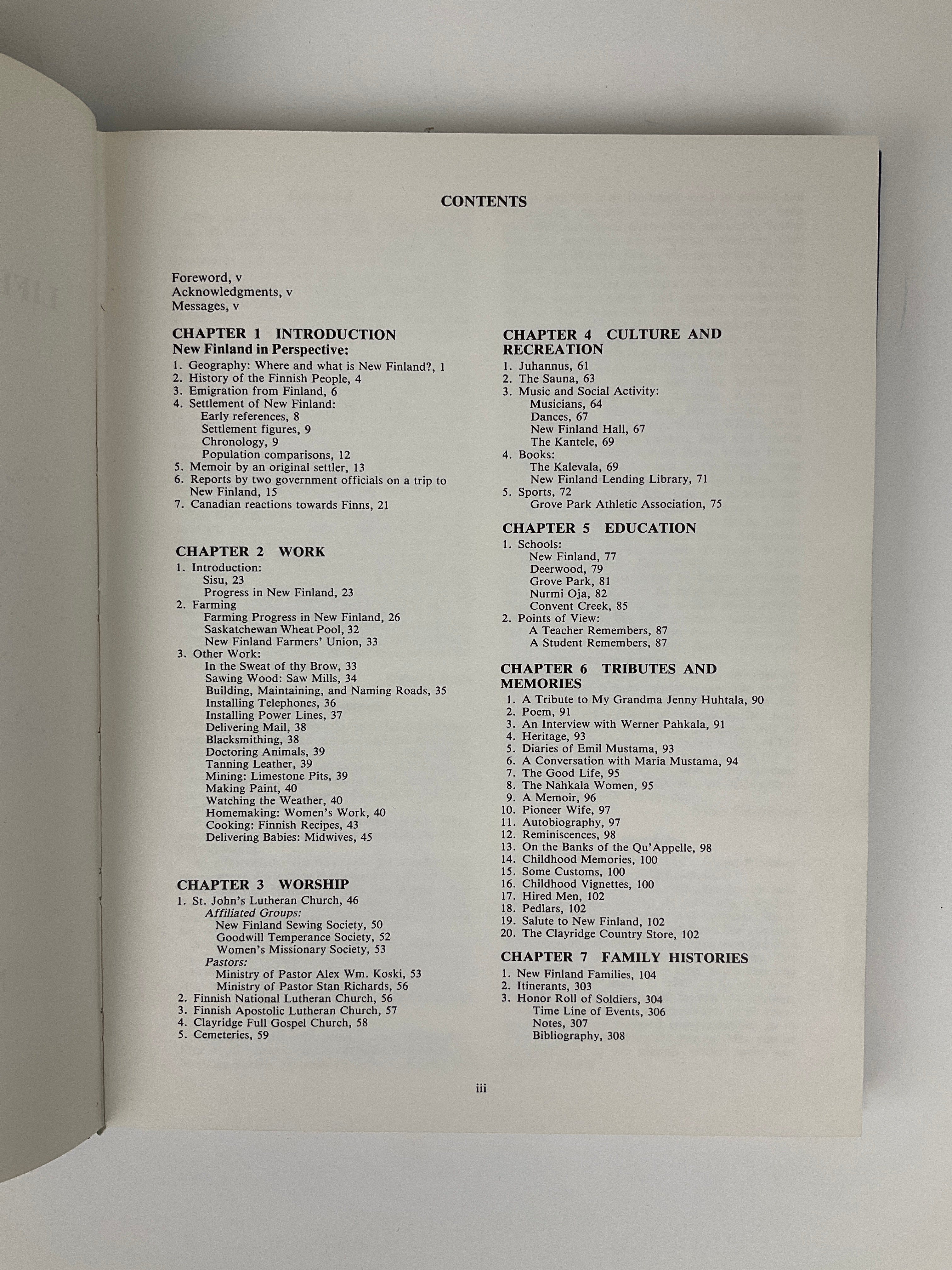 This community history begins with an introduction discussing Finnish immigration to North America, followed by chapters featuring essays on community establishments and institutions—schools, churches, culture and recreation, agriculture, and district-related anecdotes.