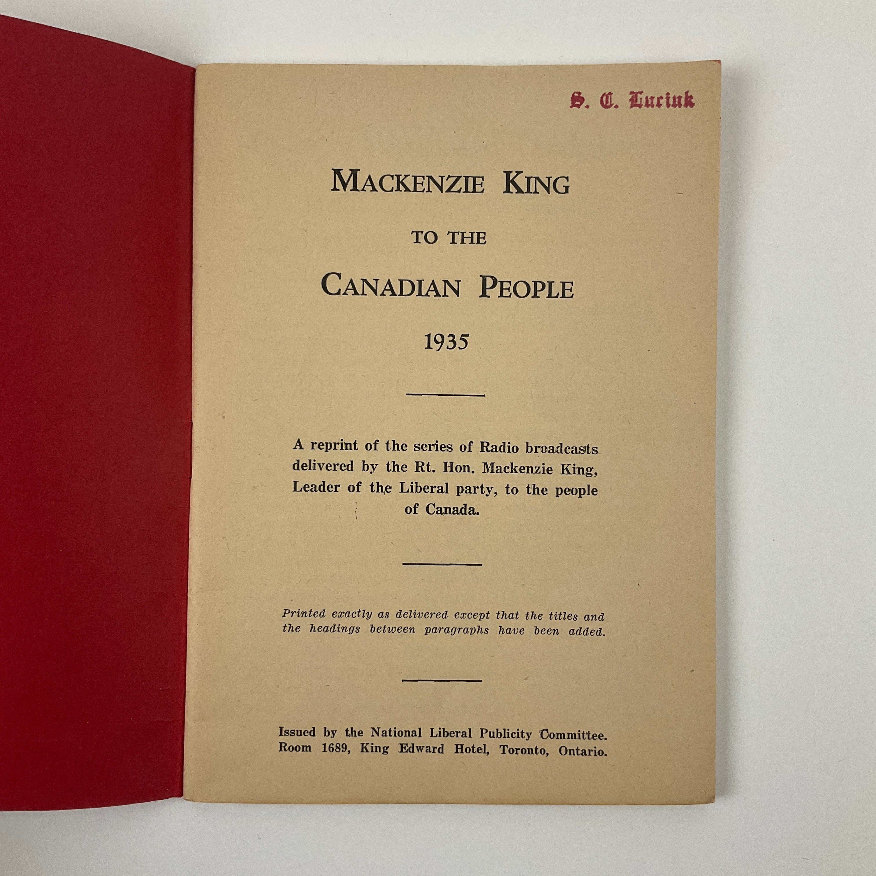 Mackenzie King to the Canadian People 1935 : A Reprint of the Series of Radio Broadcasts Delivered by the Rt. Hon. Mackenzie King, Leader of the Liberal Party, to the People of Canada