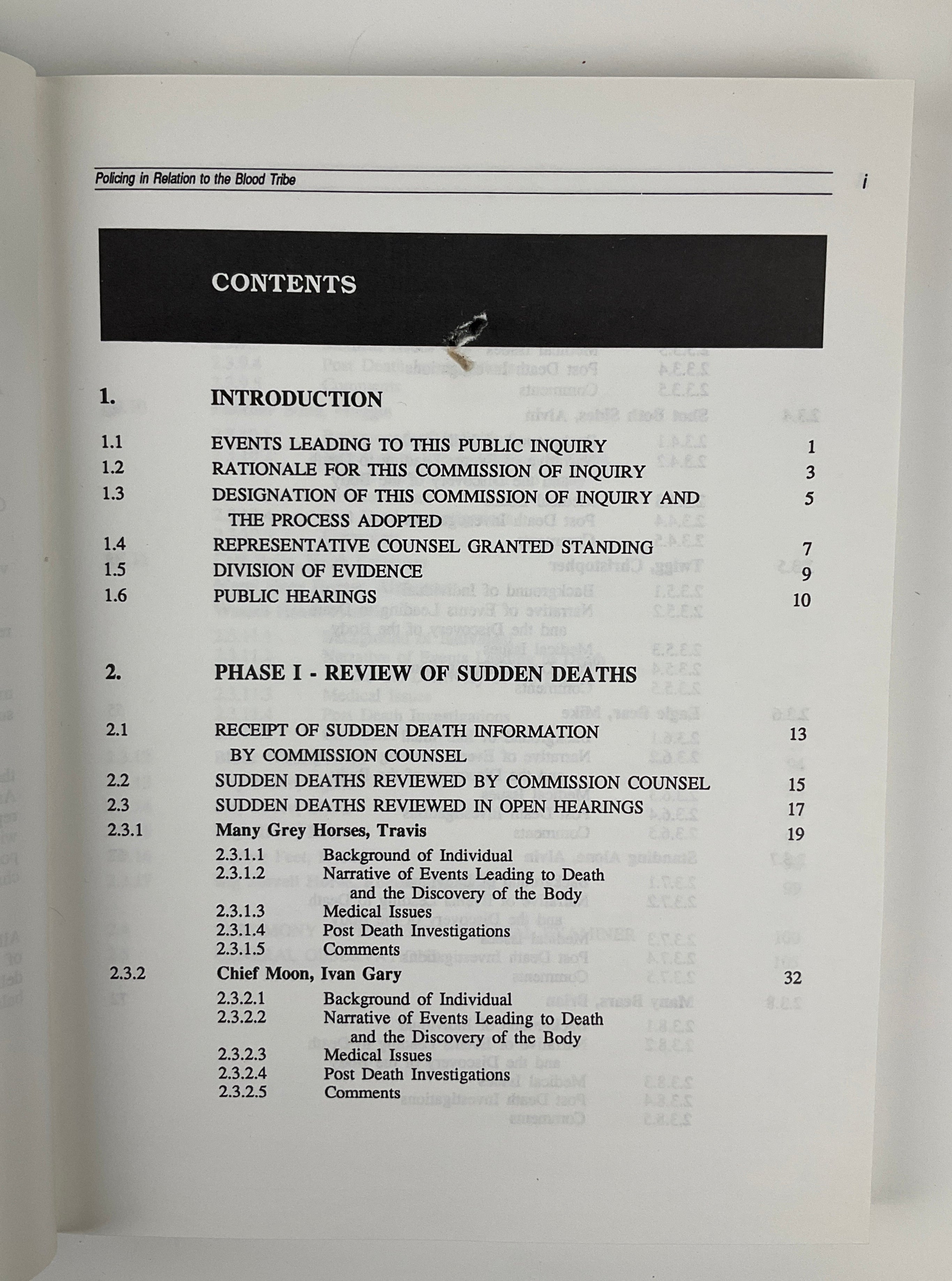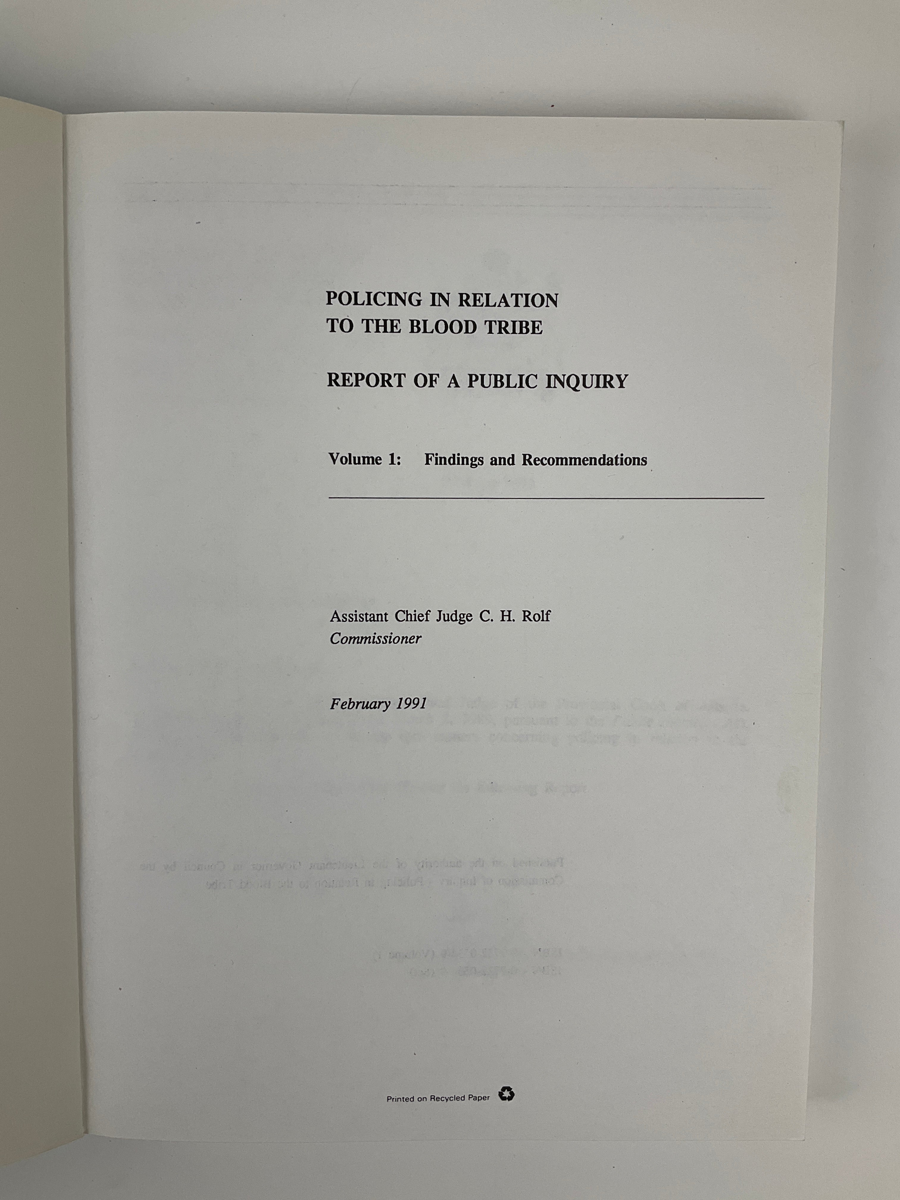 This book contains the first half of a two-volume inquiry by Assistant Chief Judge C. H. Rolf (Provincial Court of Alberta) following the murder of an Indigenous individual from Alberta’s Blood Tribe reserve in 1988 that sparked concern over policing practices. Rolf reviews the sudden deaths of 20 Blood Tribe individuals between 1976 and 1988 (13 deaths covered in depth), noting police involvement and investigation in each case. Rolf also examines a 1980 confrontation between Blood Tribe members and RCMP officers at Cardston as a catalyst for growing distrust of police amongst the Blood Tribe. Finally, the inquiry reviews cultural and political factors affecting policing services and First Nations self-governance initiatives in Alberta. The volume concludes with Rolf’s recommendations (absolving the police of major misconduct but advocating for cross-cultural training) and appendices containing information about the inquiry’s public hearings.