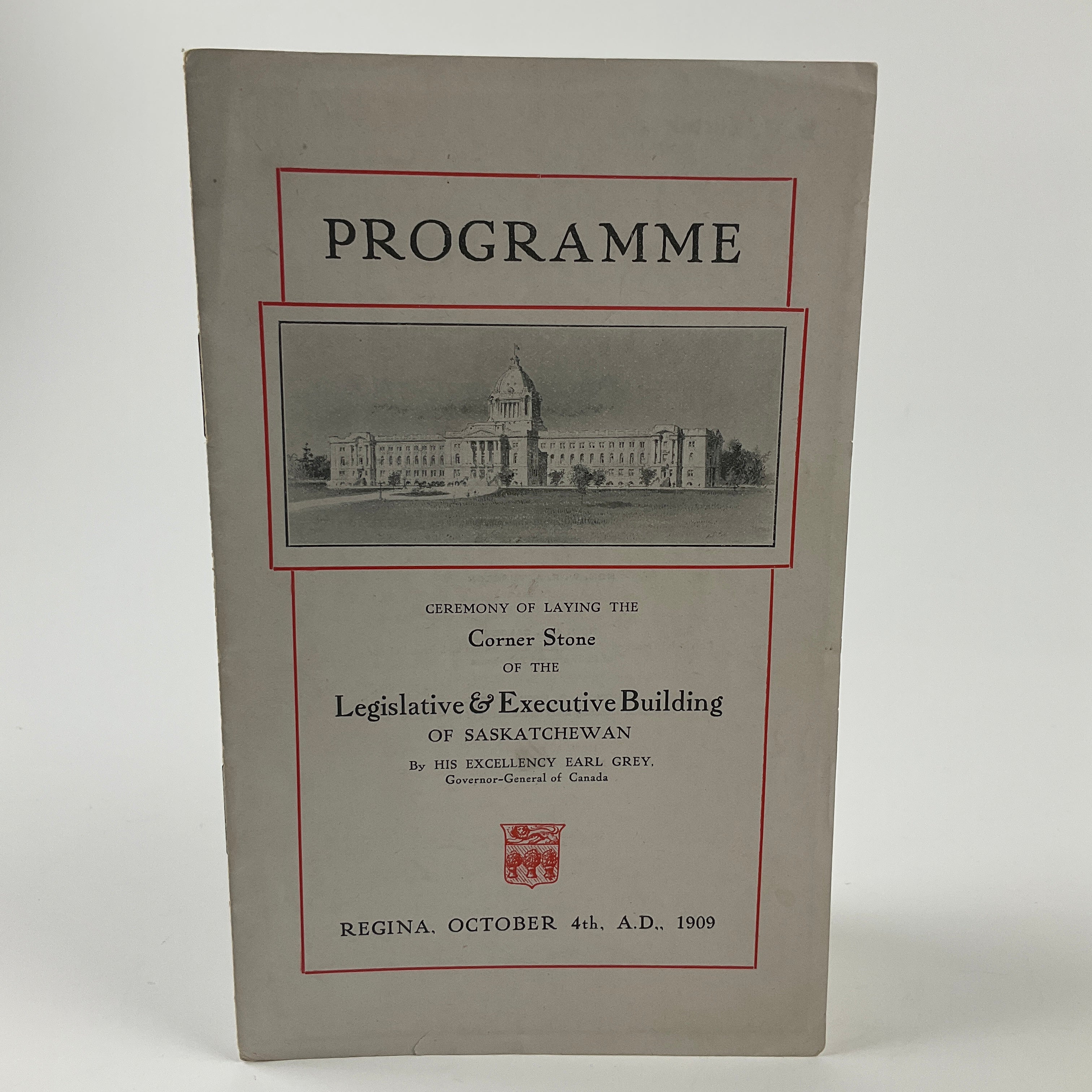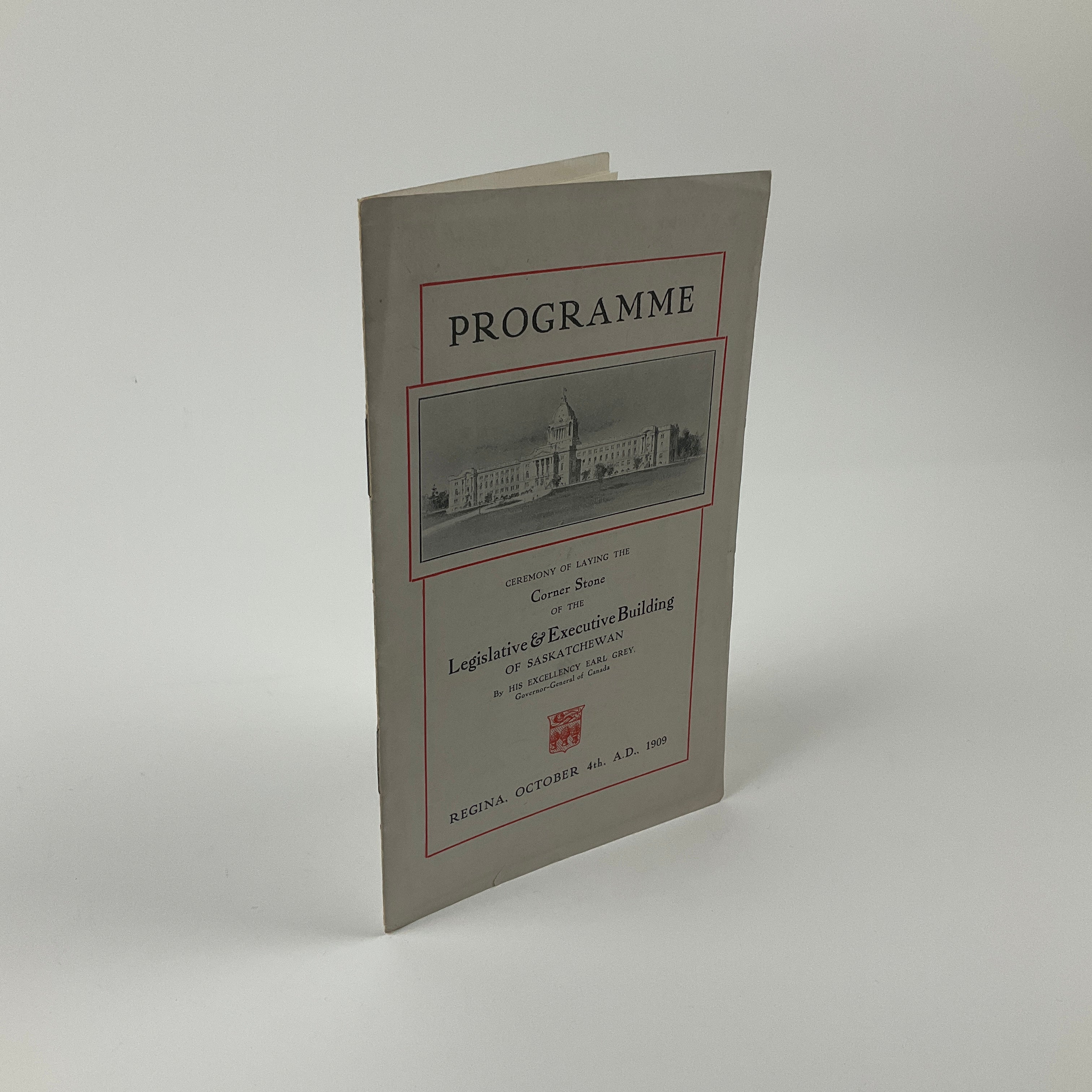 After Saskatchewan joined Canada as a province in 1905, construction began on the provincial legislative building. This pamphlet commemorates the laying of the building’s cornerstone in the fall of 1909 by the Earl Grey (then, Governor General of Canada). It includes a programme of events, texts of songs sung during the ceremonies, and a lengthy list of invited politicians and judiciary figures. A memento of an early political ceremony in Saskatchewan following the province’s entry into Confederation.