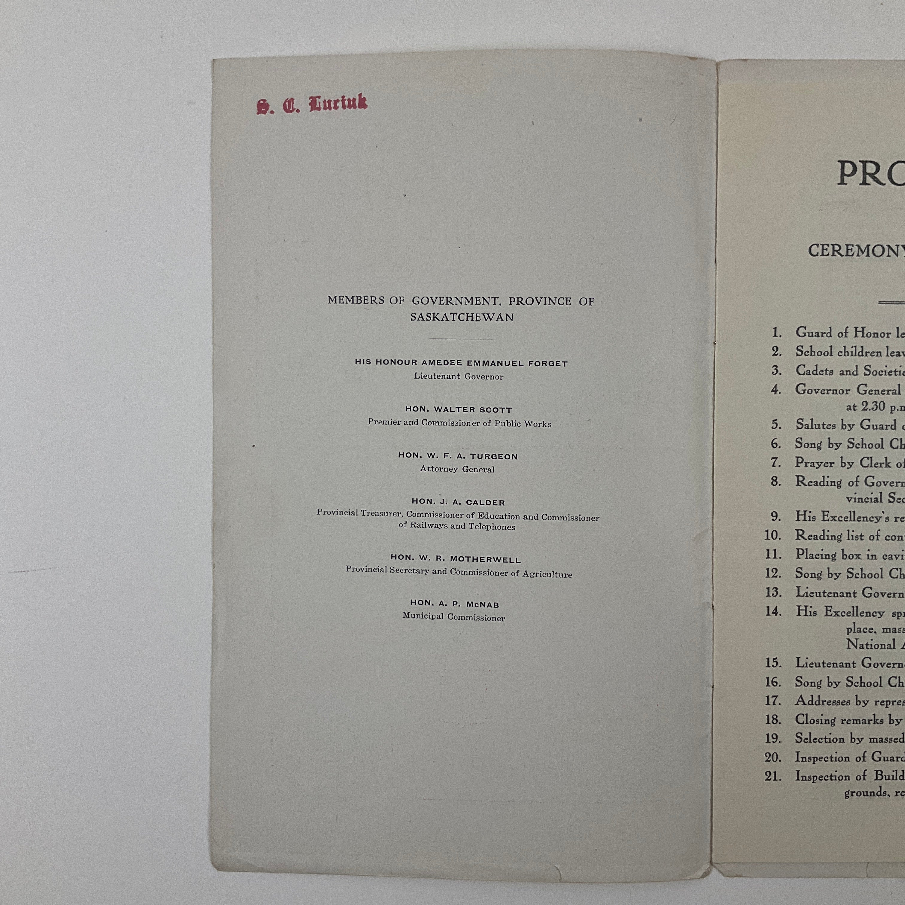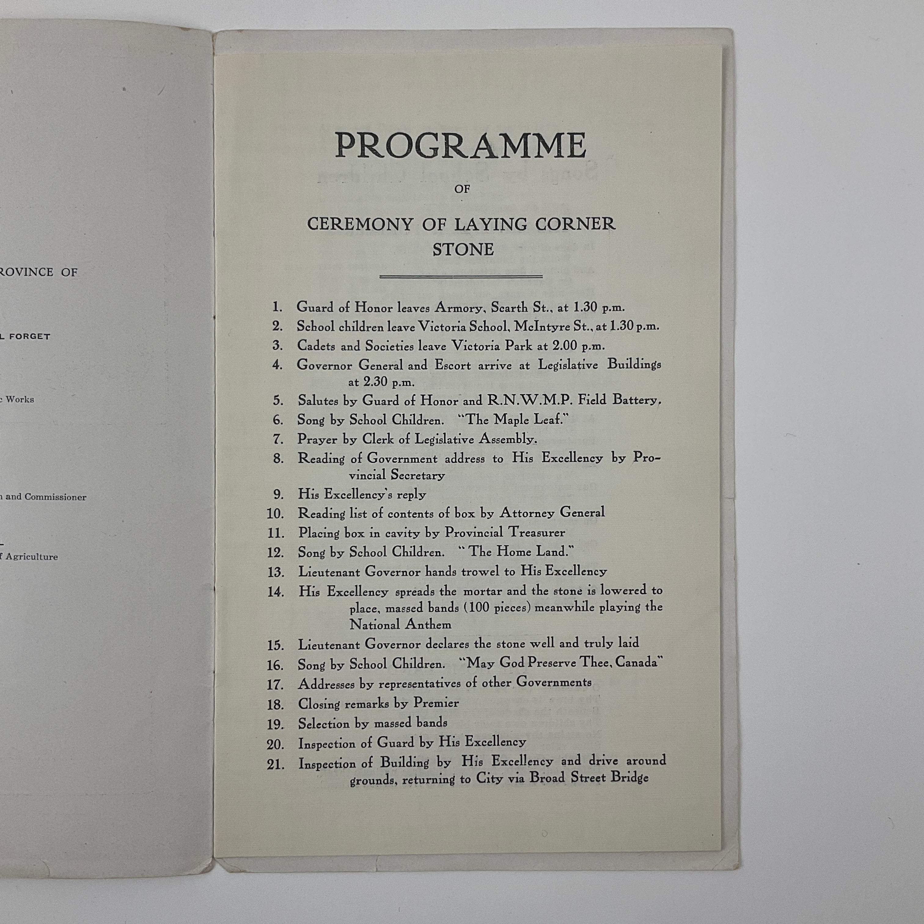 Programme – Ceremony of Laying the Corner Stone of the Legislative & Executive Building of Saskatchewan
