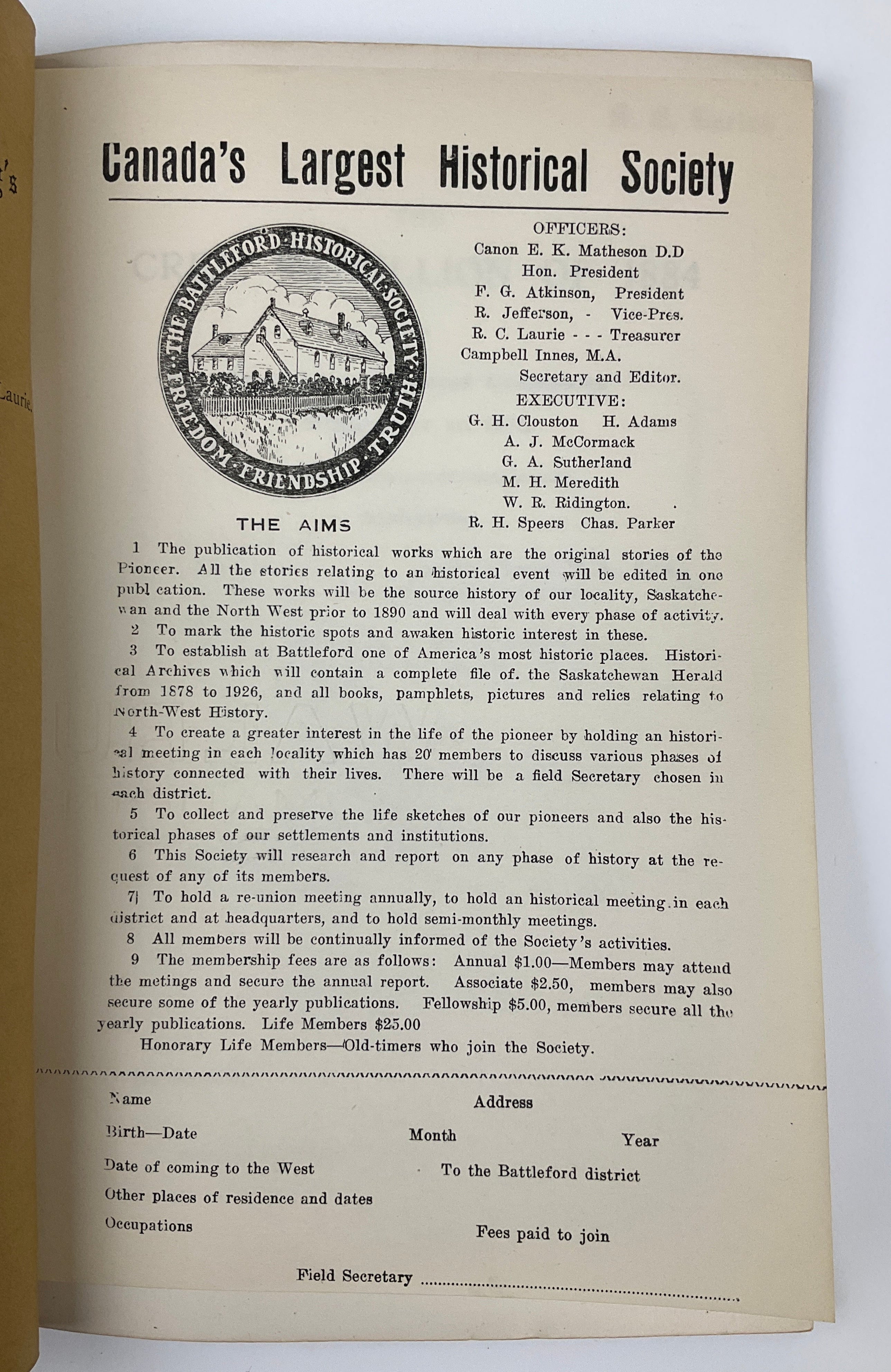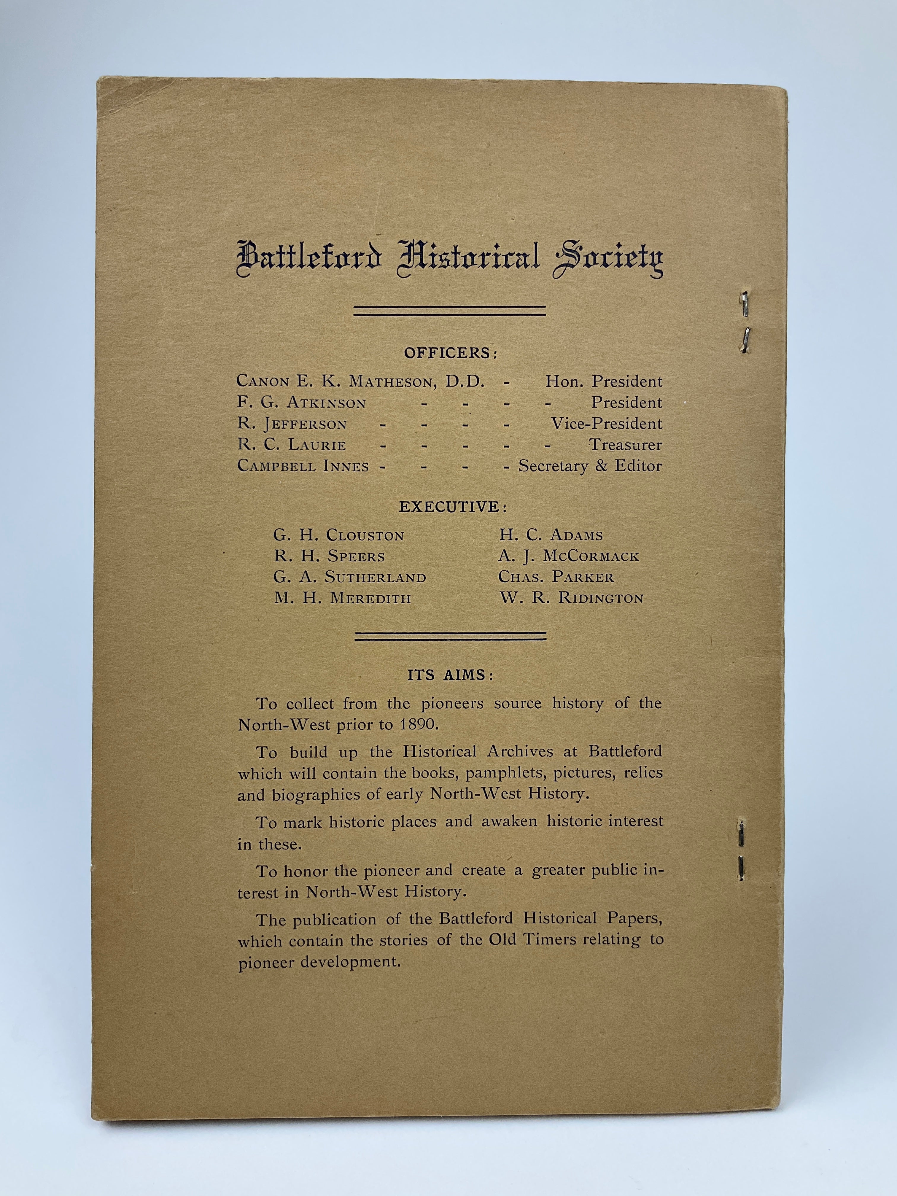 Canadian North-West Historical Society Publications Vol. 1 No. 3. The Canadian North-West Historical Society was founded in 1924 (as the Battleford Historical Society) to preserve the Battleford area’s history, in part by publishing accounts of life in the region prior to 1890. This volume contains several articles detailing the growth of the Anglican Church in western Canada as well as Edward K. Matheson’s life as a student, Anglican missionary, and teacher in the North-West. Born at the Red River settlement and active in Prince Albert, Lethbridge, and Battleford, Matheson’s influence on Anglican missions (especially amongst Cree communities and in the Battleford area) was considerable. The book’s contents are divided between writings by Matheson (recollecting events and figures in the North-West) and writings about Matheson and his family. Note Matheson’s role as Principal of Battleford Industrial Residential School from 1895-1914. Peel(3) 5170.