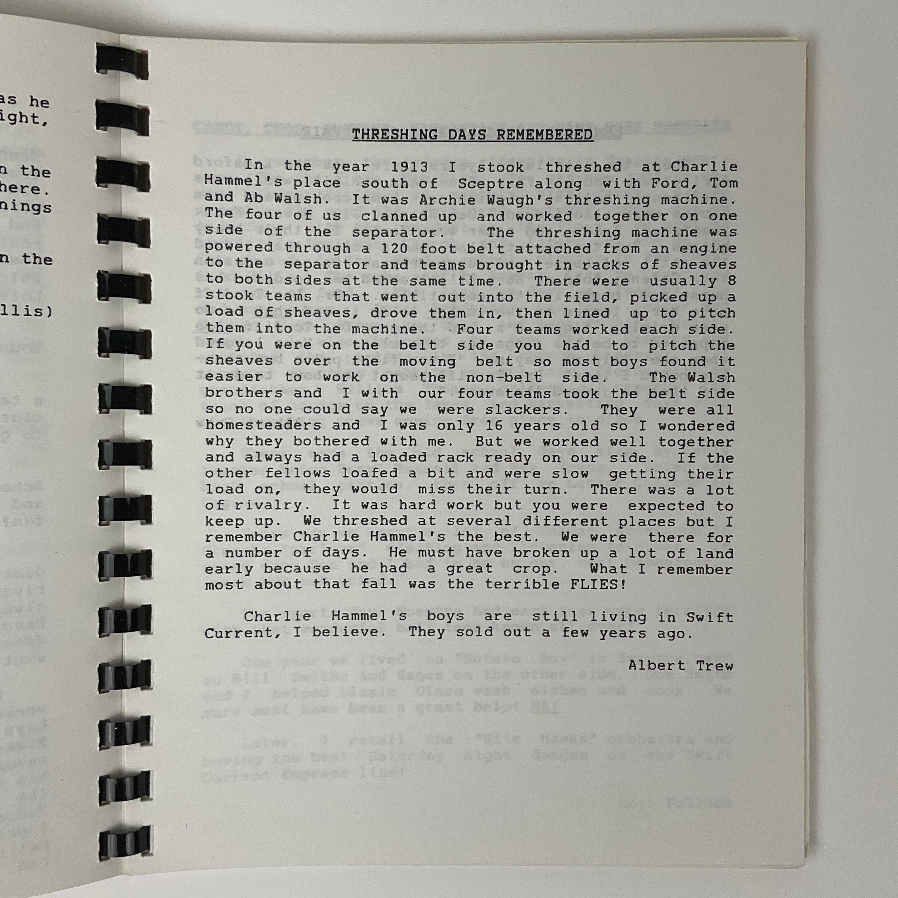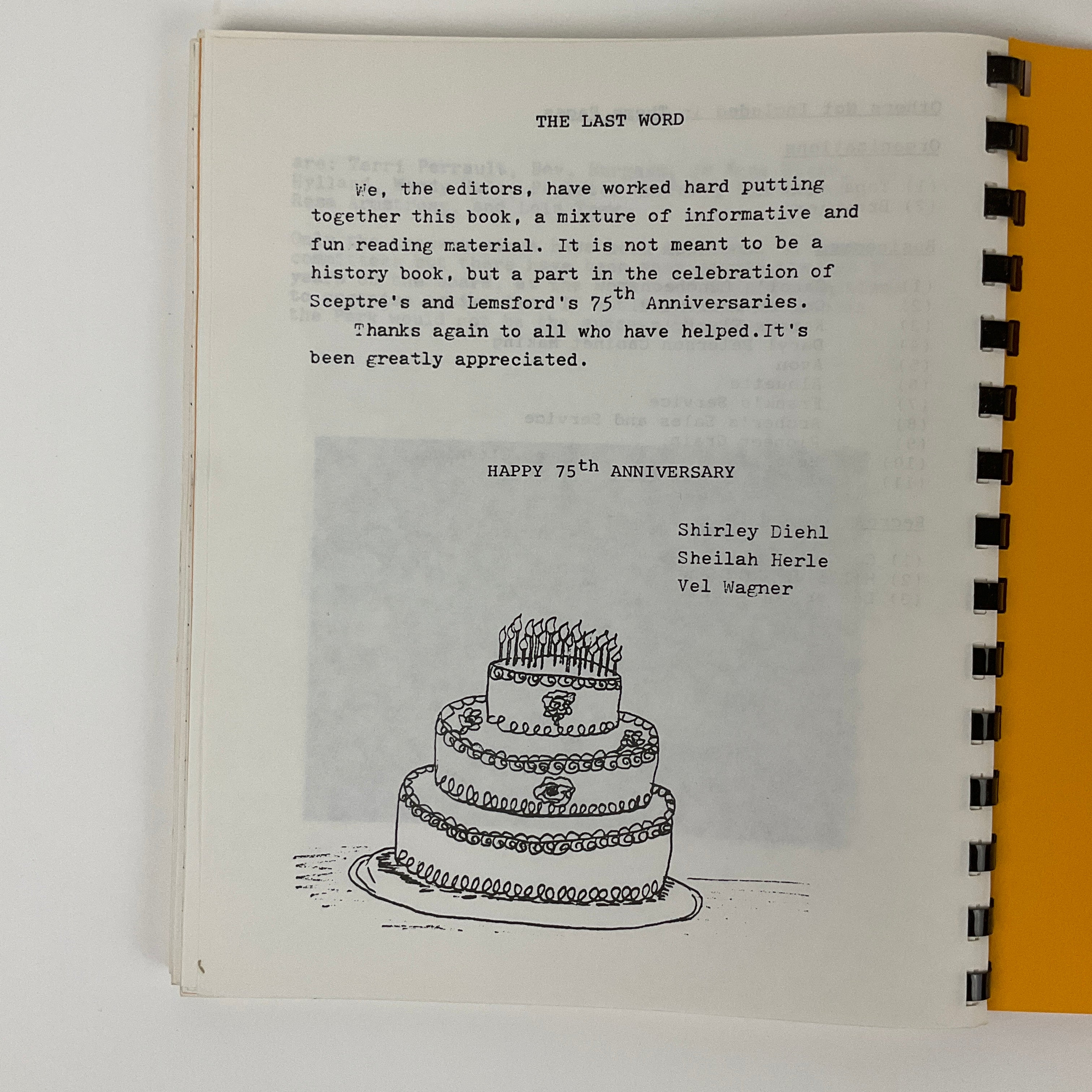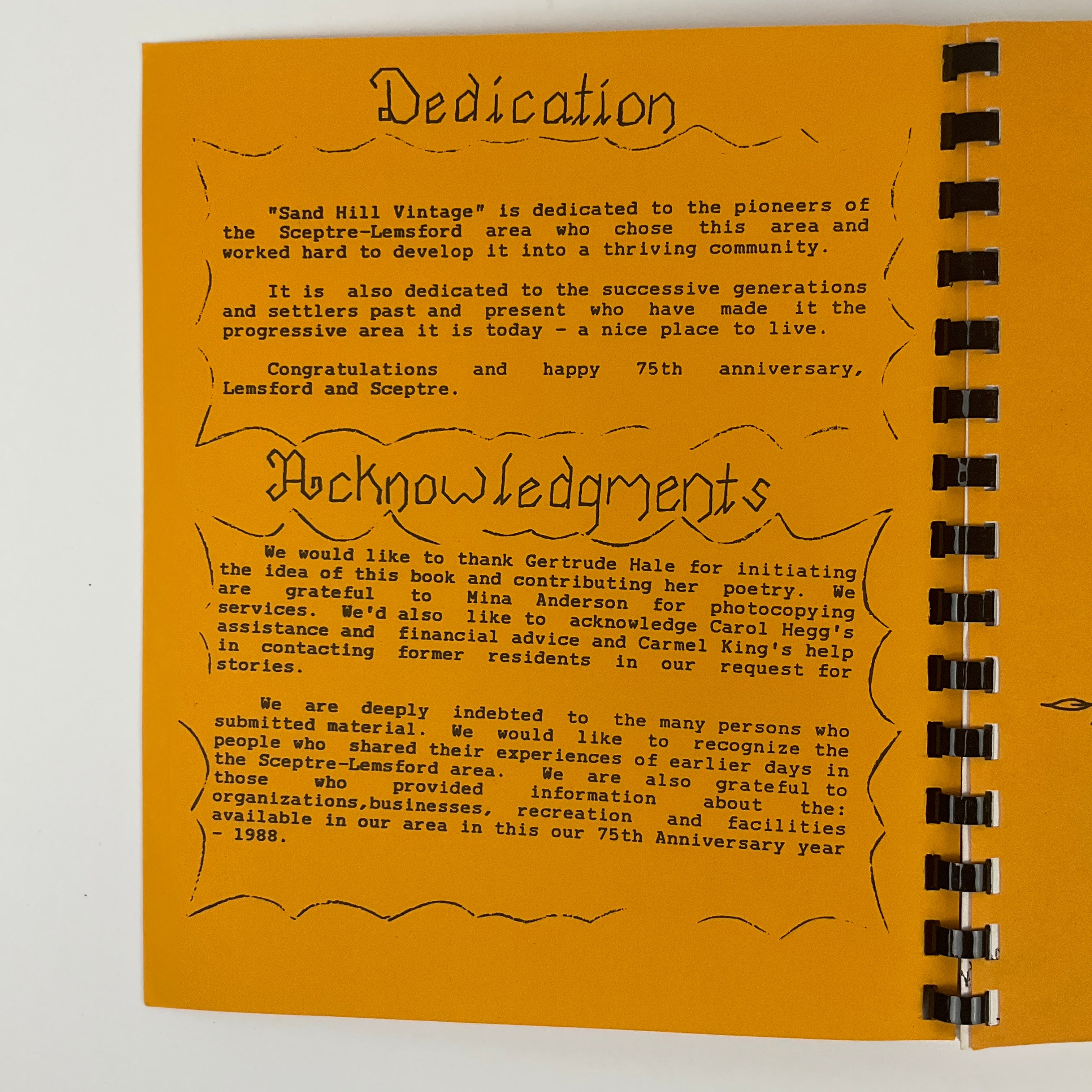 A souvenir Of the Lemsford and Secptre 75th Anniversary celebrations. Approximately one-third of the content is contributed by local resident Gertrude Hale, who offers historical context on the region’s pre-settlement era, observations on its distinctive natural history, several original poems, and a collection of wild game recipes. The remainder of the volume compiles essays on local institutions, anecdotes, and reminiscences from both past and present residents. While family histories are included, they are limited in number and detail (very few).