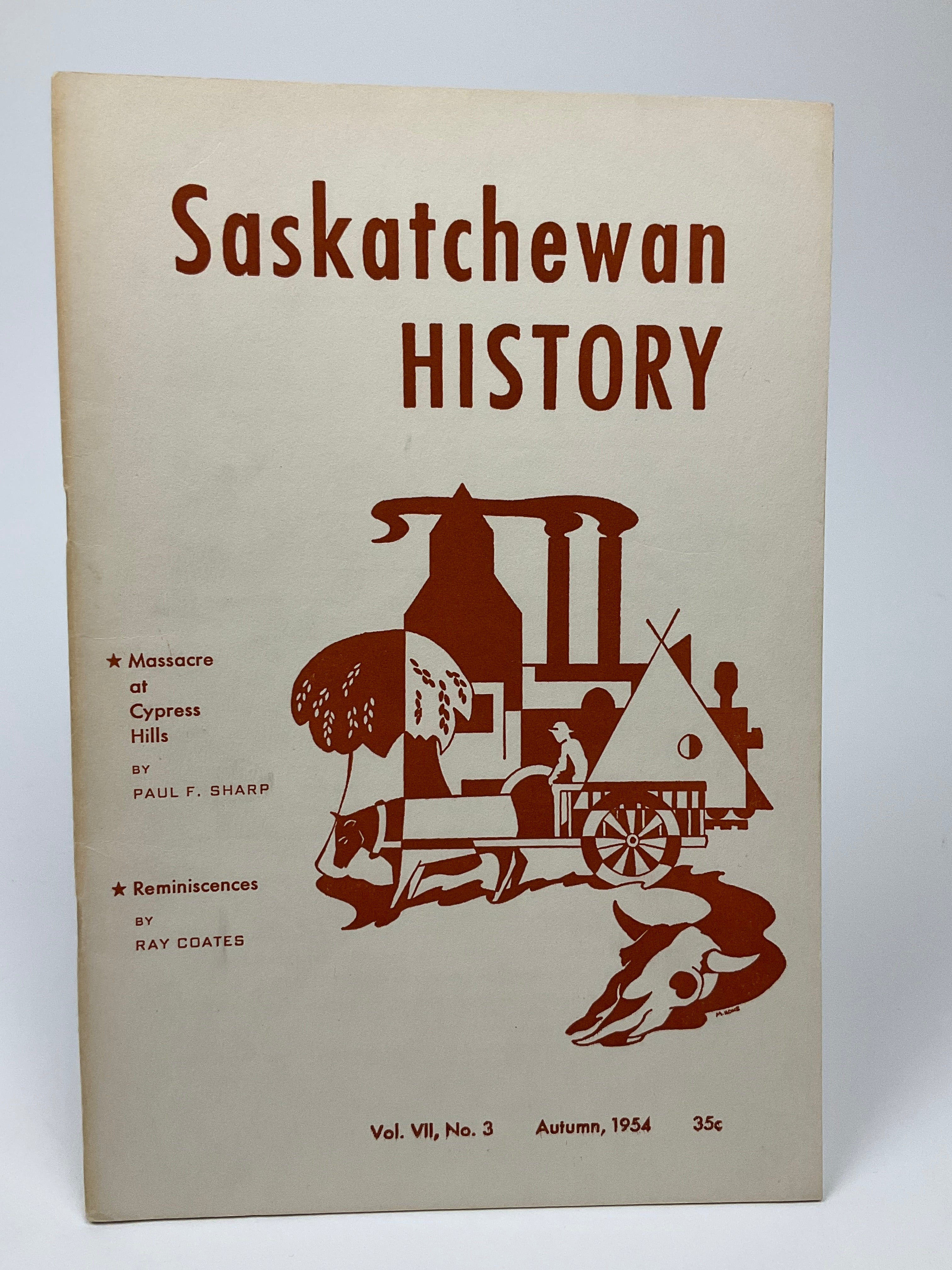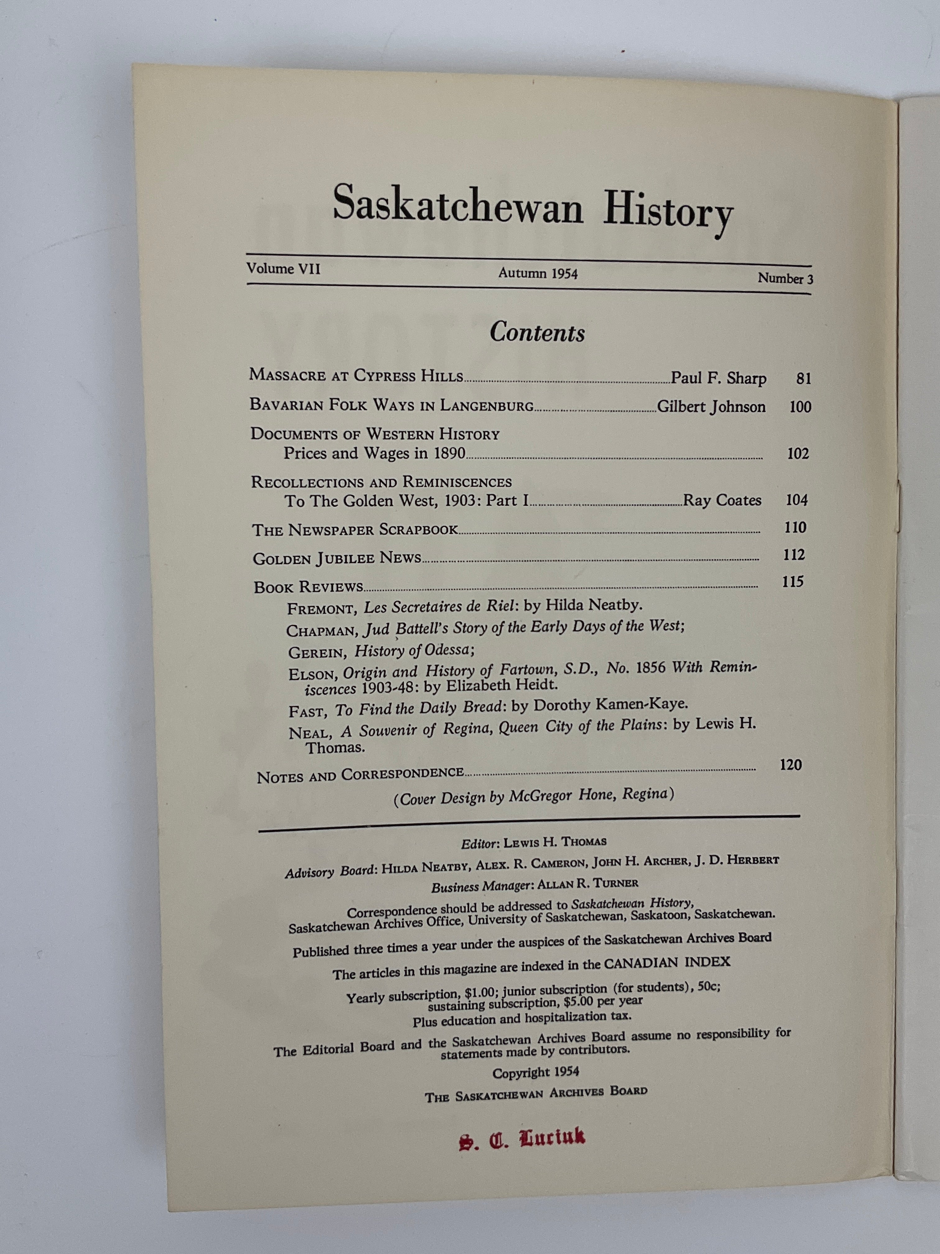 Published from 1948 until 2017, “Saskatchewan History” magazine showcased both scholarly and general interest work on diverse figures, groups, and events in the province’s past. As a publication of the Saskatchewan Archives Board, the magazine invited submissions from archivists, librarians, and academics. Issues may contain scholarly articles, book reviews, archival reports, and reminiscences. This volume includes material on the Cyprus Hills Massacre, the price of goods in 1890, Bavarian folkways in Langenburg, and recollections of traveling from Britain to settle in Canada in the early 1900s. Note Lewis H. Thomas as Editor and John H. Archer on the advisory board. Cover Design by McGregor Hone.