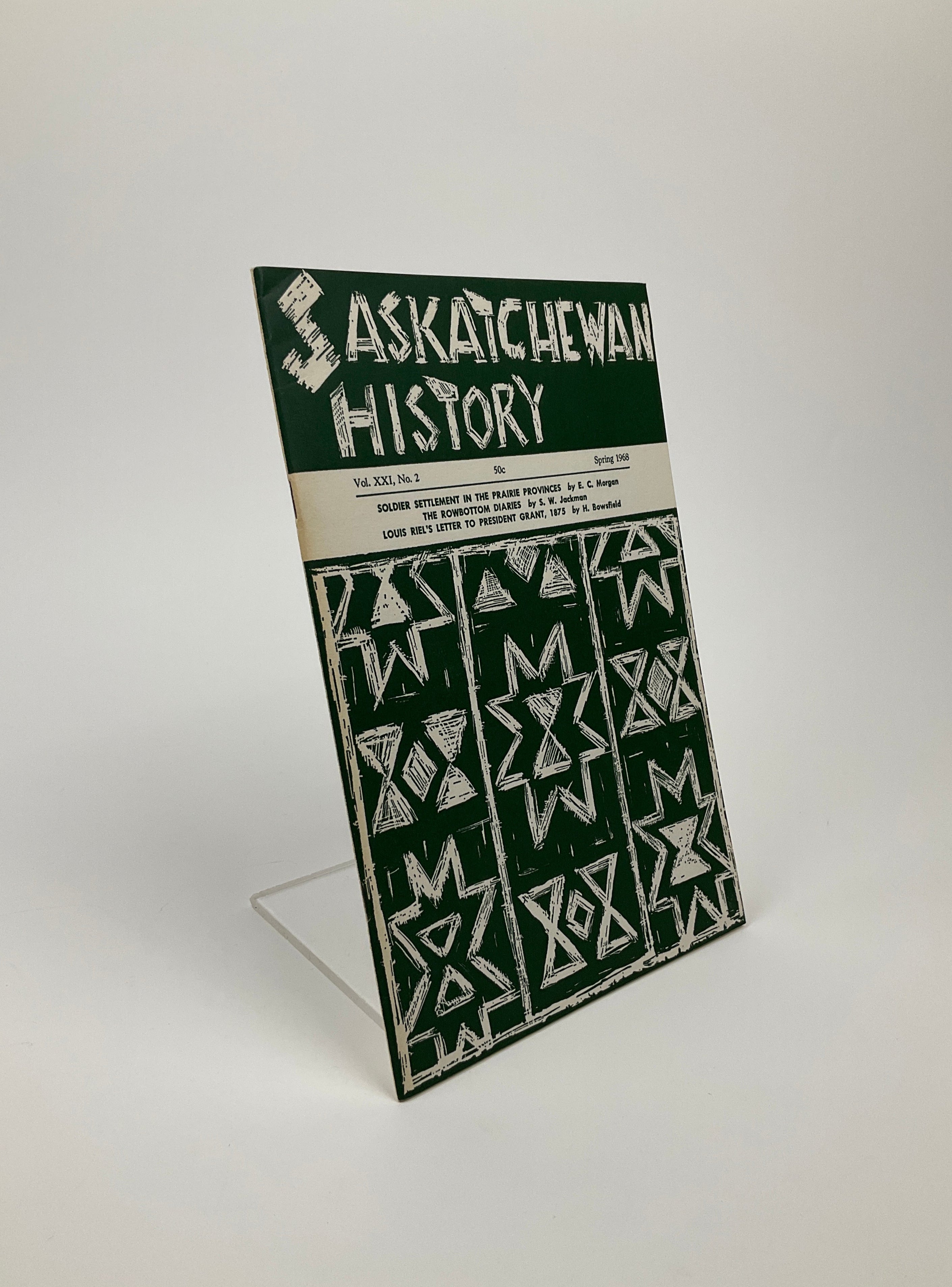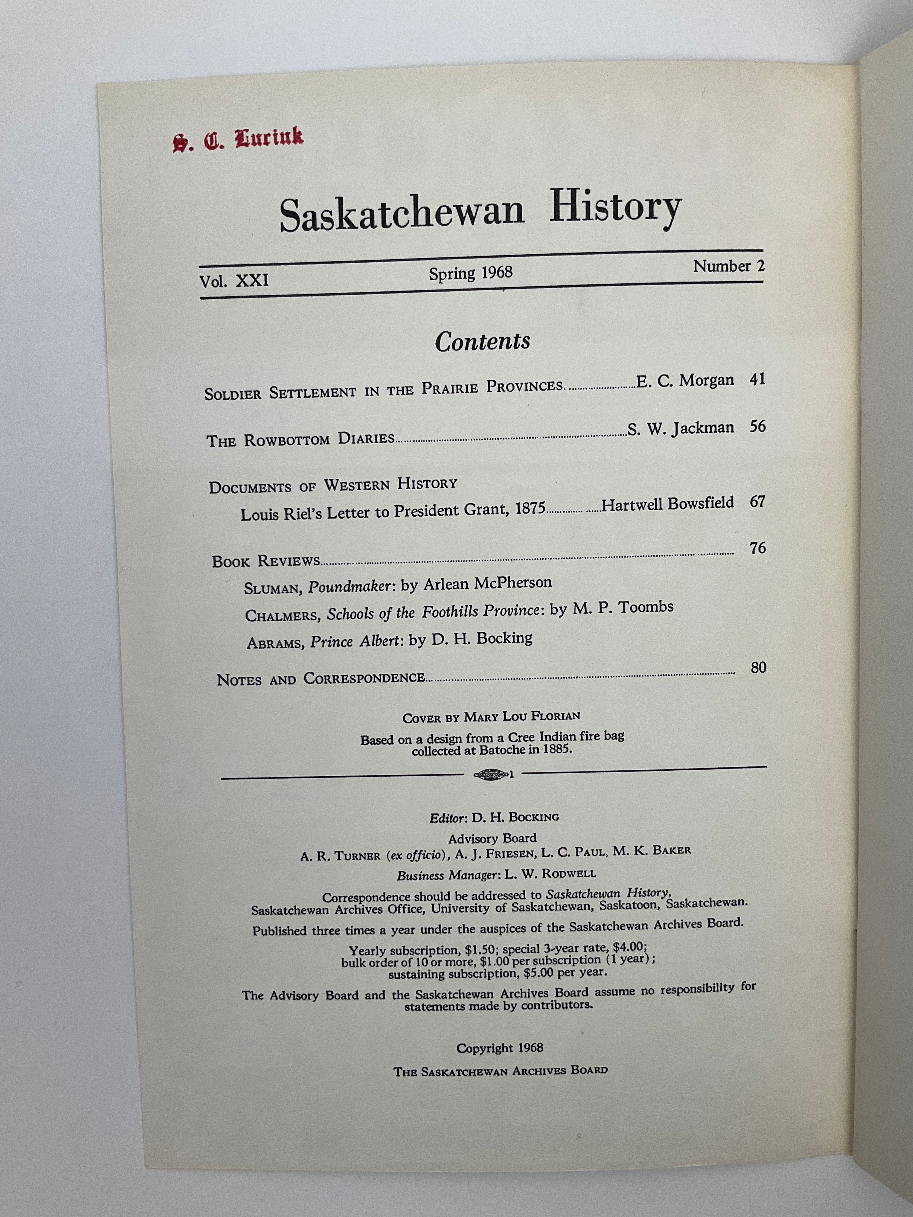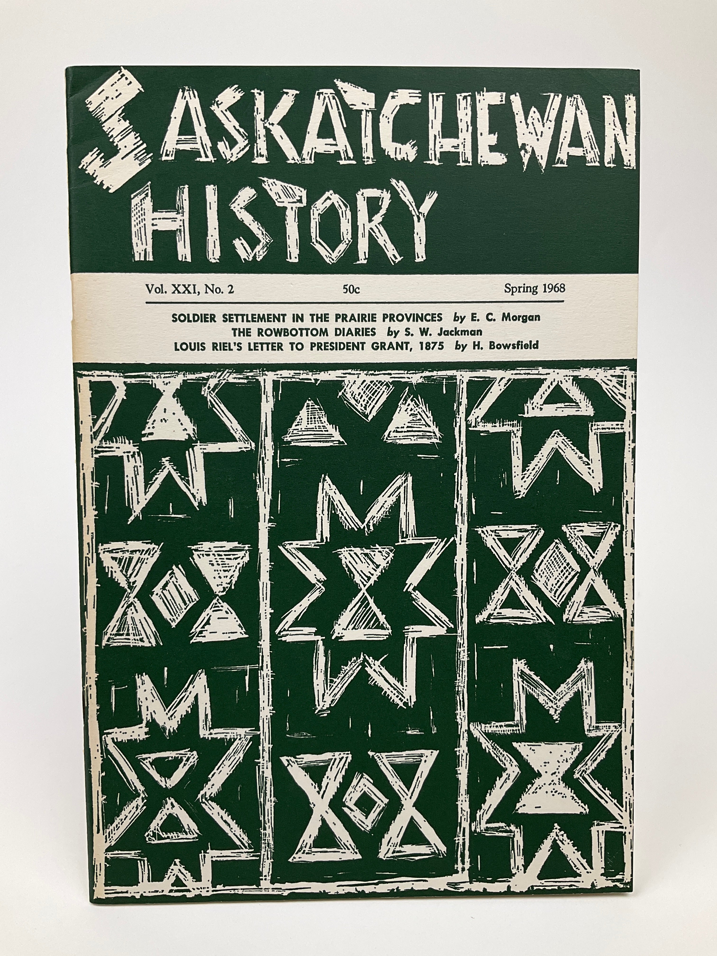 Published from 1948 until 2017, “Saskatchewan History” magazine showcased both scholarly and general interest work on diverse figures, groups, and events in the province’s past. As a publication of the Saskatchewan Archives Board, the magazine invited submissions from archivists, librarians, and academics. Issues may contain scholarly articles, book reviews, archival reports, and reminiscences. This volume includes material on WWI veterans settling on the prairies, journals written by an English settler in the early 1900s, and a letter from Louis Riel to President Ulysses S. Grant. Cover by Mary Lou Florian