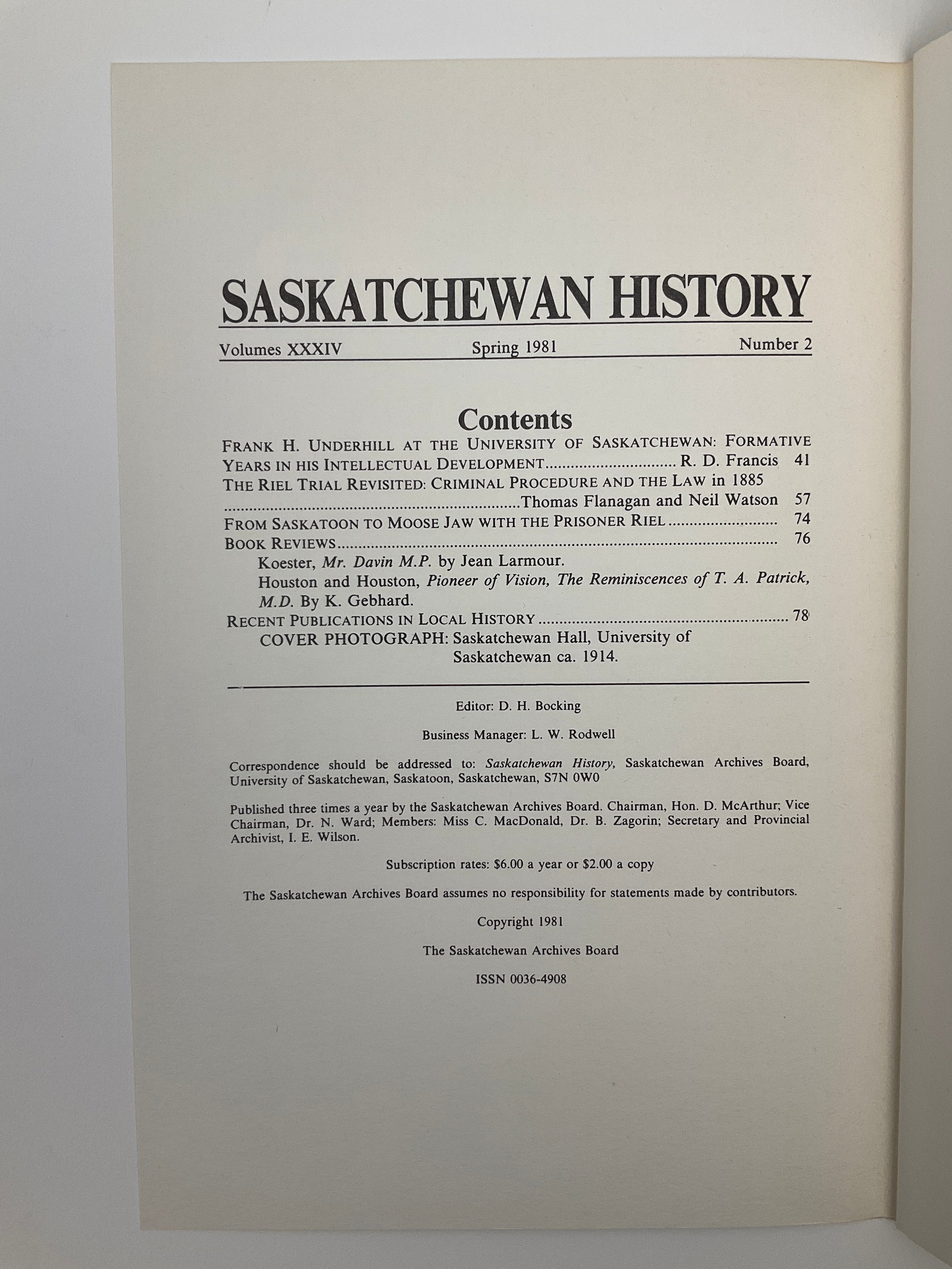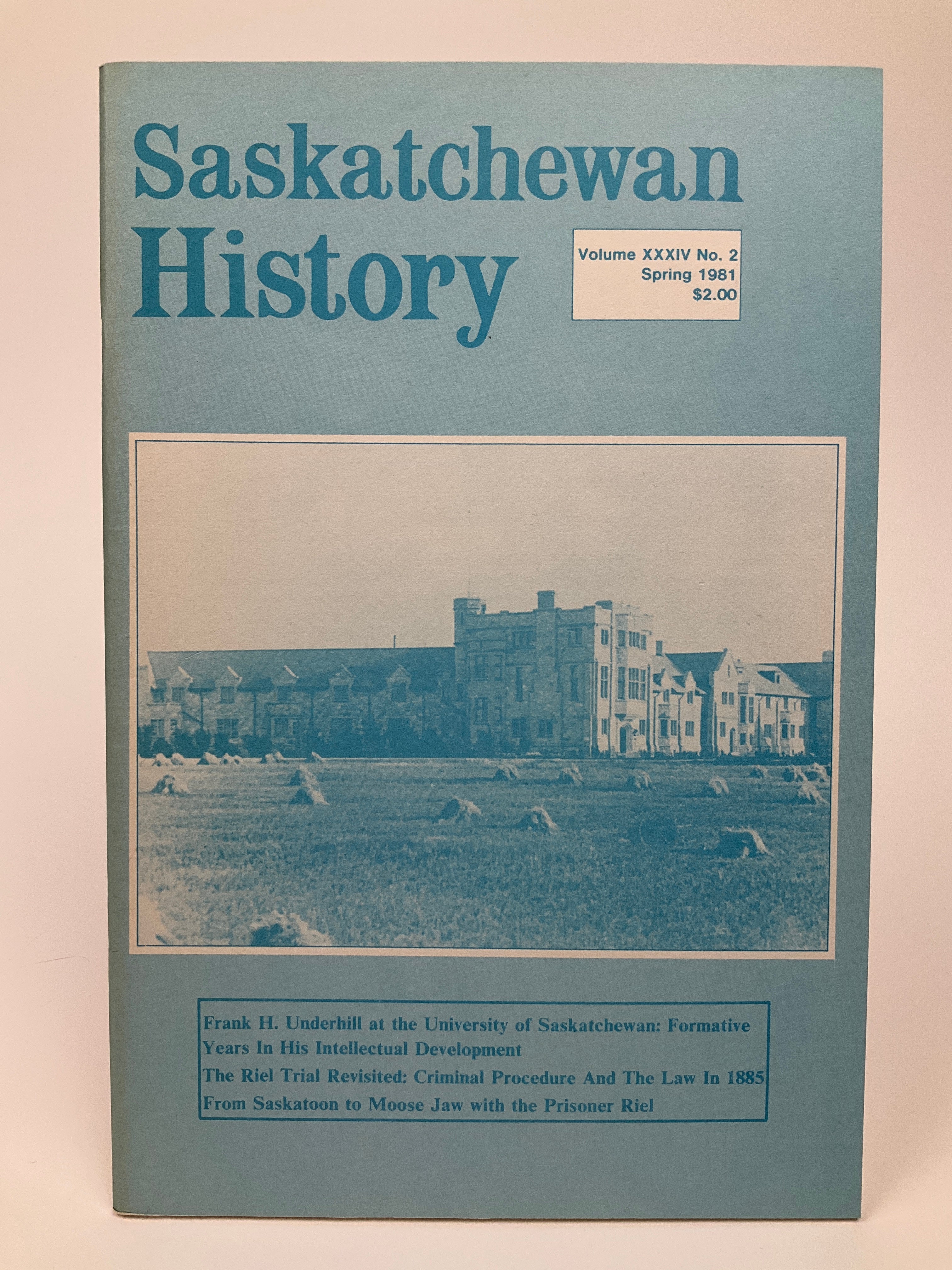 Published from 1948 until 2017, “Saskatchewan History” magazine showcased both scholarly and general interest work on diverse figures, groups, and events in the province’s past. As a publication of the Saskatchewan Archives Board, the magazine invited submissions from archivists, librarians, and academics. Issues may contain scholarly articles, book reviews, archival reports, and reminiscences. This volume includes material on Louis Riel’s capture and trial, as well as an analysis of Frank H. Underhill’s work as a History professor at the University of Saskatchewan.