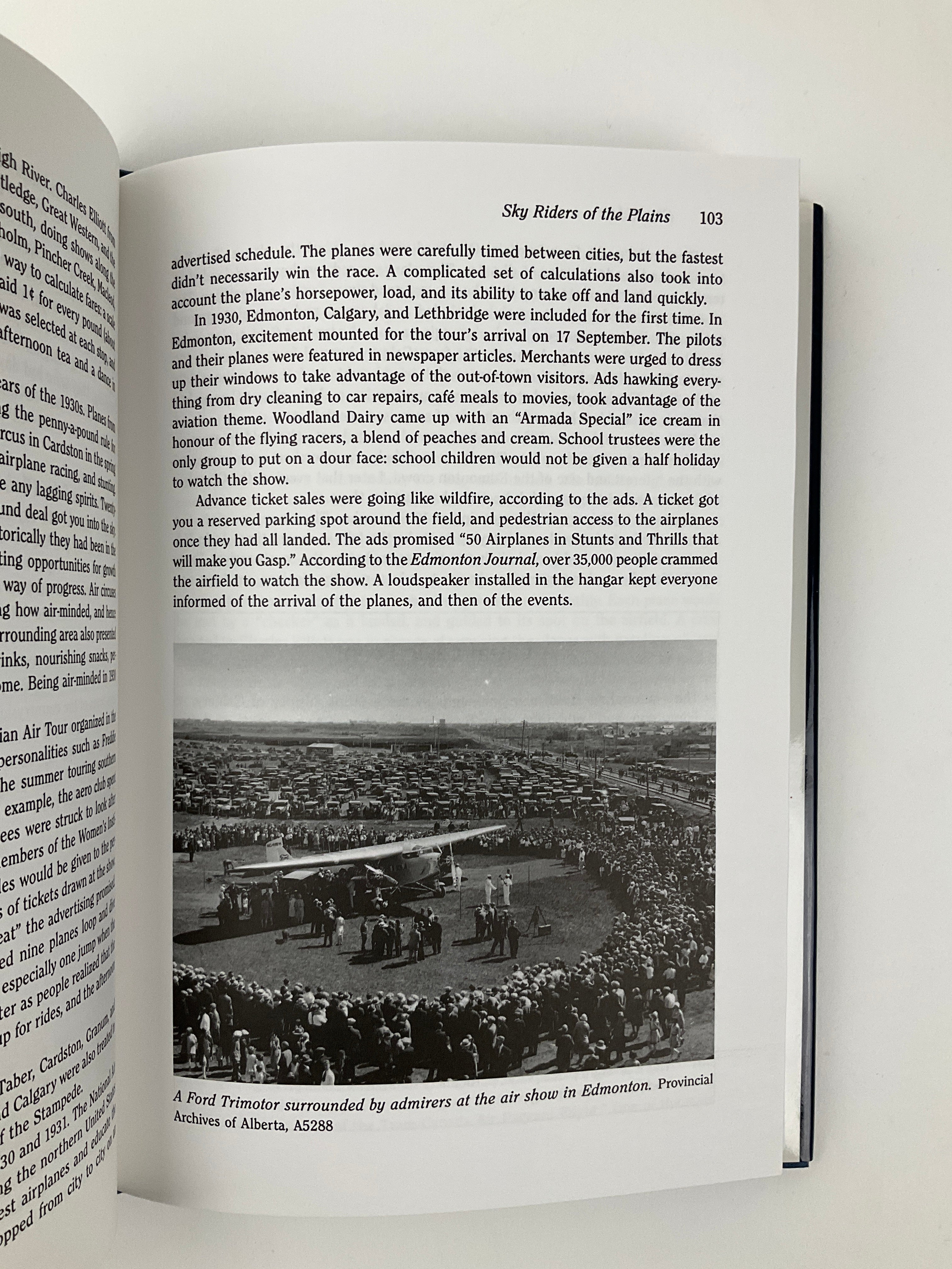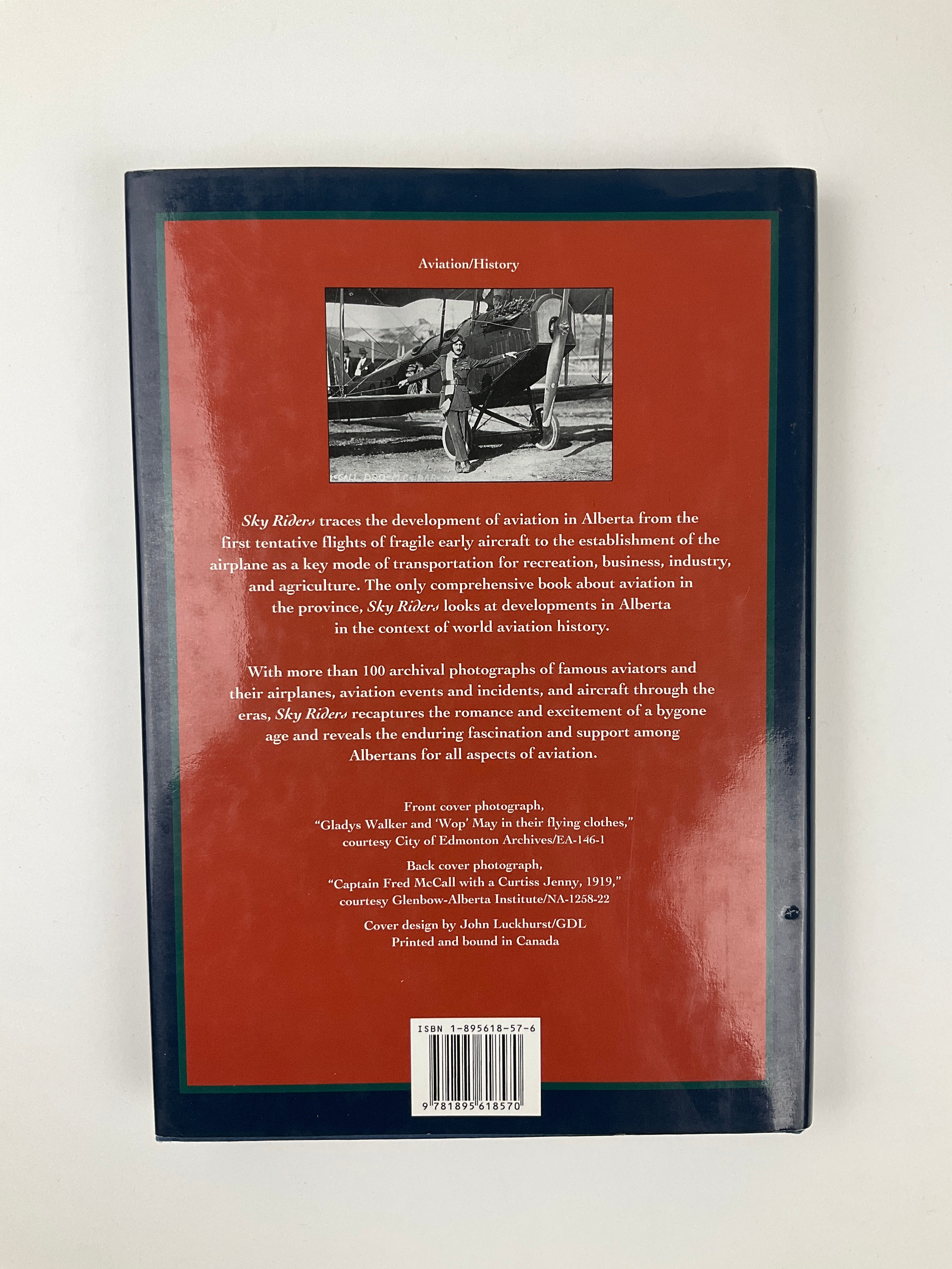 The dust jackets front flap reads - "Alberta has played host to all kinds of sky riders, from the internationally famous like Katherine Stinson to local heroes such as Jock Palmer, Fred McCall, Wop May, Punch Dickins, and many others. Sky Riders : An Illustrated History Of Aviation In Alberta, 1906-1945 tells the stories of the individuals and businesses both large and small that have played a part in Alberta's aviation history. Read about the thrills and dangers barnstorming and developments in aviation and related technologies, the ariel exploits of pilots during the two world wars, the role of airplanes in the race to extract resources from the North, and the growth of the passenger and cargo industries. ..."