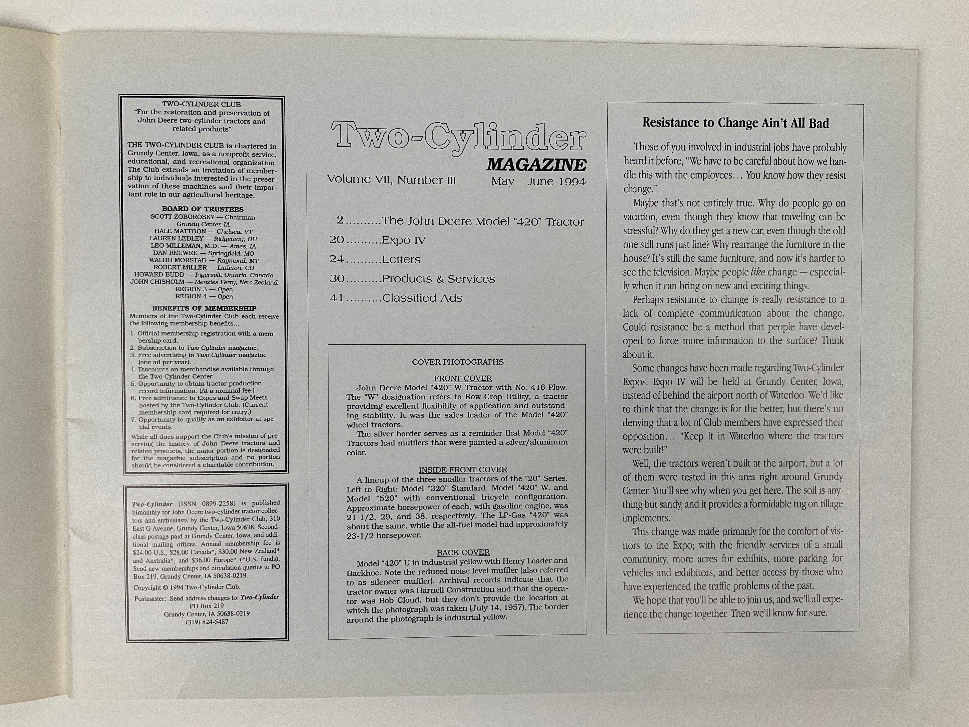 “Two-Cylinder” is a bimonthly publication that showcases two-cylinder John Deere tractors, their collectors/owners, and associated events. Most issues feature a particular John Deere model or Expo/show. The balance of each issue includes letters and editorials, news, classified advertisements, and plenty of photos and information for John Deere enthusiasts. This issue features the John Deere Model “420” tractor and outlines details of the upcoming Expo IV.