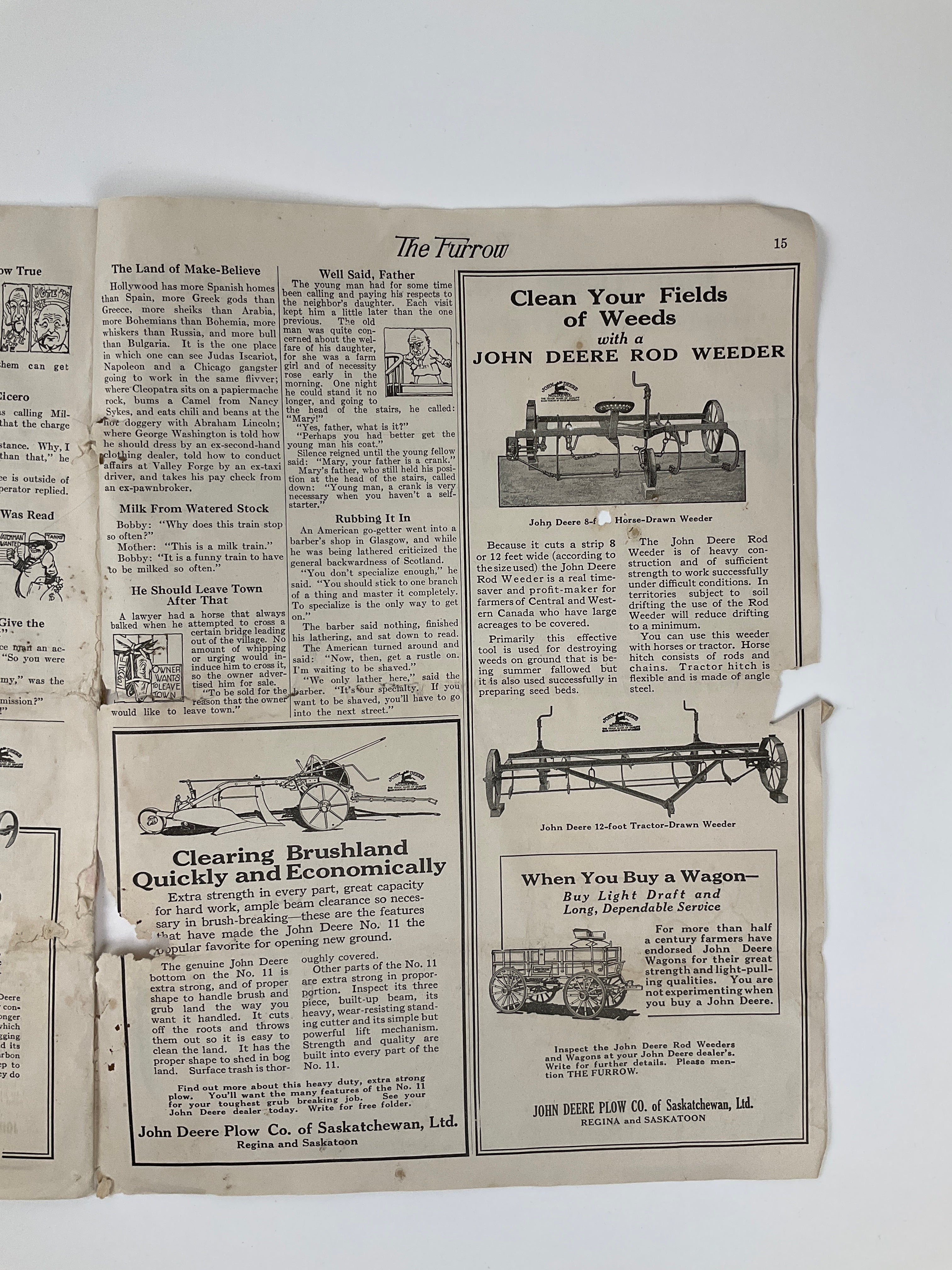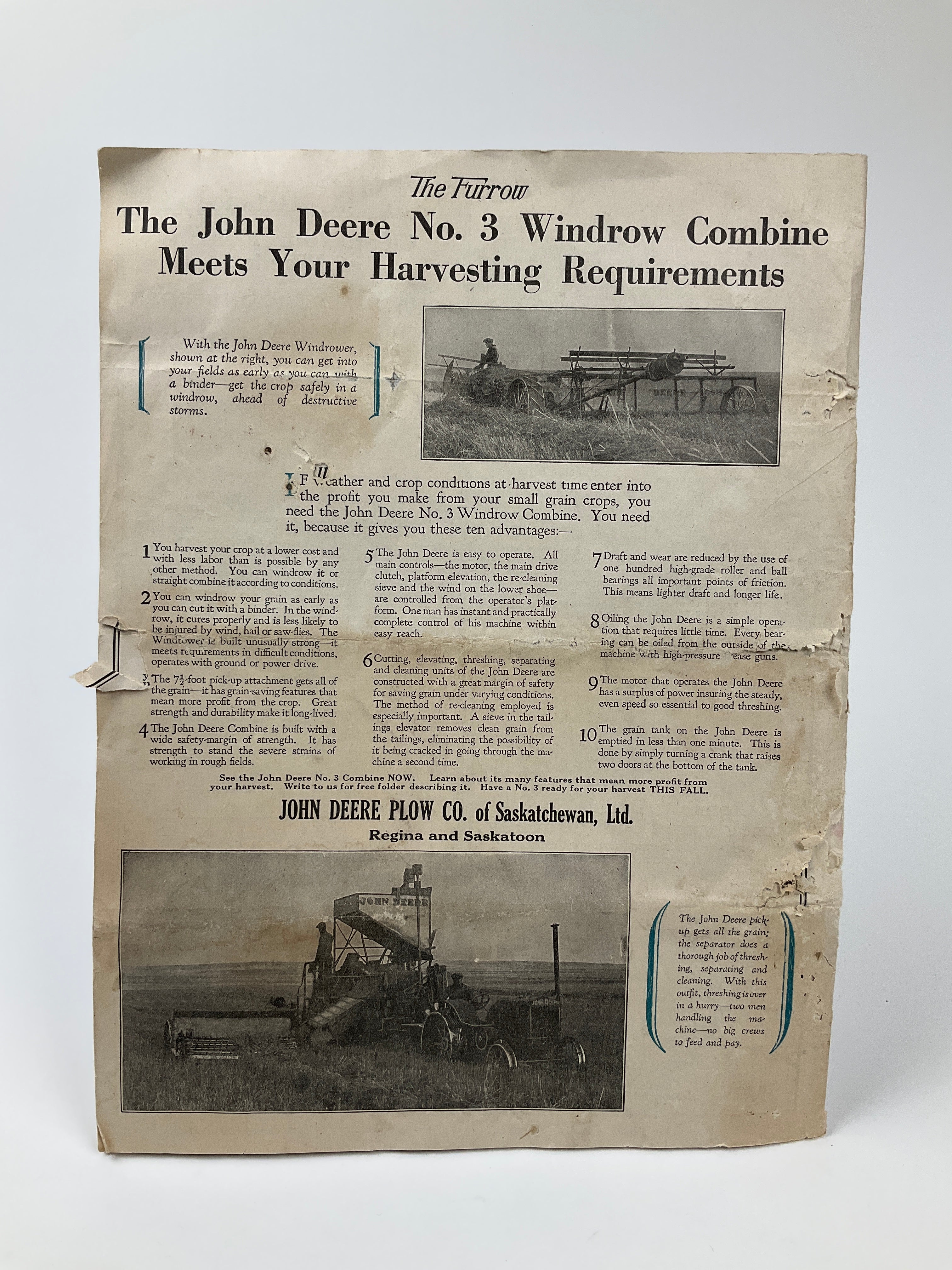 Bi-monthly magazine, published by implement manufacturer Deere & Company. An agricultural magazine used to promote John Deere products. In this issue all advertising is specific to Saskatchewan, by the John Deere Plow Co. of Saskatchewan, Ltd., Regina and Saskatoon.