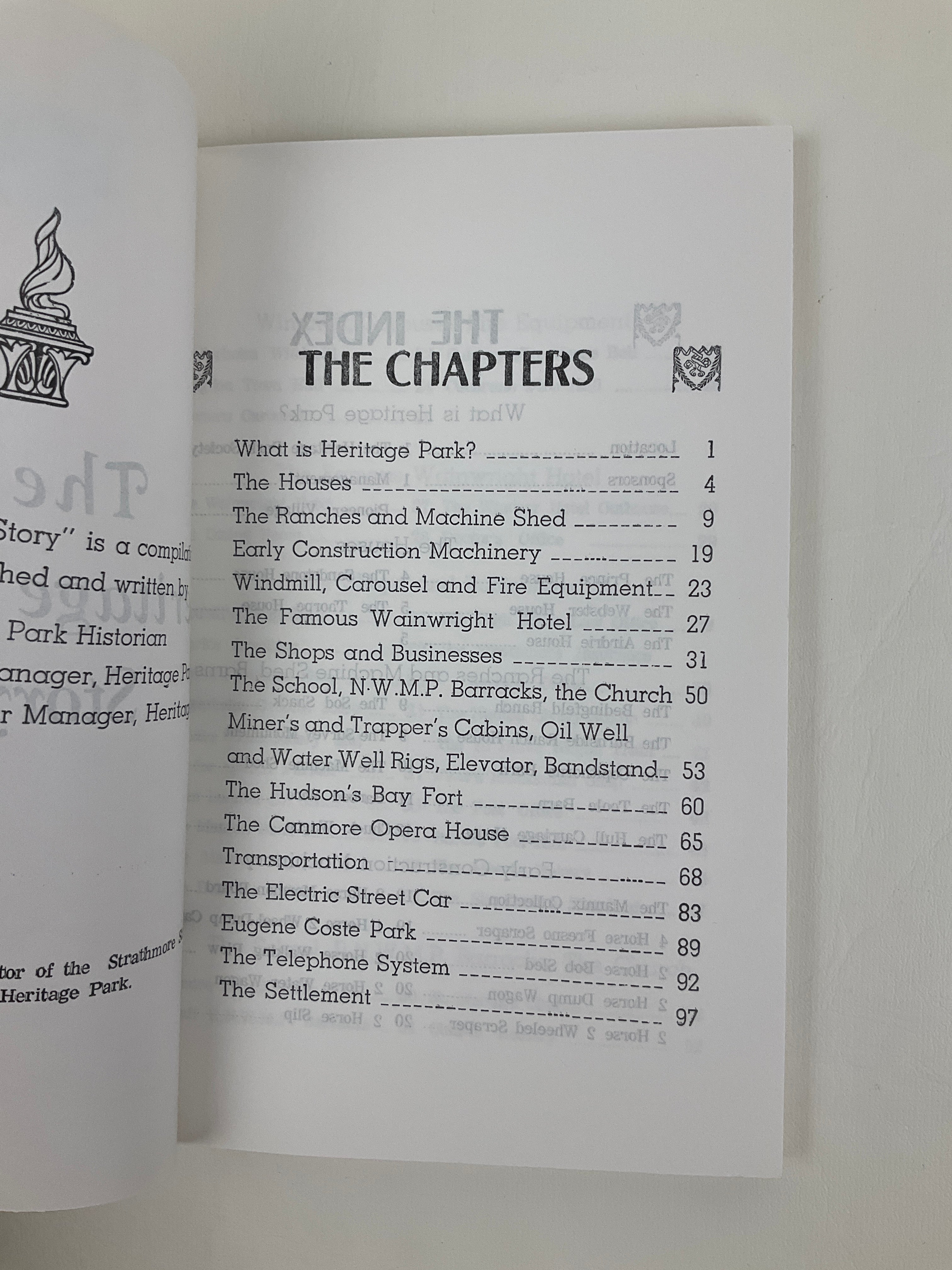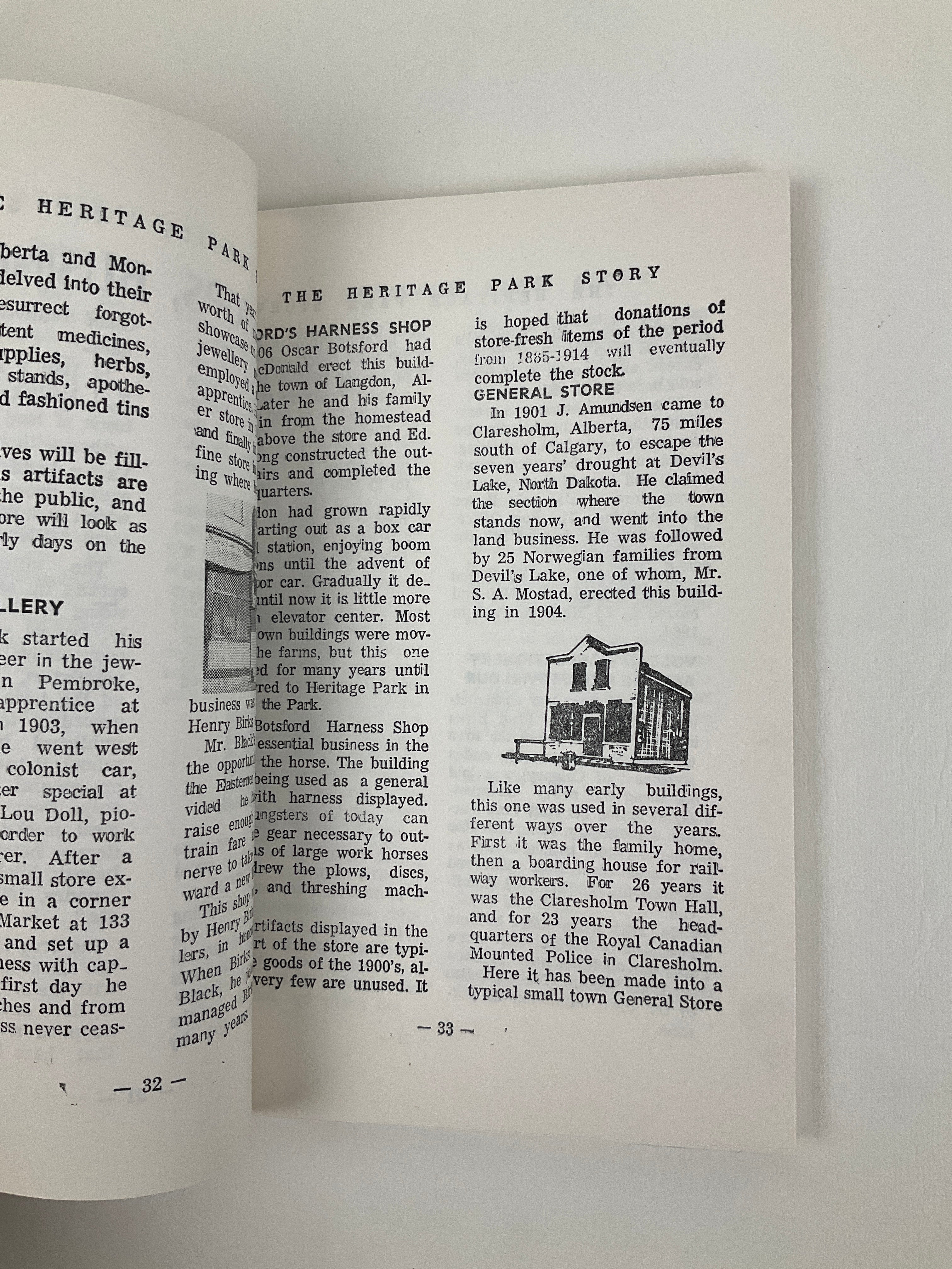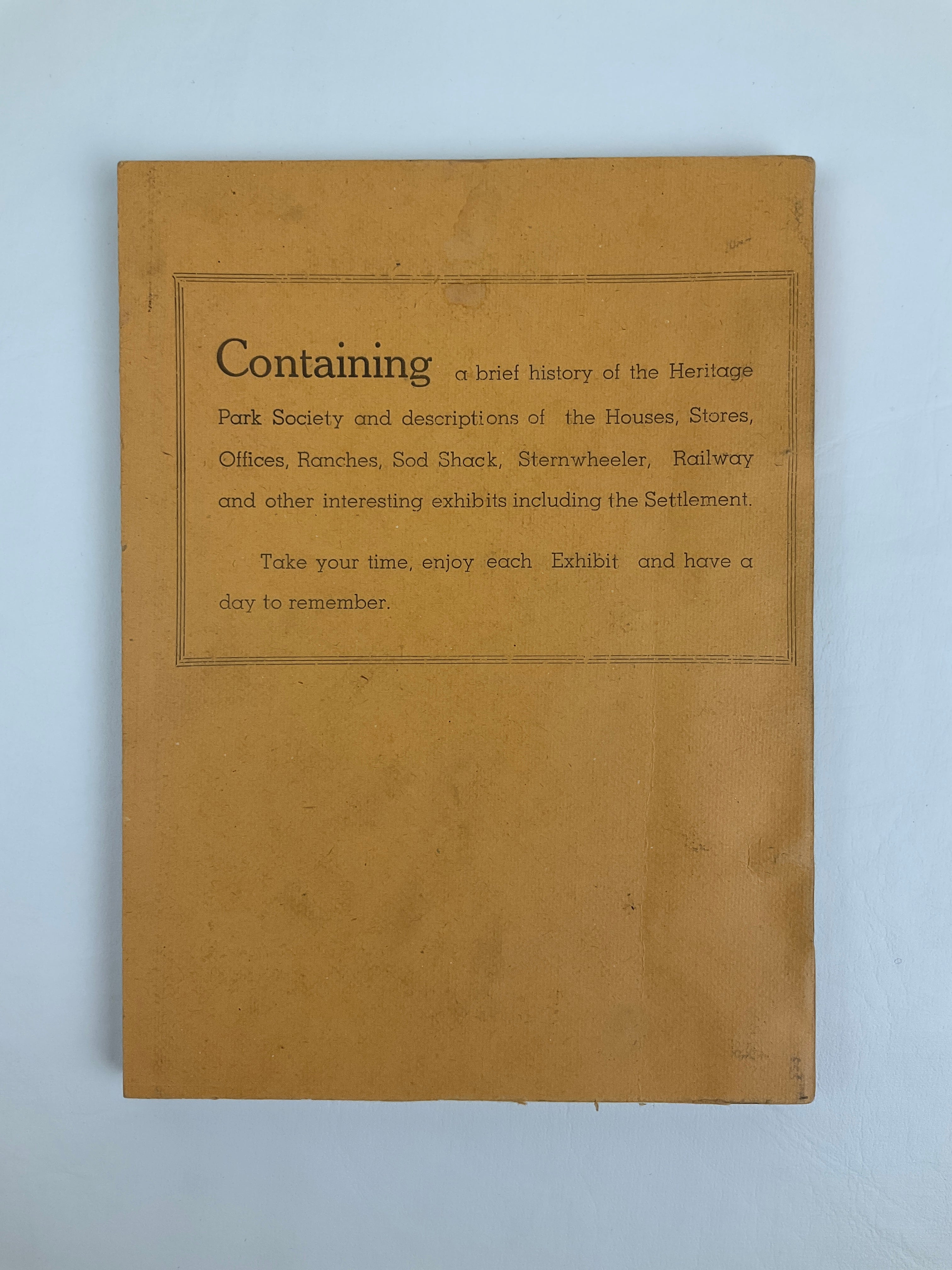 A short, illustrated pamphlet produced by the Heritage Park Historical Village (then a newly‑opened living‑history museum). Its purpose was to introduce visitors—especially school groups and families—to the park’s concept and to give a narrative backdrop for the historic settlement that had been recreated on the 127‑acre site
