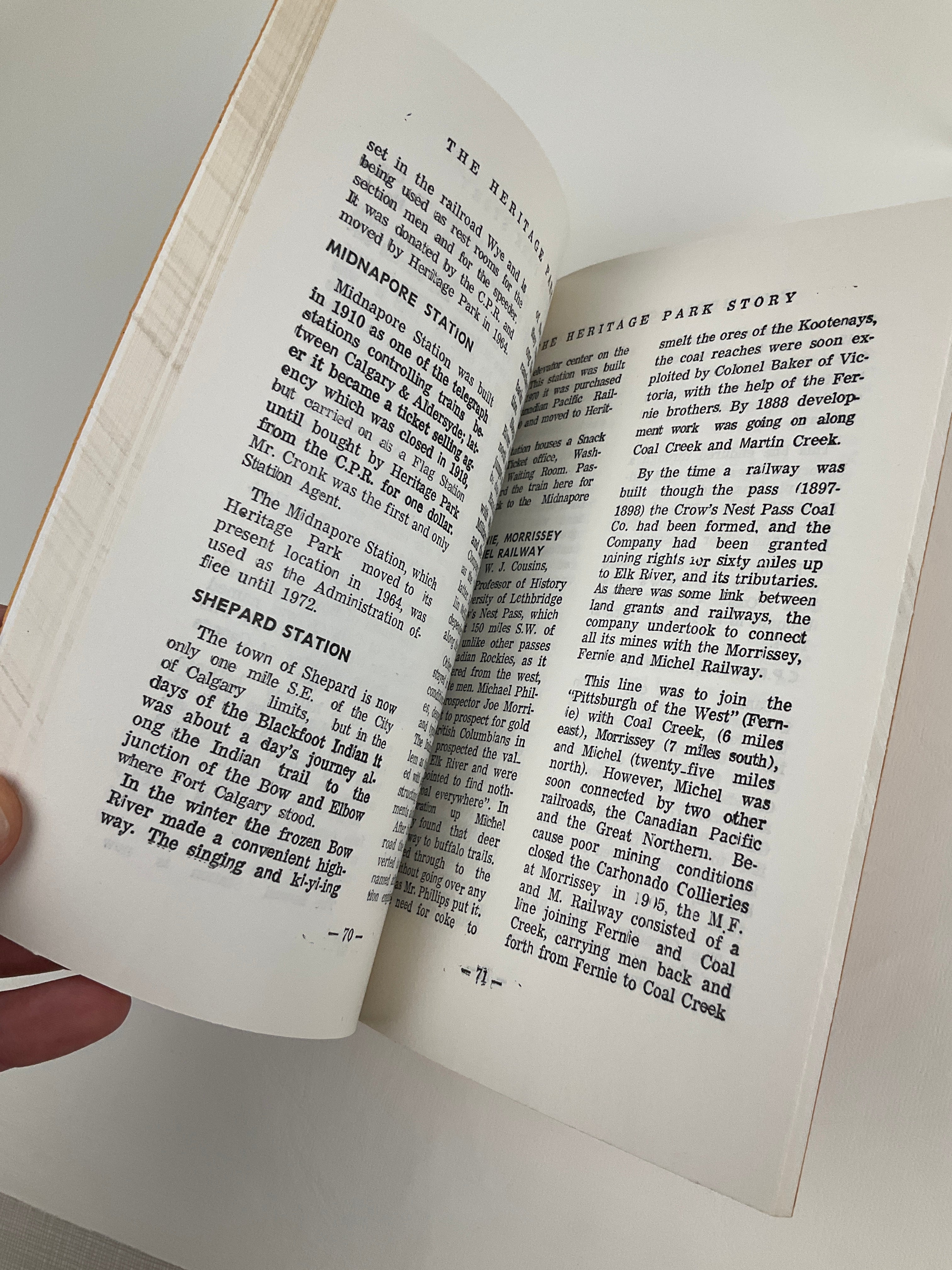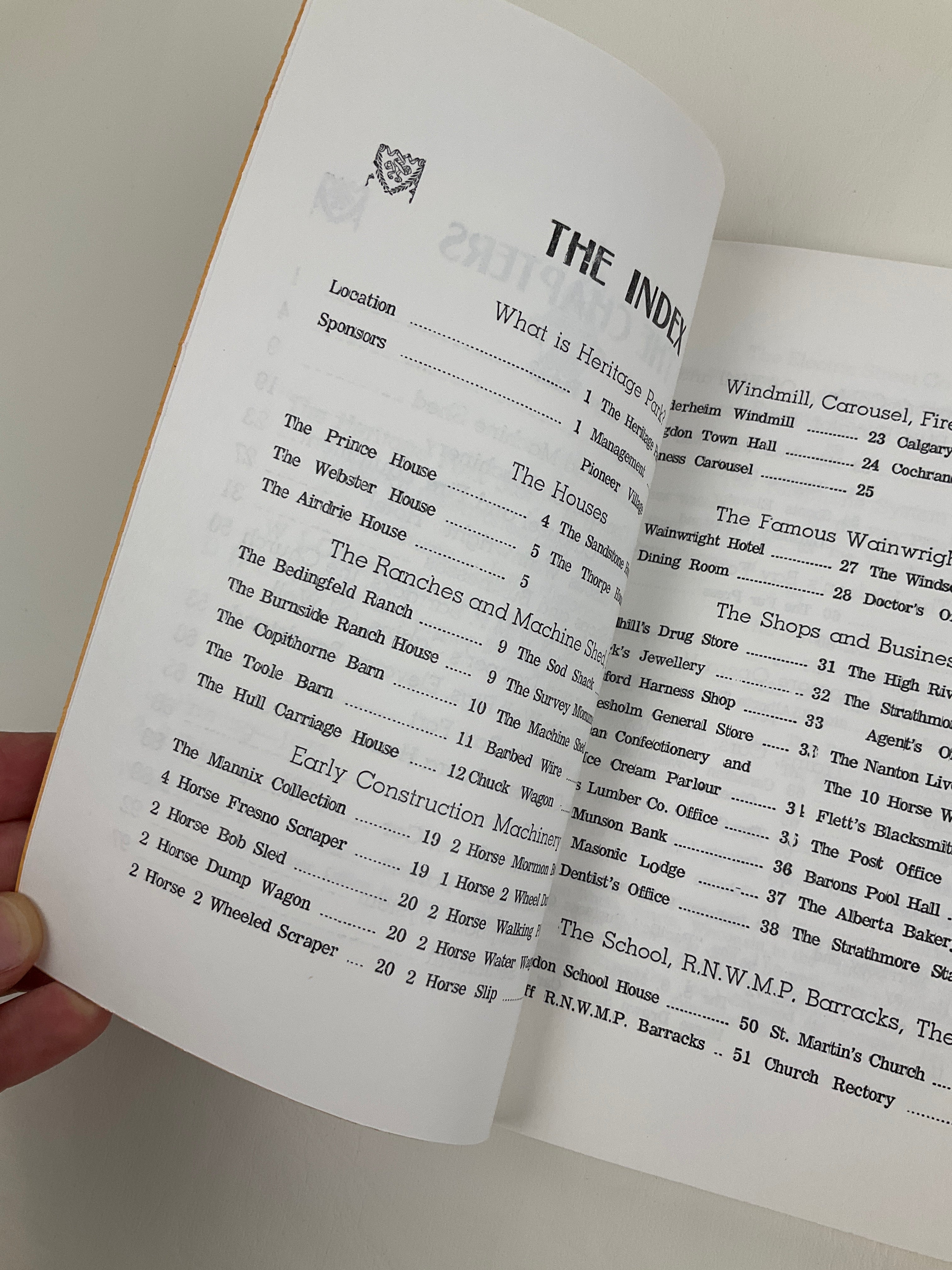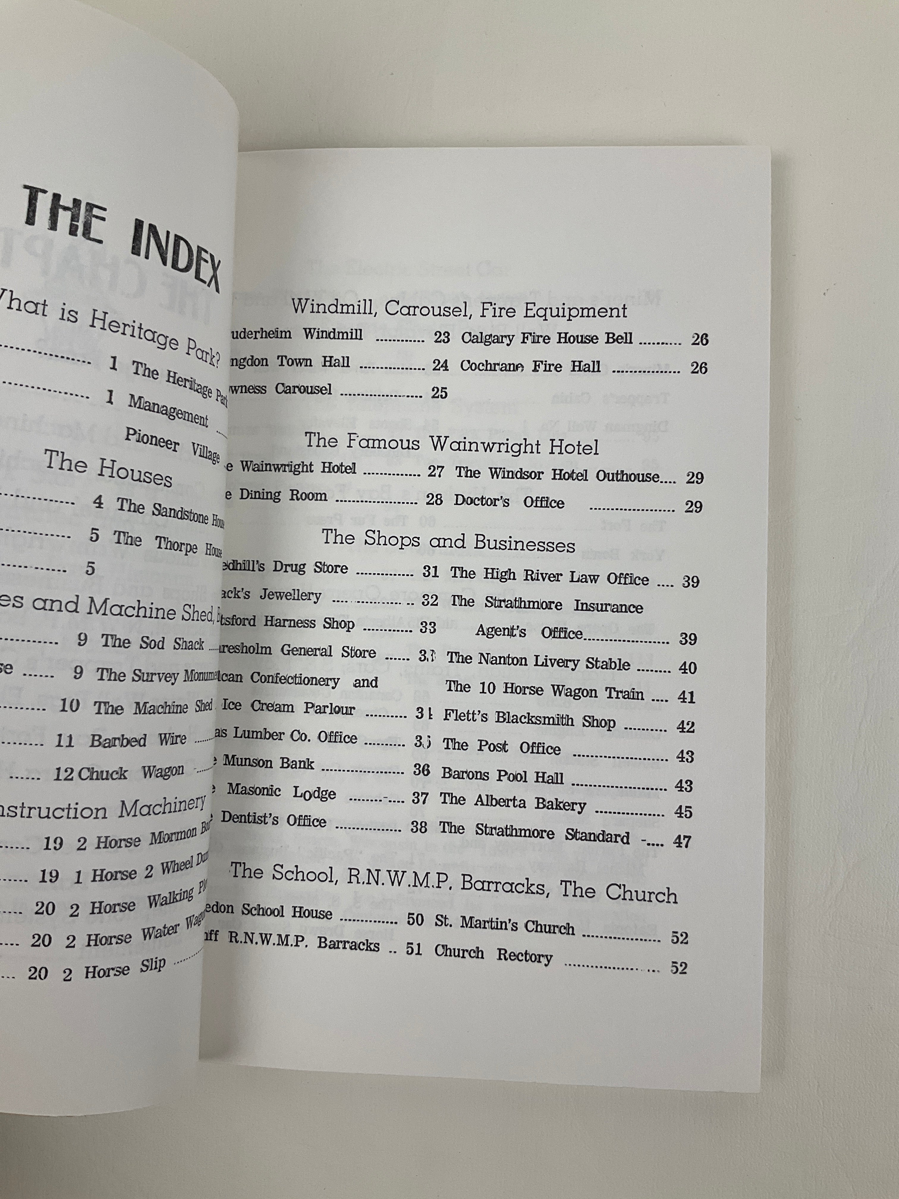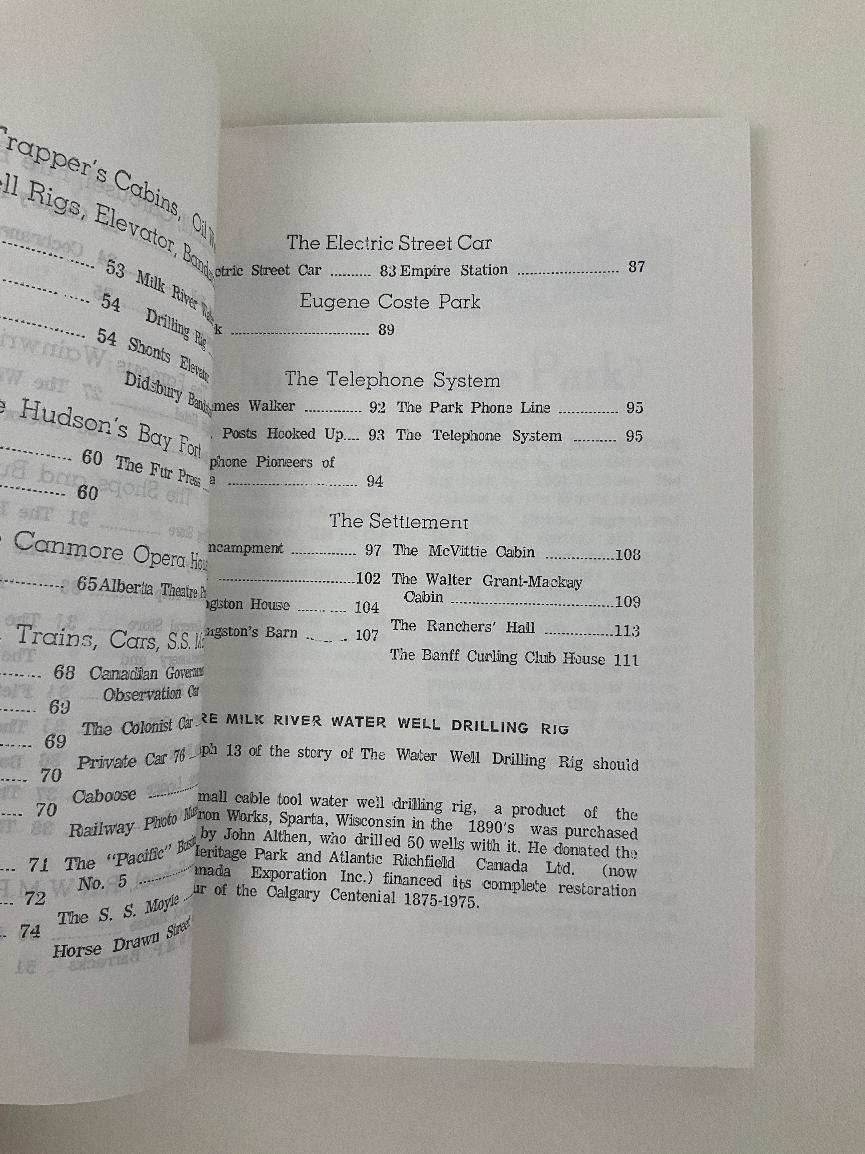 A short, illustrated pamphlet produced by the Heritage Park Historical Village (then a newly‑opened living‑history museum). Its purpose was to introduce visitors—especially school groups and families—to the park’s concept and to give a narrative backdrop for the historic settlement that had been recreated on the 127‑acre site