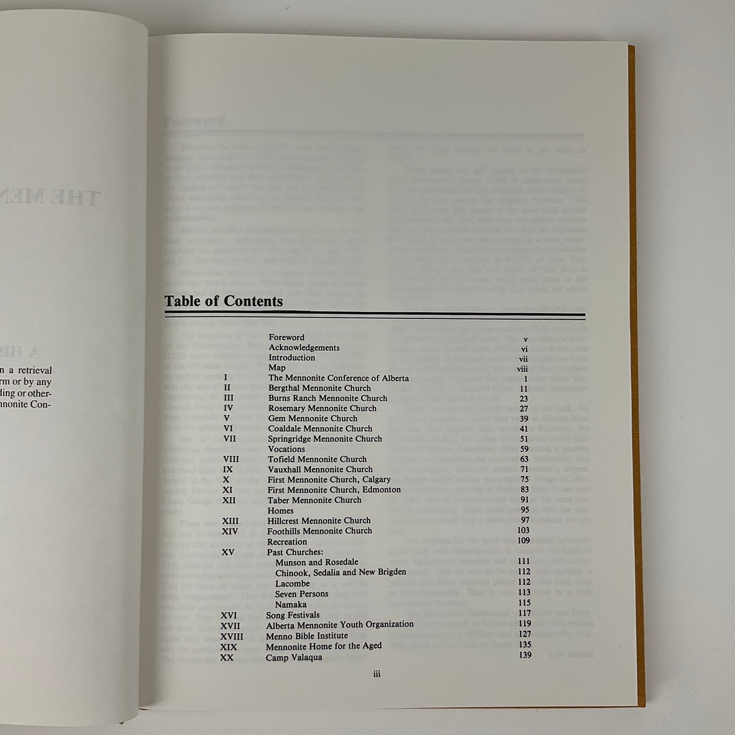 In 1978, the Mennonite Conference of Alberta asked C. L. Dick (of Medicine Hat; an eventual Canadian Mennonite Bible College board member) to prepare a history of the Conference’s congregations and organizations by combining material submitted by individuals and churches with his own research. The book begins with a brief Conference history, followed by chapters detailing nearly 20 churches (many in central and southern Alberta, some closed). Some congregational histories contain lists of ministers, pictures of church buildings and participants, and financial/demographic data. Dick also includes material on Mennonite schools, senior’s homes, and youth organizations, as well as pockets of information about Mennonite immigration and settlement in Alberta.